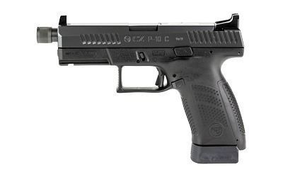 CZ, P-10 C Suppressor-Ready, Striker Fired, Semi-automatic, Polymer Frame Pistol, Compact, 9MM, 4.61" Barrel, Threaded Barrel - 1/2X28, Nitride Slide Finish, Black, 3 Interchangeable Backstraps, High Fixed Night Sights, Integrated Trigger Safety, 17 Rounds, Reversible Magazine Catch