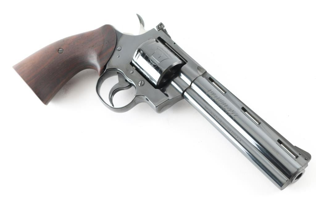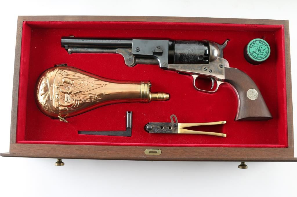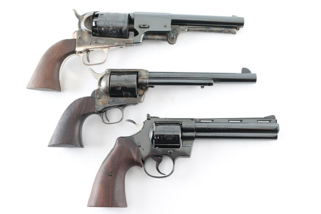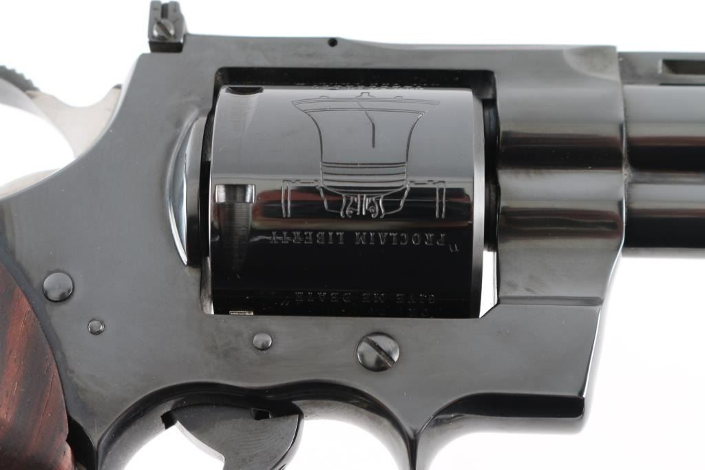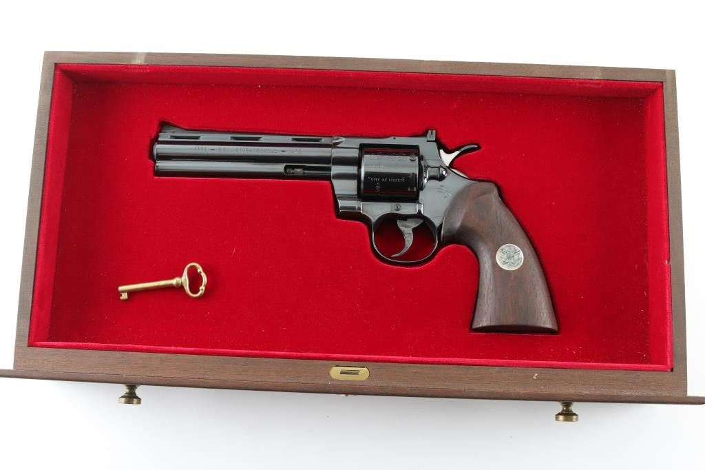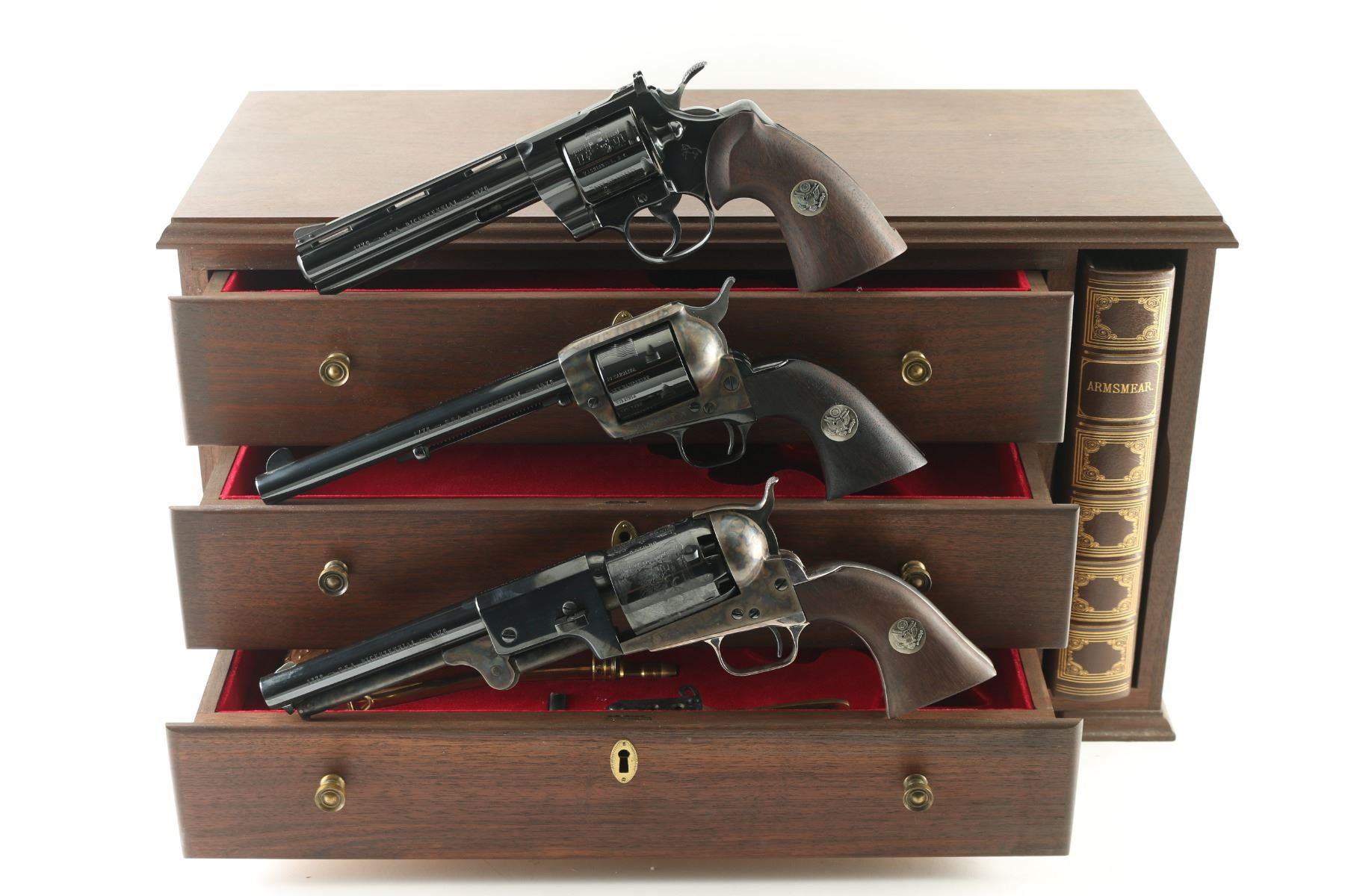 1) Colt Python .357 Mag SN: 0270PY 2) Colt Single Action Army .45 LC SN: 0270PM 3) Colt 3rd Model Dragoon .44 Cal SN: 0270DG This three gun set comes in a large wooden three drawer locking presentation case, each gun in a fitted red velvet drawer with its own key, and a copy of the book "Armsmear: The Home, The Arm, And The Armory of Samuel Colt. A Memorial" (by Henry Barnard) in a side compartment. The Python is royal blue, 6" barrel with full underlug & adjustable sights, smooth walnut grips with a single "Great Seal of the United States" medallion in the left panel, "1776 - USA BICENTENNIAL - 1976" engraved on left side of the barrel, and cylinder scenes of Statue of Liberty, Liberty Bell, and US Capitol. SAA is blued/case colored, with same type grip and barrel marking as the Python, 7.5" barrel, cylinder scene is two American flags and a list of the original 13 colonies. Dragoon is blued & case colored, nickel grip straps, same type grips and barrel marking, battle scene on cylinder, and includes powder flask, bullet mold, cap tin, nipple wrench in the drawer alongside the revolver. The set also includes the original matching Colt styrofoam and wood grained cardboard sleeve boxes. All revolvers are in excellent condition with hardly any sign of handling. Condition is NRA Excellent - like new *** Modern Firearm *** (Dragoon is "Antique")