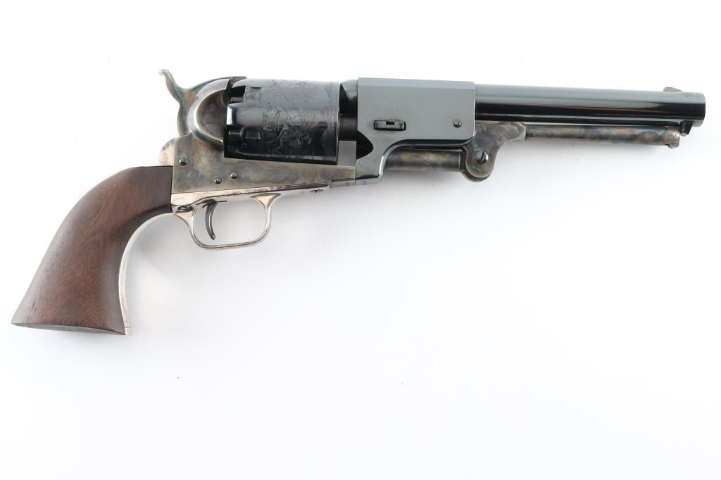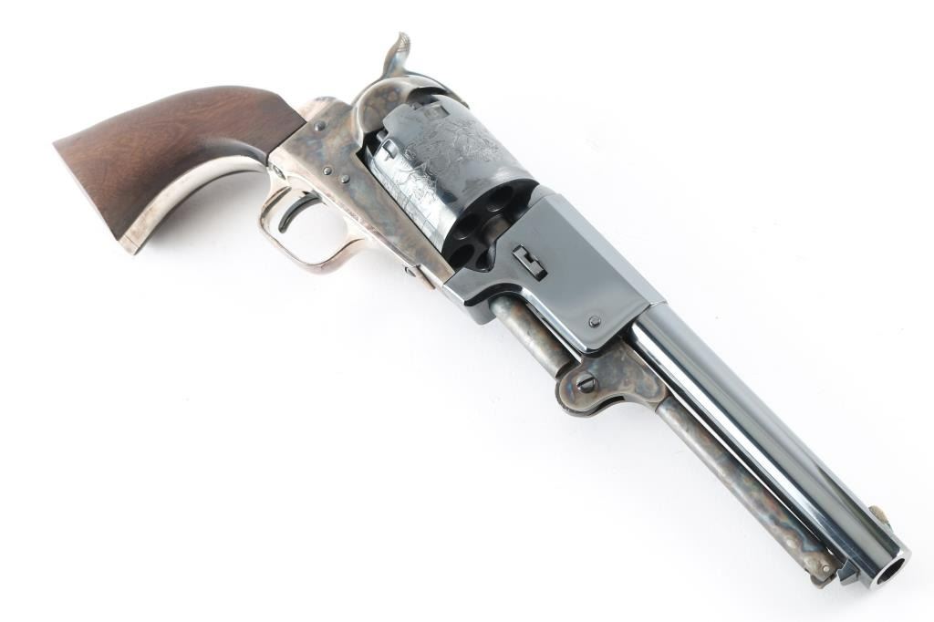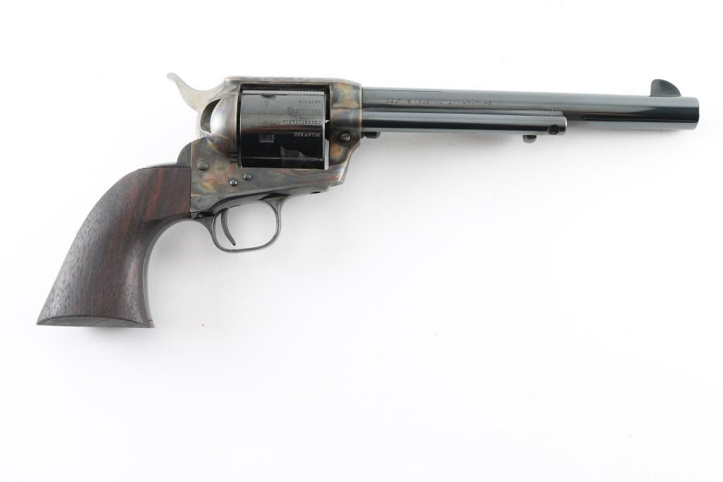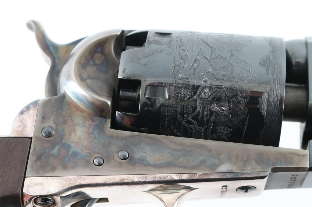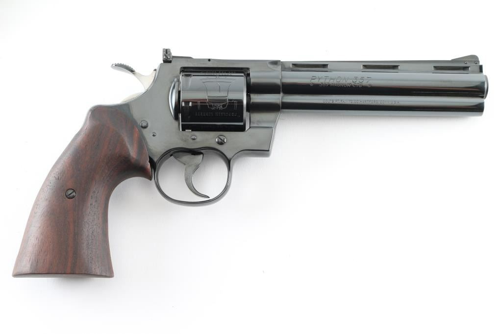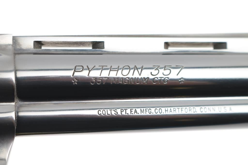 1) Colt Python .357 Mag SN: 0270PY 2) Colt Single Action Army .45 LC SN: 0270PM 3) Colt 3rd Model Dragoon .44 Cal SN: 0270DG This three gun set comes in a large wooden three drawer locking presentation case, each gun in a fitted red velvet drawer with its own key, and a copy of the book "Armsmear: The Home, The Arm, And The Armory of Samuel Colt. A Memorial" (by Henry Barnard) in a side compartment. The Python is royal blue, 6" barrel with full underlug & adjustable sights, smooth walnut grips with a single "Great Seal of the United States" medallion in the left panel, "1776 - USA BICENTENNIAL - 1976" engraved on left side of the barrel, and cylinder scenes of Statue of Liberty, Liberty Bell, and US Capitol. SAA is blued/case colored, with same type grip and barrel marking as the Python, 7.5" barrel, cylinder scene is two American flags and a list of the original 13 colonies. Dragoon is blued & case colored, nickel grip straps, same type grips and barrel marking, battle scene on cylinder, and includes powder flask, bullet mold, cap tin, nipple wrench in the drawer alongside the revolver. The set also includes the original matching Colt styrofoam and wood grained cardboard sleeve boxes. All revolvers are in excellent condition with hardly any sign of handling. Condition is NRA Excellent - like new *** Modern Firearm *** (Dragoon is "Antique")