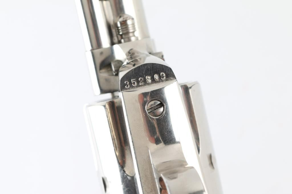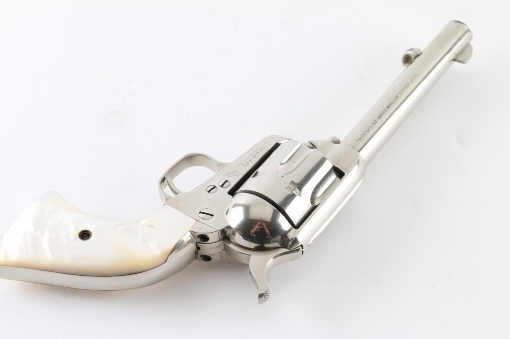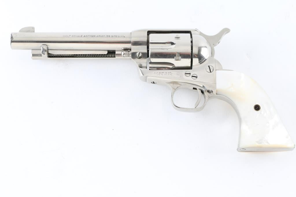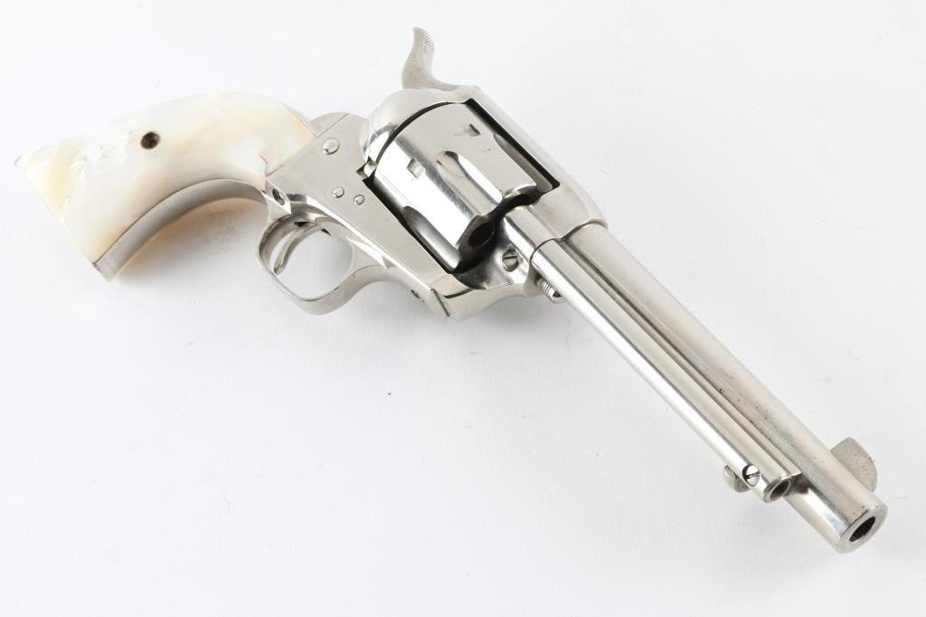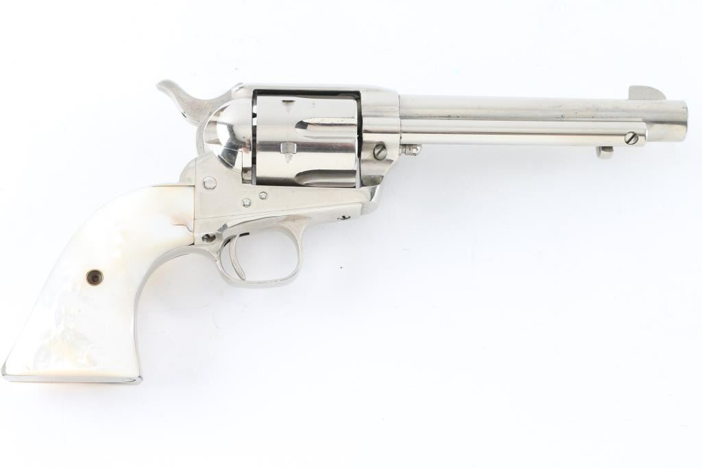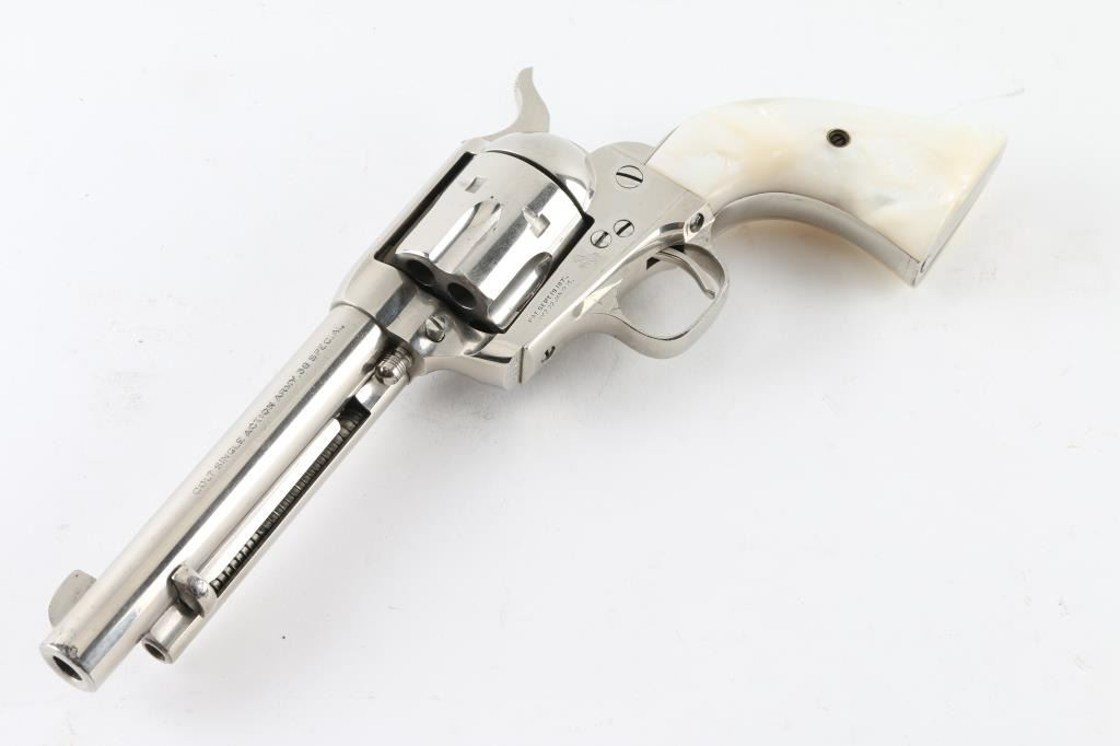 Pre-war First Gen Single action army revolver mfg 1929, 5.5 inch barrel, 38 special caliber, nickel finish , pearl grips #352809. The Colt retains 92-96% original factory nickel finish with only slight losses at muzzle. Very faint index line and unaltered "High Front Sight" sharp markings and full rampart. Colt stamp on frame. Period or factory pearl in almost fine condition with small chips at heel and minor aging but fine " Rainbow"hues. Interior shows just minor use with bright bore. Cylinder and interior number match on straps. A strong 9+ on 1-10 scale and absolutely collectors quality. C&R Firearm