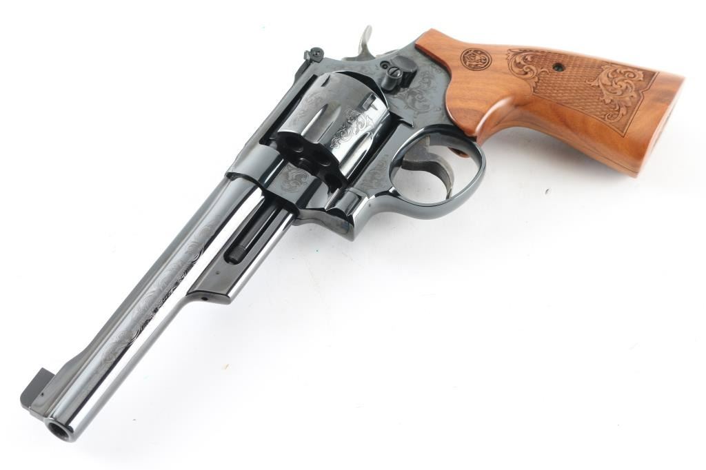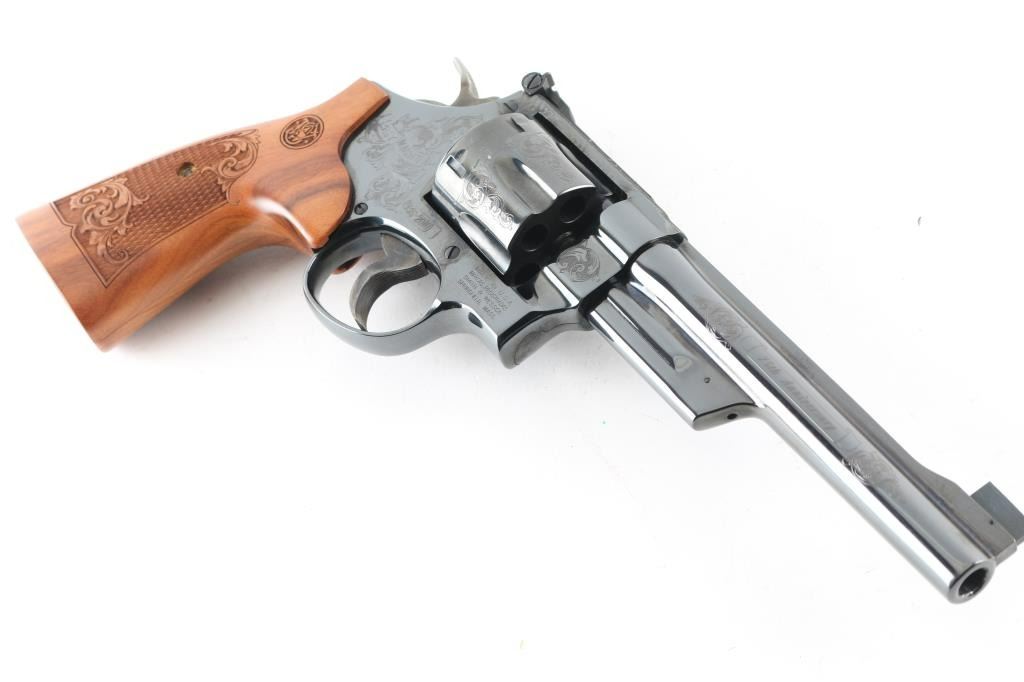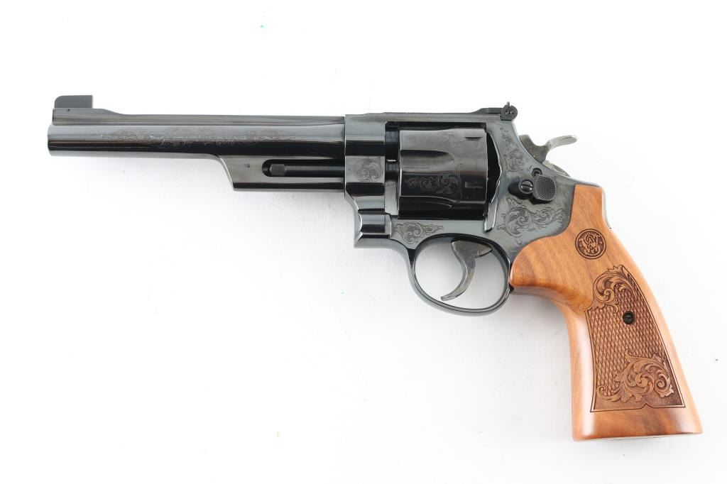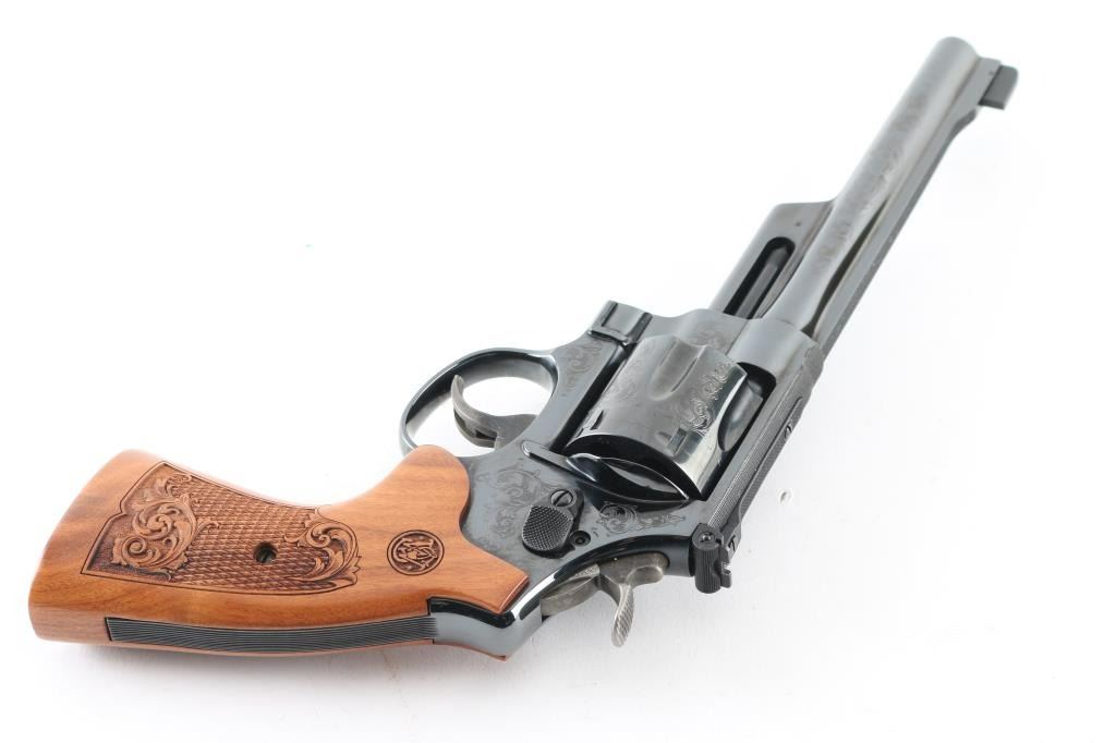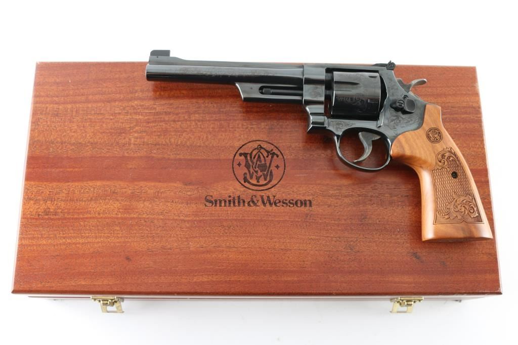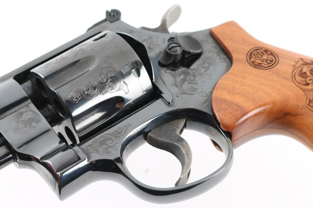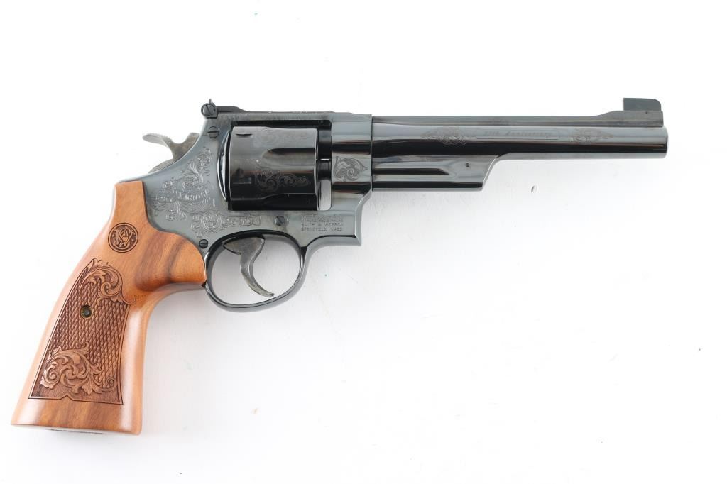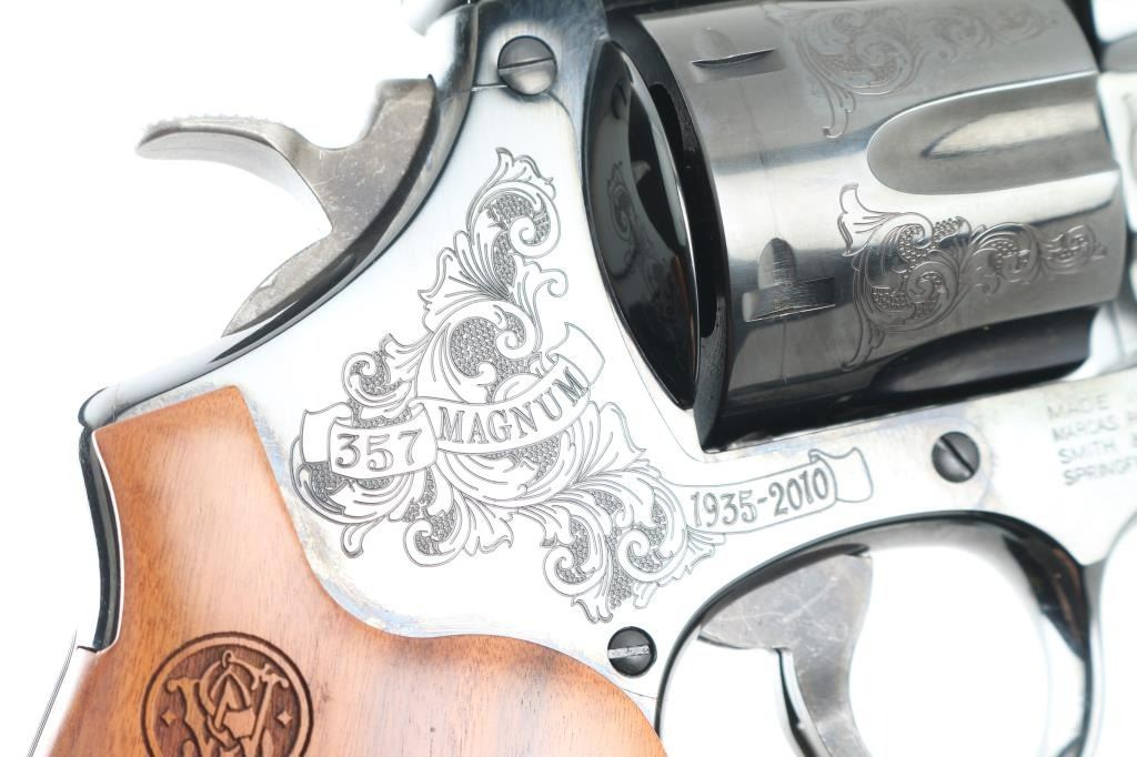 '75th Anniversary 357 Magnum" cased commemorative double action revolver manufactured circa 2010. Features high polish blued finish, 50% coverage of floral scroll engraving, checkered wood target style grips with engraved S&W logos, N frame, 6.5" barrel, adjustable sights (with Partridge type front sight), case colored trigger (.400" grooved) & hammer (.500" knurled). Bore and charge holes are excellent. Retains 98% blue with minor handling marks, minor drag line. Grips are excellent condition. Action is smooth, lock-up is good. Includes fitted walnut display case, with dark blue velvet lining. Condition is NRA Excellent *** Modern Firearm ***
