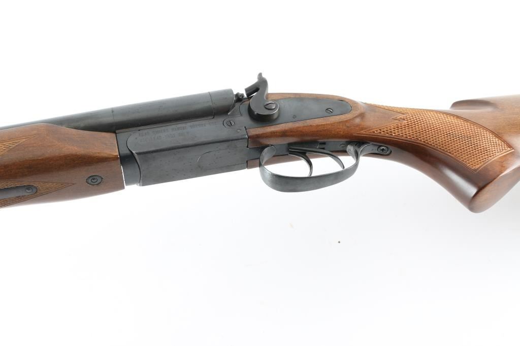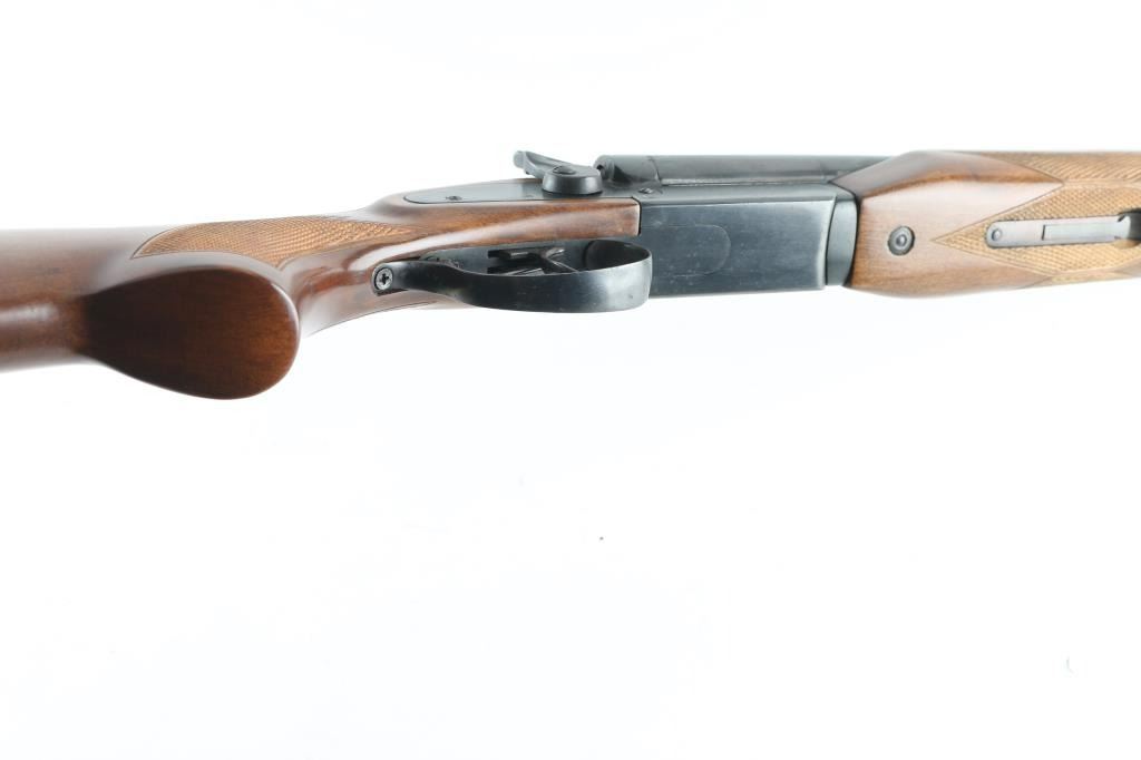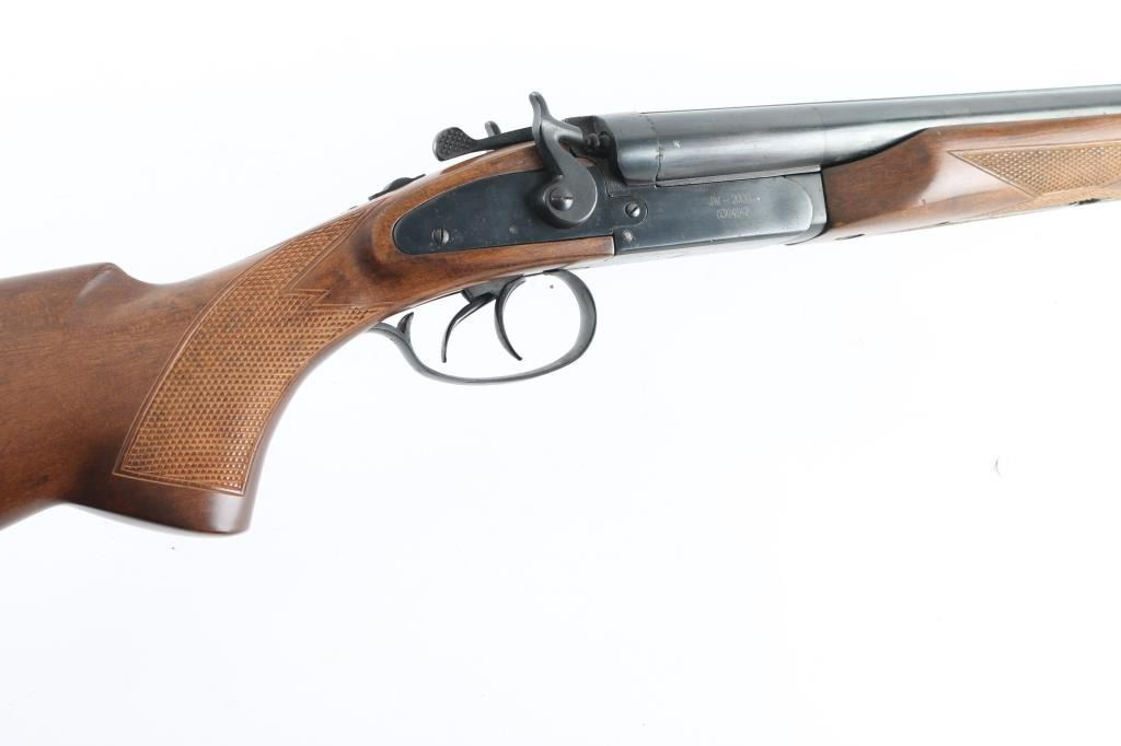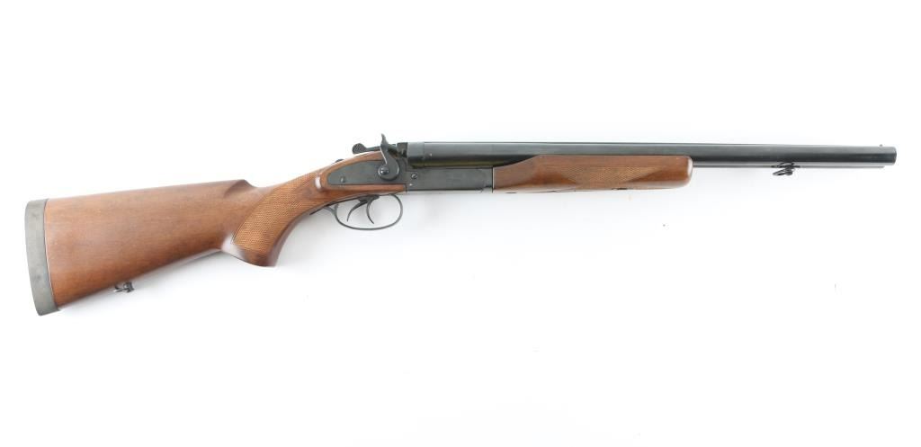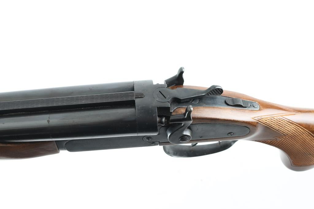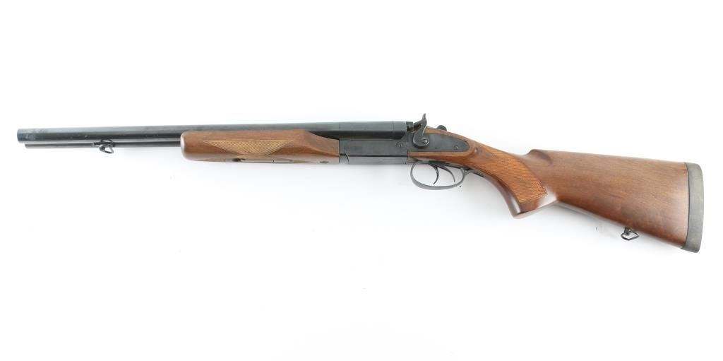 Chinese made copy of the classic coach gun. Accepts 2 3/4'. or 3" shells. Made by the Zhongzhou Machine Works.1" thick recoil pad, exposed hammers, sling swivels, hard wood stock, and forearm with checkering on forearm, and wrist, rubber recoil pad. double triggers. 20" barrels with raised sighting rib, brass bead. Bores are very good/bright. Barrels lock up tight. Action works well, wood is very good, blue is about 85% with some edge wear, handling loss, and some minor spots of rust/pitting. No Visible import markings. NRA condition-Good+ Modern Firearm.