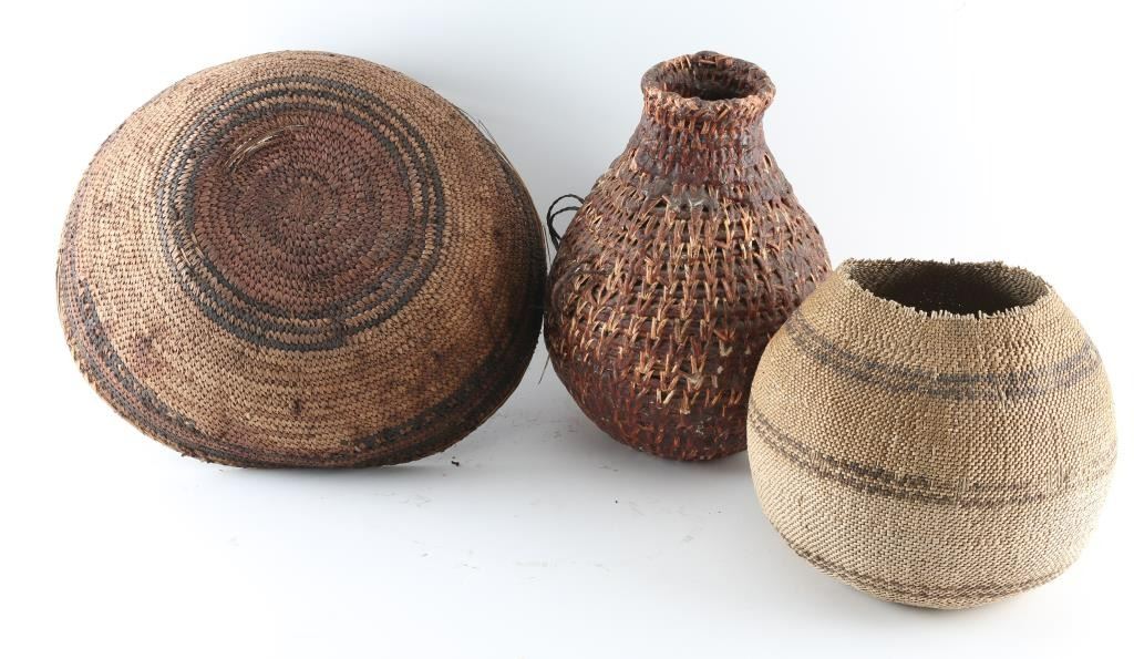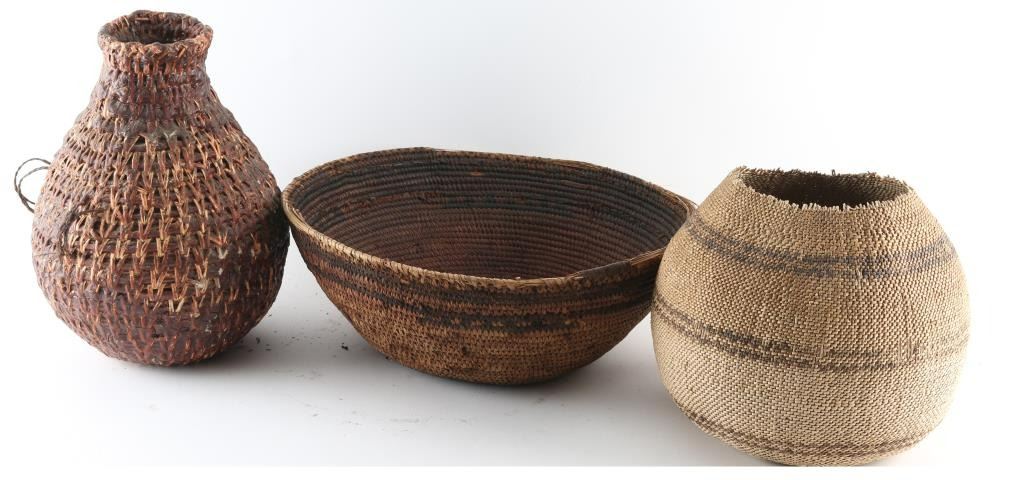 Including (1.) Apache pitched covered olla, measuring 12x9, (2.) California woven basket with stripe design, measuring 9x11 (3.) unknown tribe with heavy losses to rim measuring 13x5
