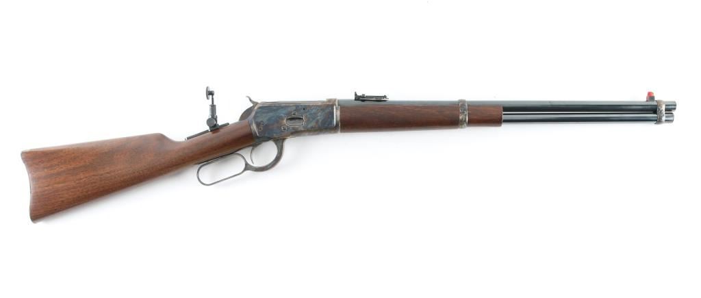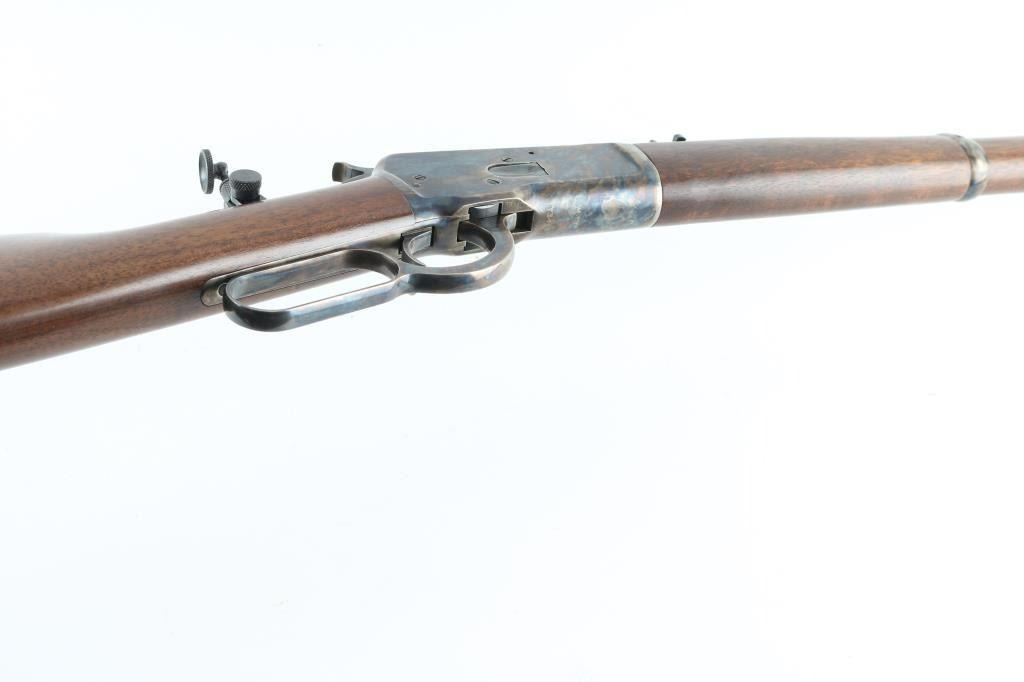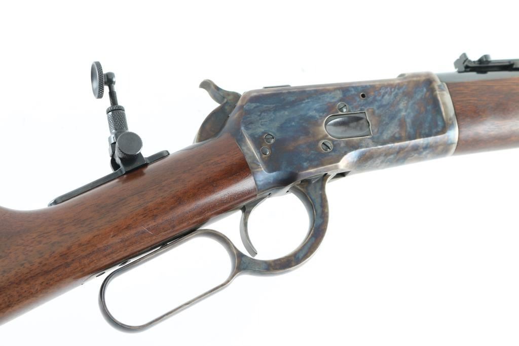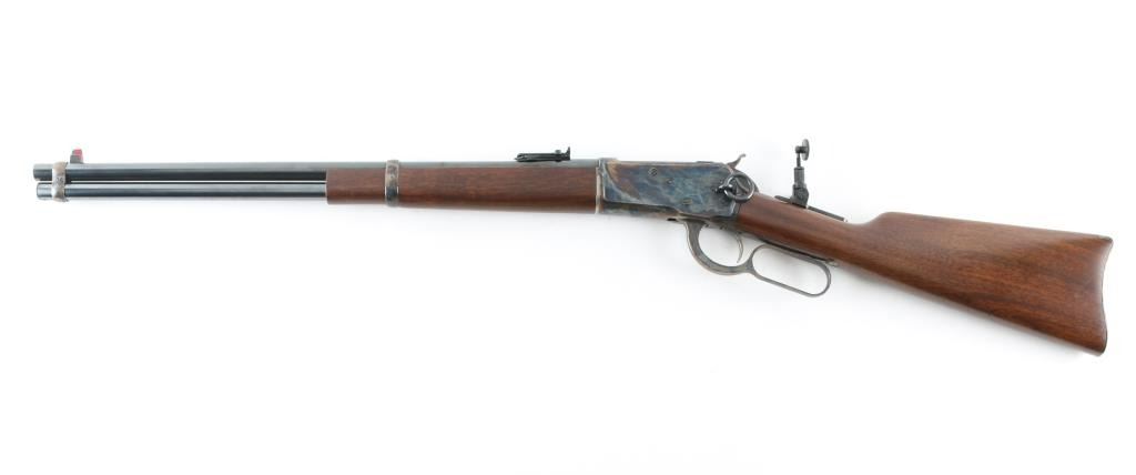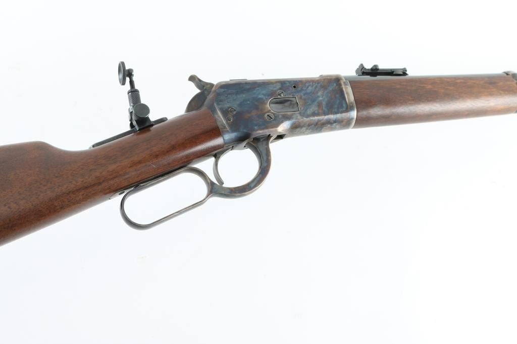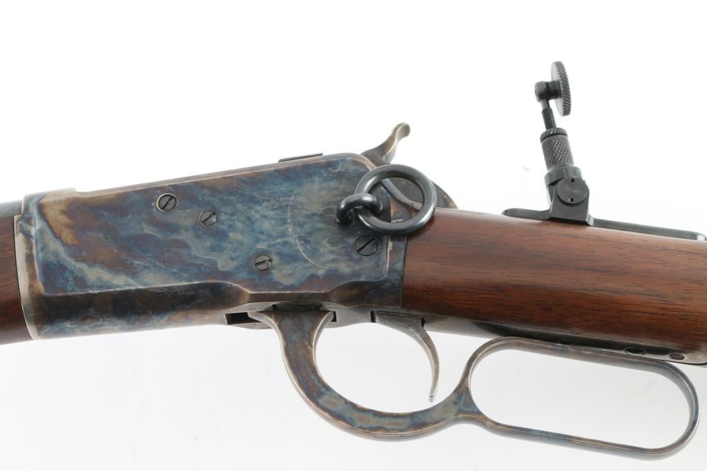 Italian made replica of the Winchester 1892 Saddle Ring Carbine. Features blued finish (case colored receiver, lever, bands, hammer, trigger), smooth walnut forend & straight gripped shoulder stock, 20" round barrel, full length magazine tube, blade front sight, folding ladder rear sight, saddle ring, steel buttplate, tang mounted folding peep sight. Rifle is almost like new with few handling marks, slight rubbing wear where saddle ring touches side of receiver, few small dents to butt, showing a deep black bluing and fiery case colors with rich swirling blues and tans. Front sight is painted red, appears to be nail polish. Condition is Excellent *** Modern Firearm ***