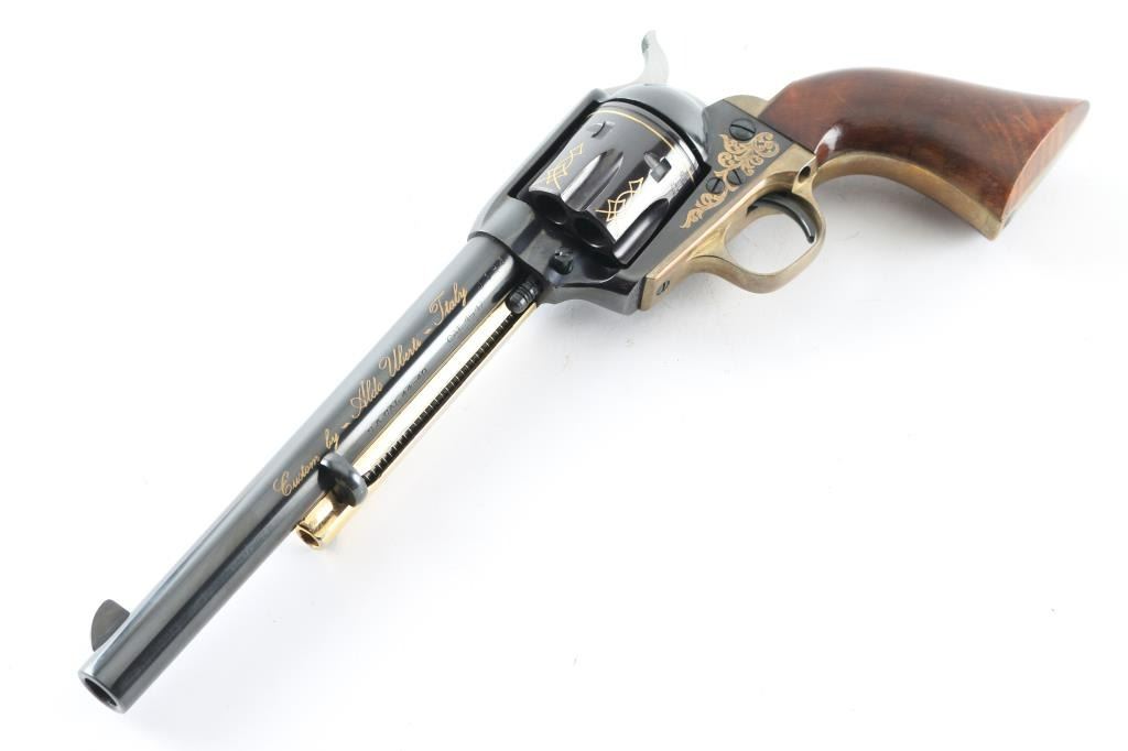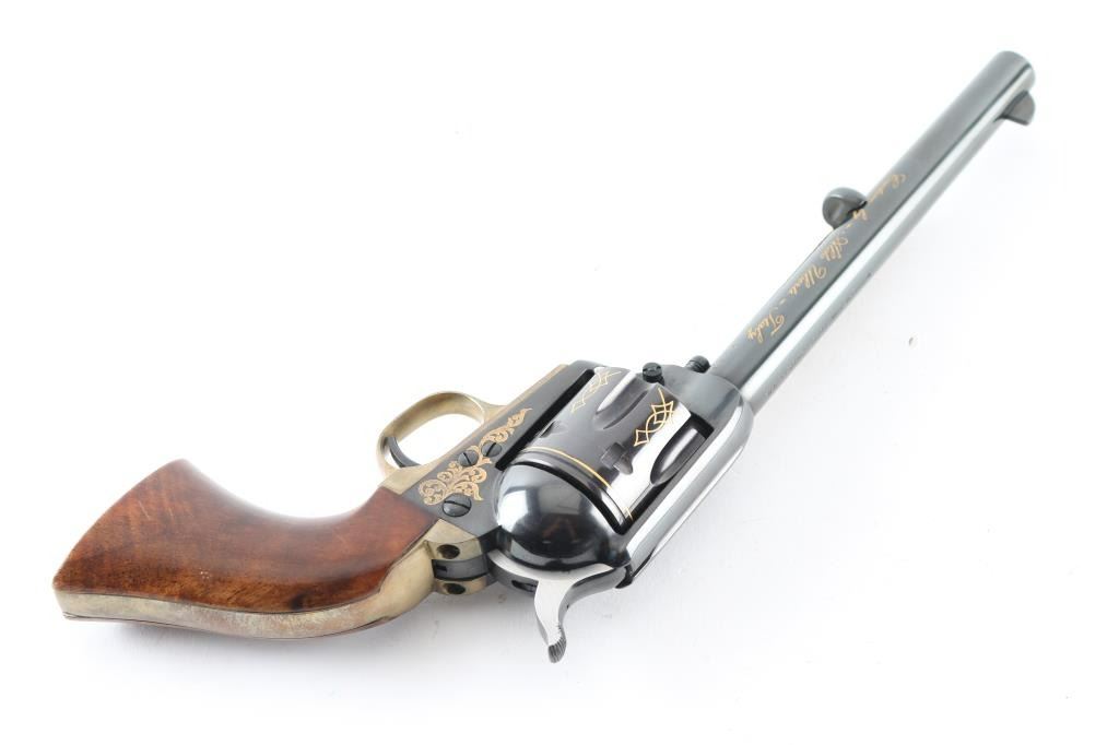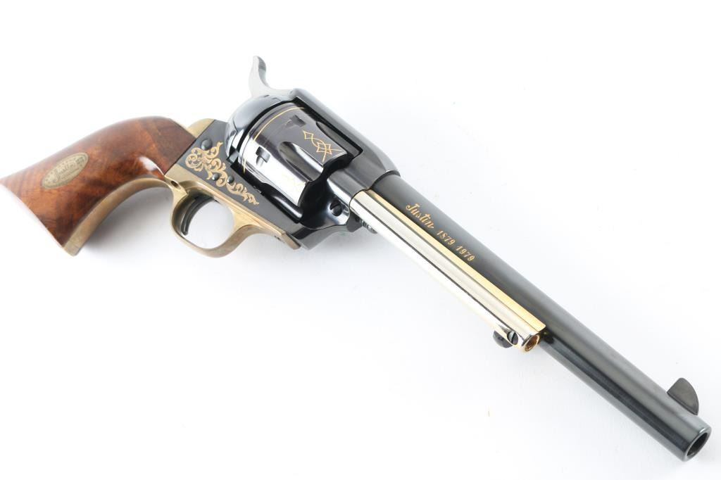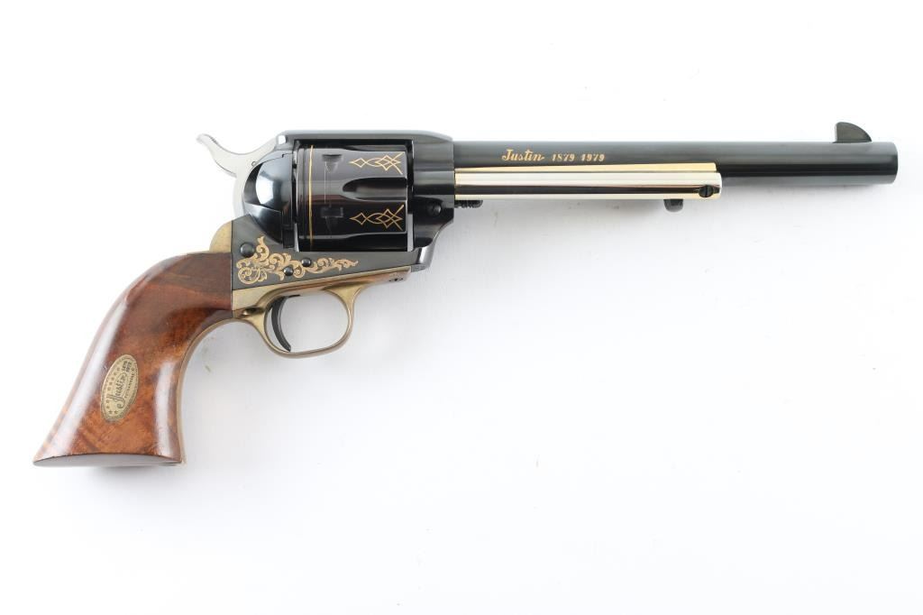 Made in Italy this is a single action 6 shot revolver chambered for .44-40 cartridges. It was made to commemorate Justin Boots 100th Anniversary, 1879-1979. It features a blued finish, gold plated ejector housing, brass trigger guard and backstrap, varnish finished walnut grips. Fixed blade front sight and integral rear sight. Decorated with gold tone engraving and lettering. Right side of grip with inlaid brass oval engraved for the Justin Centennial. Metal finish looks good with a tiny ding on the front sight and some of the gold plating is worn off of the ejector rod tube, and a faint drag line on the cylinder. Grips look good with minor signs of handling. Bore looks good, needs cleaned. Condition is NRA Good+ *Modern Firearm*