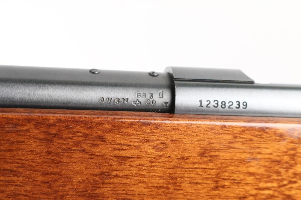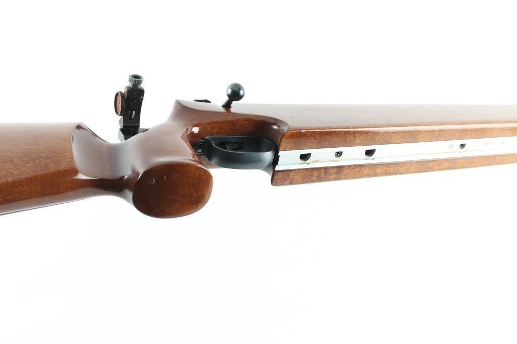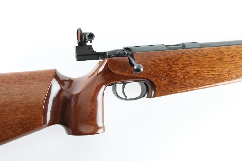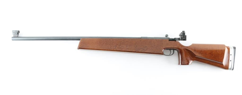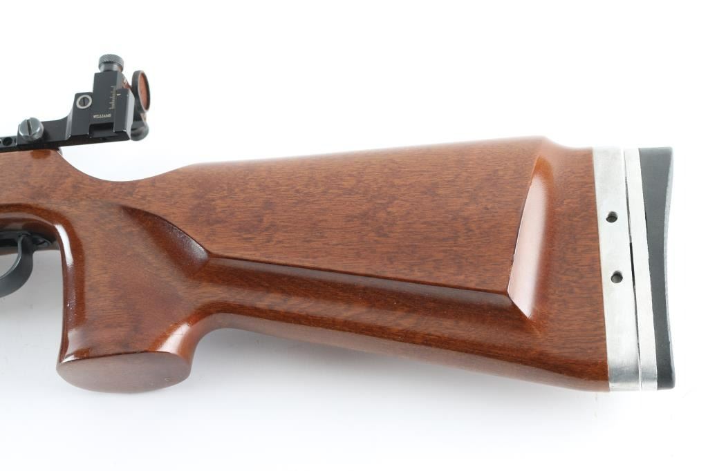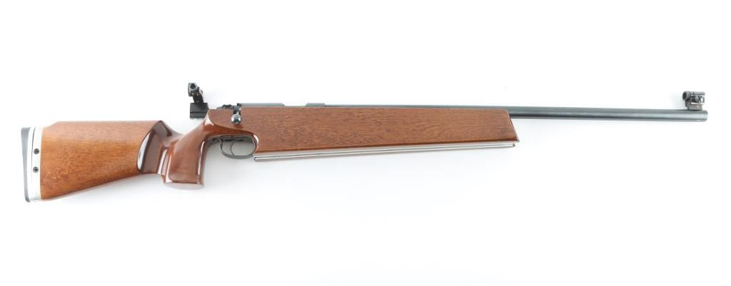 Single shot rimfire bolt action target rifle manufactured circa 1978. Features blued finish, walnut target stock, 25.5" medium contour barrel, globe front sight, Williams receiver mounted rear peep sight, manual safety. Stock has heavy flat bottomed & slab sided forend with T-rail inlet into bottom, adjustable butt with thin rubber pad, pistol grip shaped wrist with generous palm relief. bore is very good condition. Retains 95% finish with handling marks. Stock is excellent with few blemishes. Condition is NRA Excellent *** Modern Firearm ***