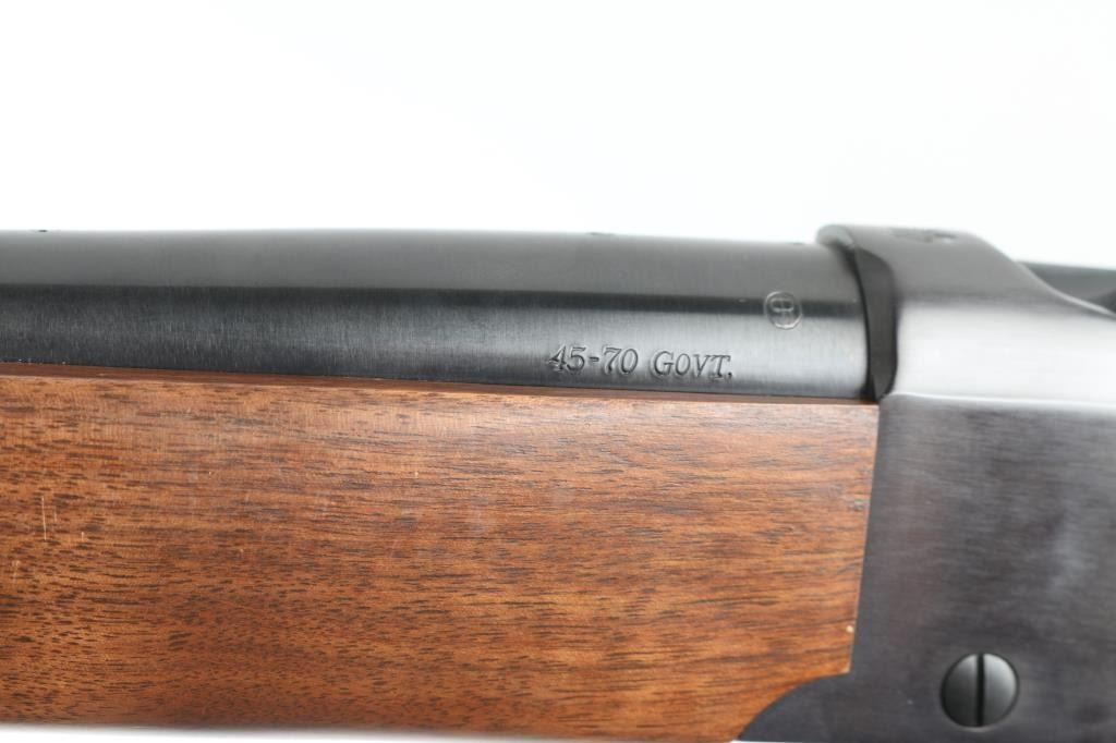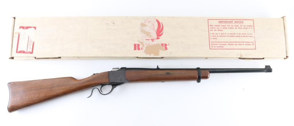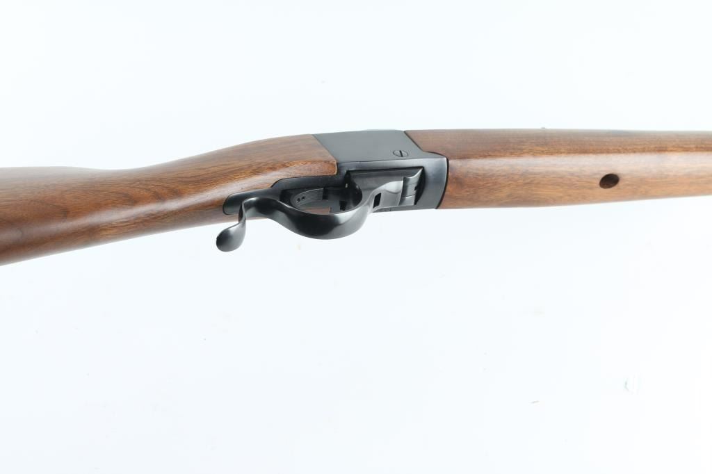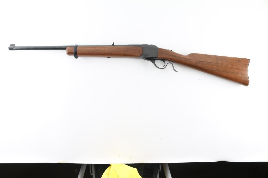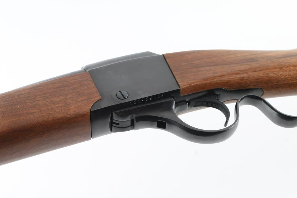 Rifle. Single-Shot. Falling block Action. based on the No 1 Rifle. Simpler one-piece breech lever. Produced 1973-1986. 22" contour barrel. Front post/bead, and adjustable folding notch rear sights. Tang safety. serrated adjustable trigger. Straight walnut stock and forearm. Action is smooth/tight. Bore is excellent/bright. Wood is excellent. Blued finish is excellent. Like new condition. Comes in original box with manual. NRA Condition-Excellent. Modern Firearm