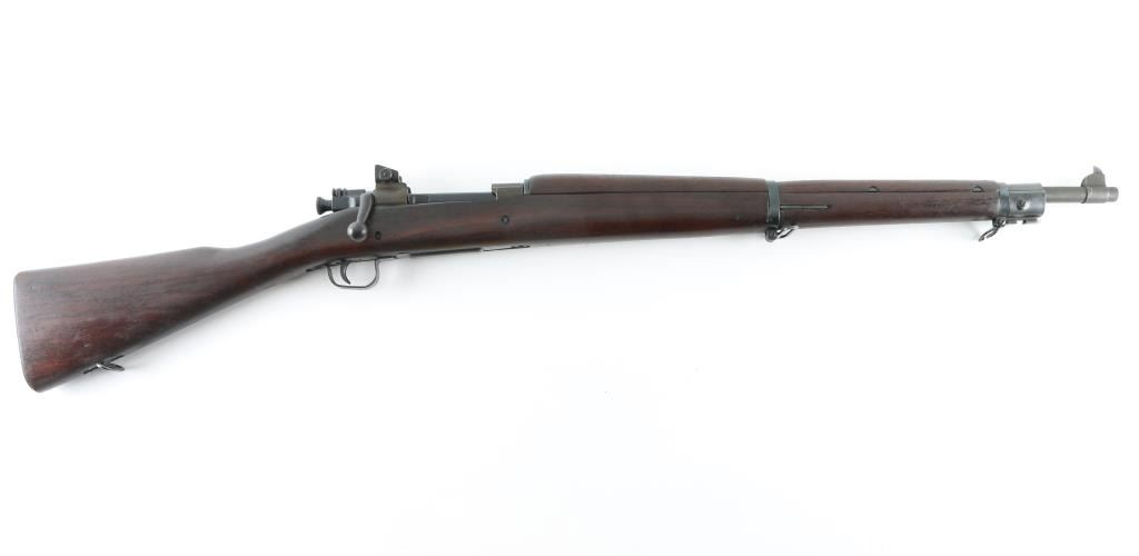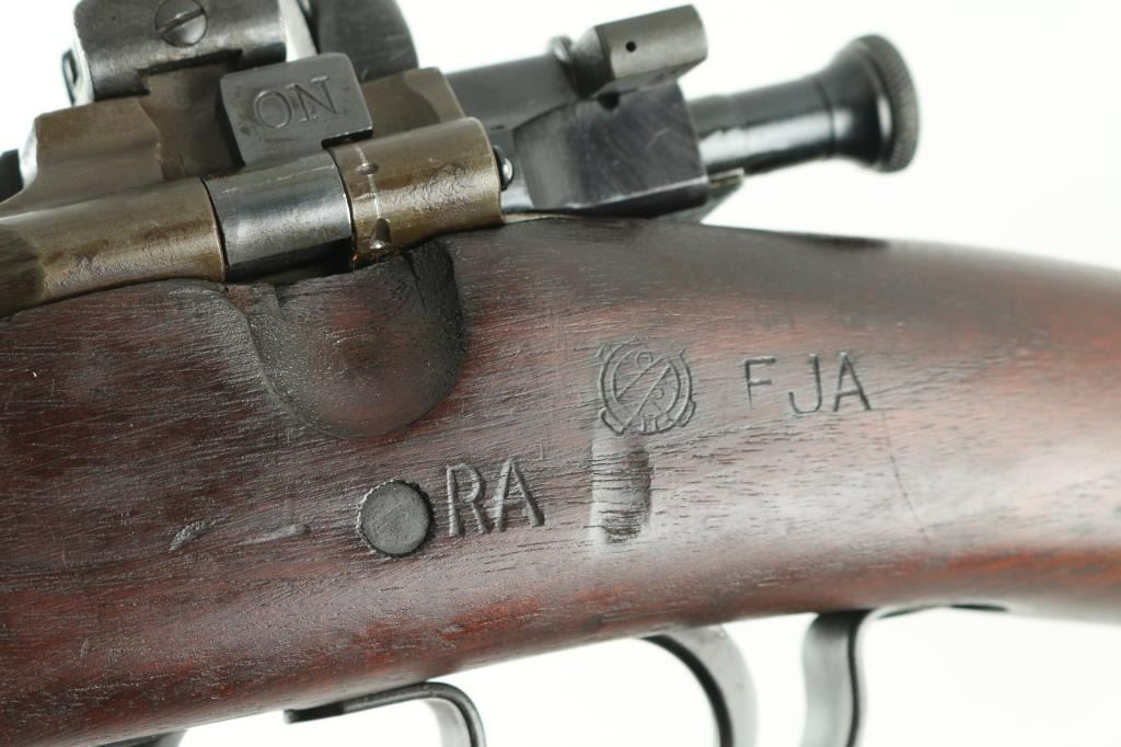 U.S WWII era military bolt action rifle manufactured circa 1943. Features blue/parkerized finish, walnut shoulder stock with straight wrist, walnut handguard, 24" barrel, blade front sight with protective cover, (Stamped "R") adjustable peep rear sight mounted to receiver, bent bolt handle, manual safety, magazine cut-off switch, sling swivels, stacking swivel, butt trap with hinged cover, (oiler/cleaning gear in buttstock) checkered flat steel buttplate. Bottom metal and bands are stamped. Bore is very good condition. Parkerized barrel, and receiver. Retains 95% finish with bare metal visible where moving parts rub. Stock is very good condition, varnish added, handling marks throughout. Barrel marked "RA / (flaming bomb) / 12-43". Stock markings include "FJA" in box, "P" in circle. "RA", and Ordnance stamp. Action is crisp/tight. Bored is very good/bright. NRA Condition-Very Good. C&R Firearm.