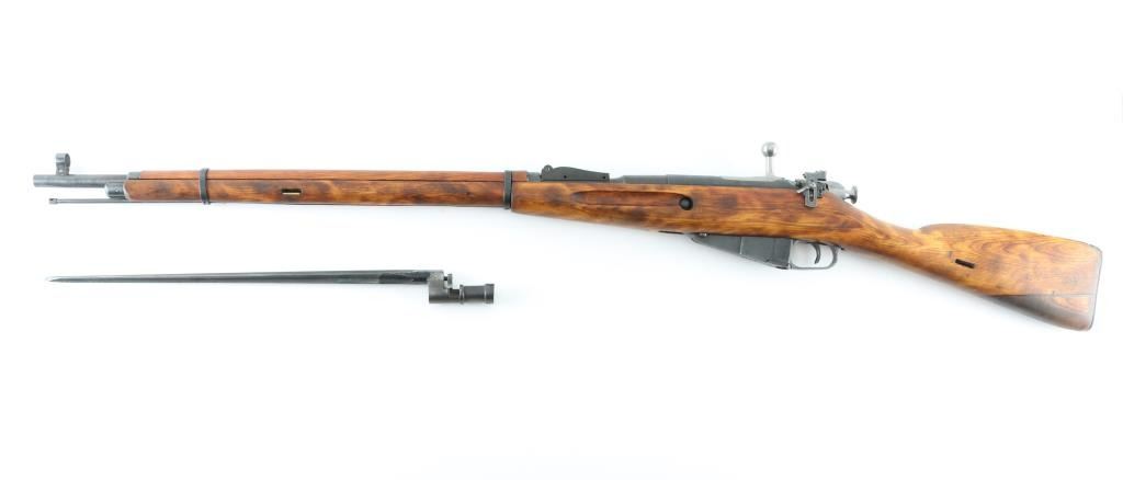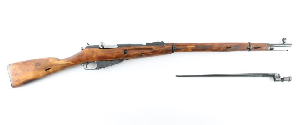 SN: M94621 Rifle. Bolt-Action. Produced 1891-1953. Russian Military issue. Mosin-Nagant. WW2 dated 1943. Izhevsk arsenal, imported by TG. Knoxville (Underside of barrel) Fed from a non detachable 5-rd magazine. 29" barrel with hooded front post, rear sights removed, and mounted with a Lyman peep sight.. Matched original serial numbers. Bore appears good.. Action is smooth/tight. Blued metal finish is about 80% with edge wear, scratches, and handling wear. Wood stock/handguard is very good with some scratches/dings. Small cartouches present. Includes a cruciform bayonet. NRA Condition-Good. C&R Firearm