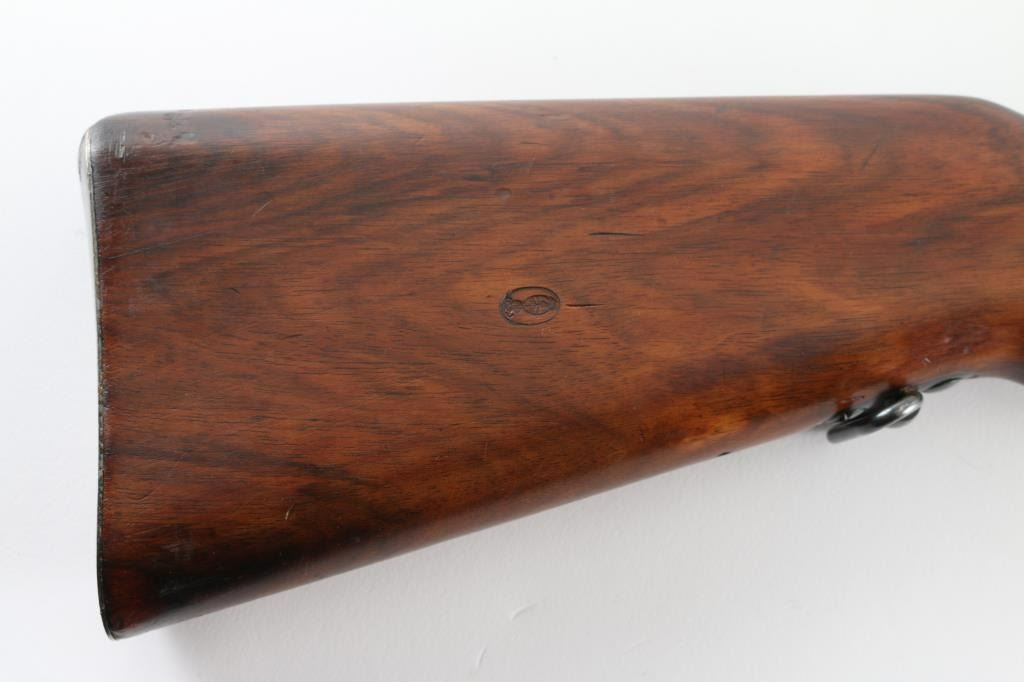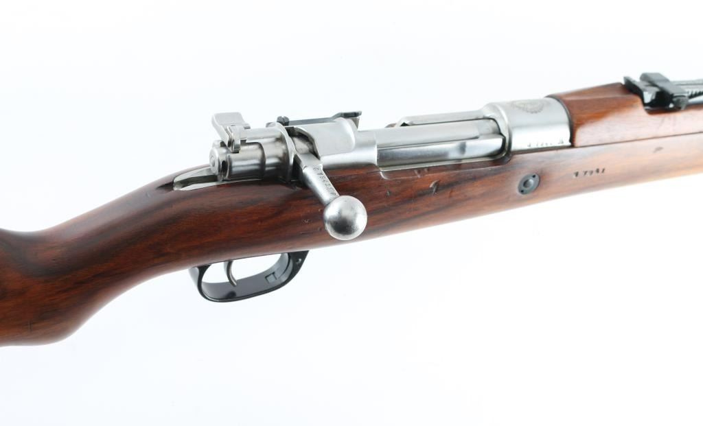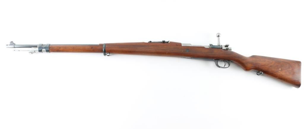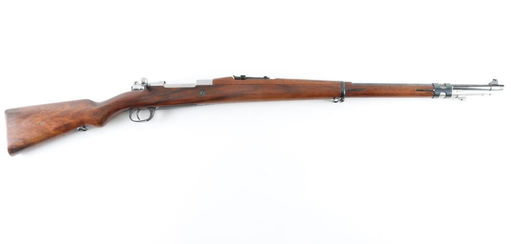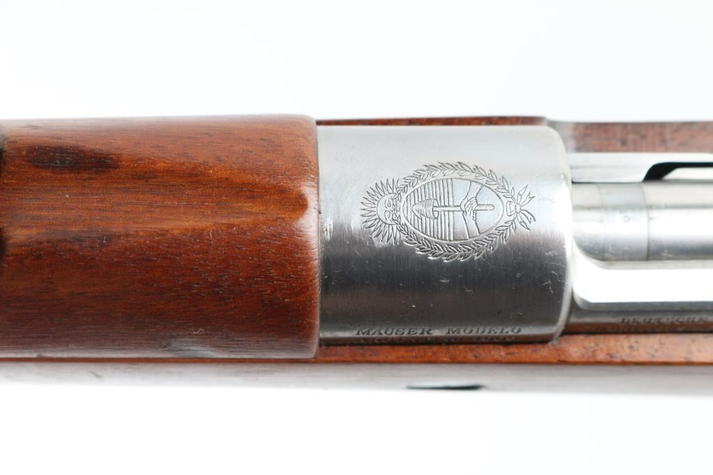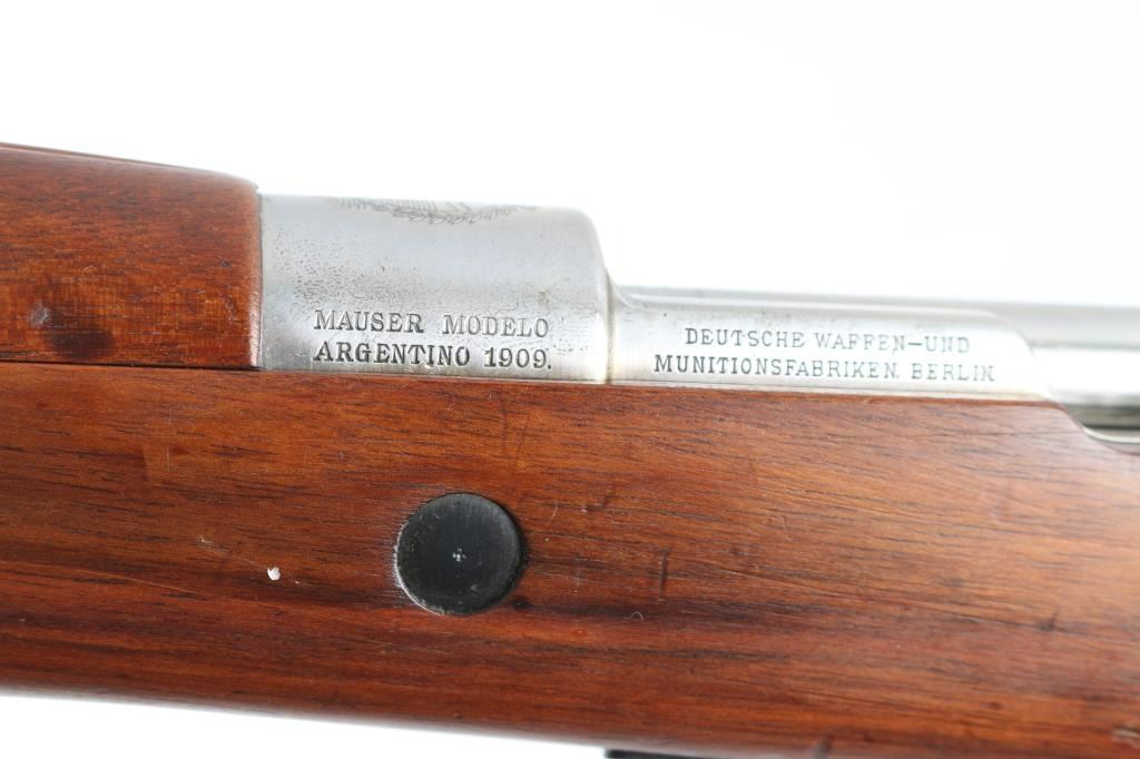Rifle. Bolt-Action. Argentinean military contract rifle, manufactured by DWM in Germany. 7.65x53mm Mauser. Argentinean crest on receiver ring with "Mauser Modelo Argentino 1909". DWM, Berlin markings on rail. 29" barrel, straight bolt handle, military sights, sling swivels, bayonet lug with adapter for M91 bayonet, hinged floorplate, cleaning rod under barrel. Matched serial numbers on receiver, bolt, triggerguard, and stock Cleaning rod mismatched. Bore appears excellent/bright.. Retains 95% blued finish. Shiny Nitre blue on bolt release, rear sights. Receiver, buttplate, bayonet lug and bolt are polished. Wood is in very good condition with few observed small dents, scratches, and handling marks. Small cartouche on right stock. Action is crisp/tight. NRA Condition-Very Good+. C&R firearm.