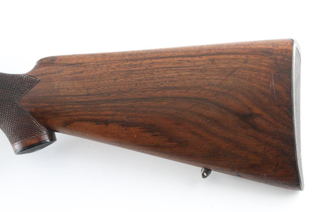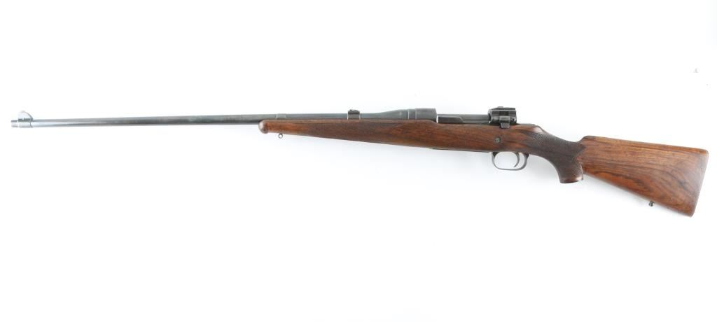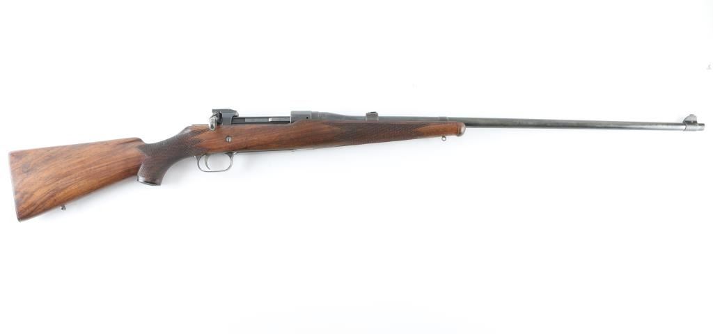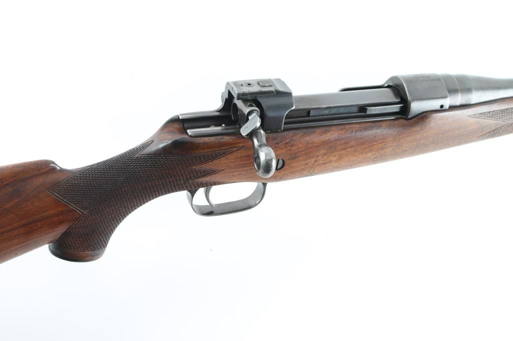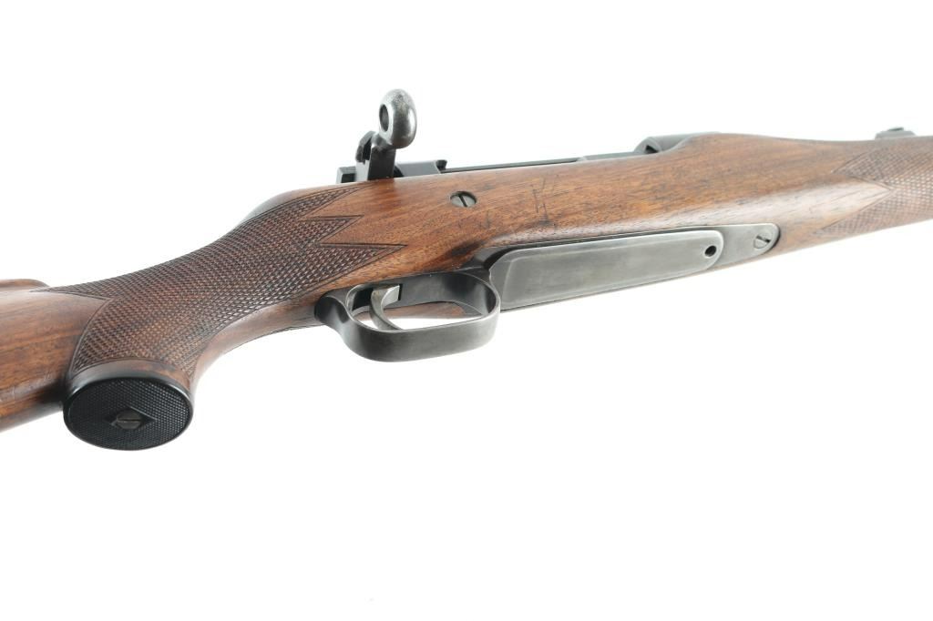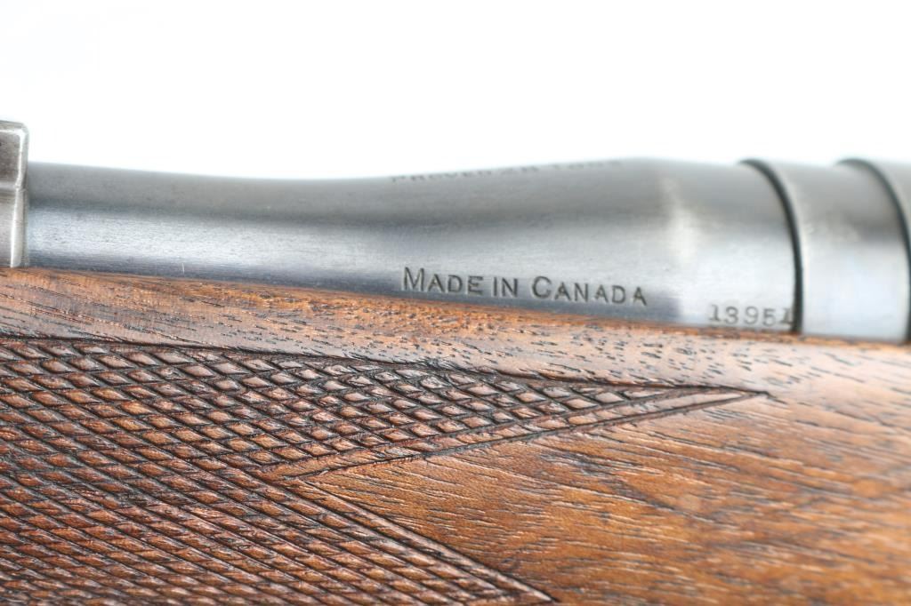 Canadian sporting rifle features straight pull bolt action, blued finish, checkered walnut stock with schnabel forend, checkered steel buttplate, approx 28" barrel, blade front sight, folding rear sight, manual safety. Forward eyelet for sling hook under forend, rear swivel stud under butt. Bore is good to very good, bright with some light frosting. Retains 60% finish with scratches & scuffs, edge losses, thinning to gray in many places. Wood is good or better, with scratches and dents. Checkering is deep and even. Condition is NRA Good++ *** C&R Firearm ***