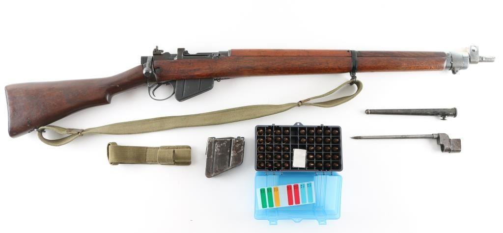 WWII era New Zealand military magazine fed bolt action service rifle chambered in .303 British, manufactured in Canada circa 1943. Features a blued finish, 25.2" barrel with integral bayonet lugs, shrouded patridge front sight, receiver mounted flip-up “L” dual aperture rear sight marked for 300 & 600 yards, two barrel bands, serrated trigger, detachable 10 round magazine, manual safety on the left side of the receiver, sling swivels, integral charge loading guide cuts in the receiver, grooved full-length wood handguard, smooth full-length forend and straight grip shoulder stock with metal trapdoor buttplate. Unmarked matte black magazine. British proofs behind the triggerguard, including the "broad arrow” and the left side of the receiver is marked “No 4 Mk I*/LONG BRANCH/1943”. Rifle retains approximately 60% of its blued finish showing scattered wear/thinning and a small amount of scattered pitting on the receiver/bolt. Action is smooth, the two land bore appears good. The wood stocks are good with many blemishes. Someone has spray painted the front sight/barrel in white (will clean off). Also includes approx 40 rds ammo in plastic box, sling, spike bayonet with scabbard, spare magazine. Condition is NRA Good. C&R Firearm.