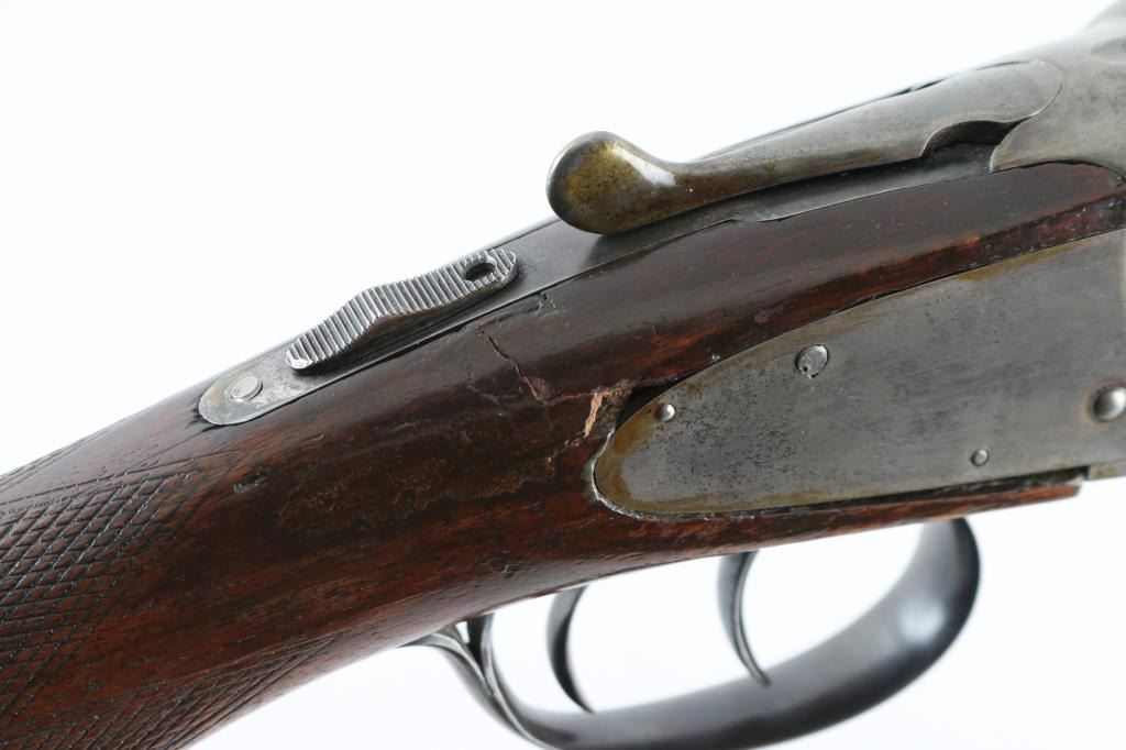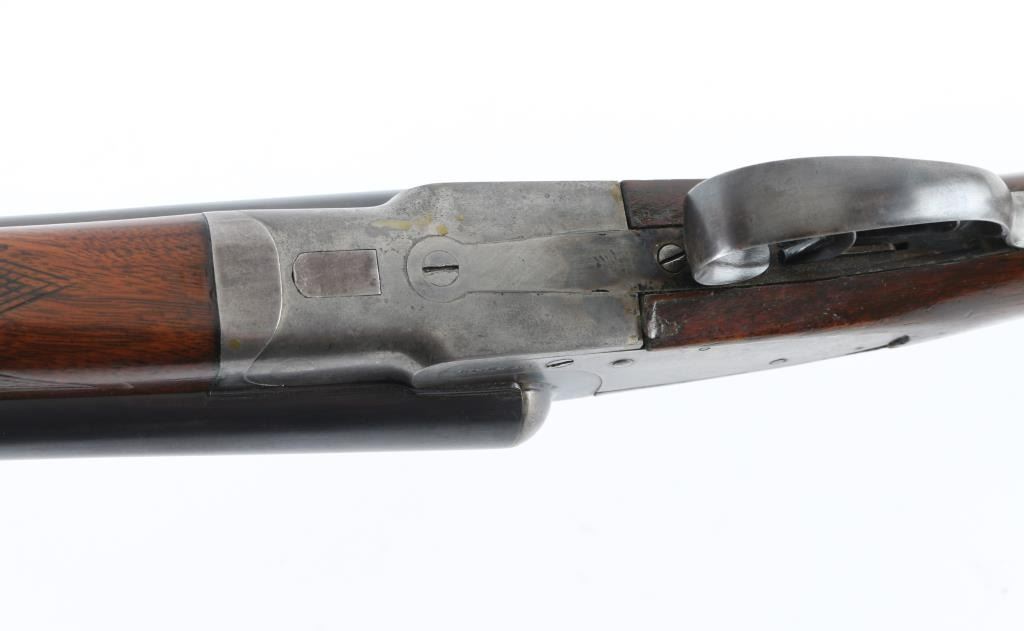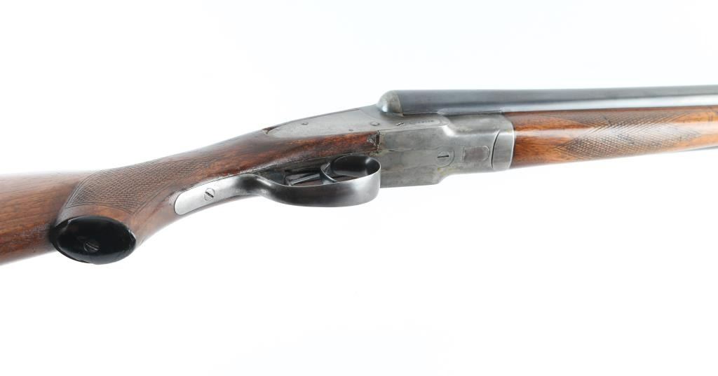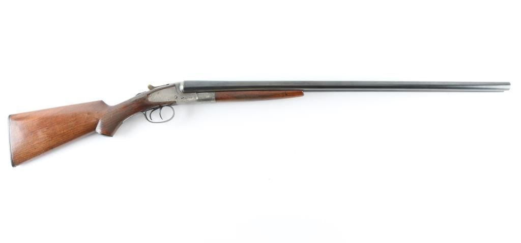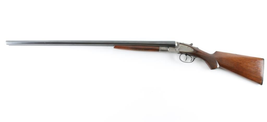 Double barrel side lock shotgun marked "Hunter Arms" (Fulton NY address), manufactured circa 1912-1950. Features 28.5" blued "ARMOR STEEL" barrels (choked IM/IC), low matted rib with brass bead front sight, case color action with removable side plates, double triggers, tang safety (resets on opening), top lever, extractors, walnut furniture with splinter forend & semi-pistol gripped shoulder stock, checkered panels across bottom of forend and on sides of wrist, smooth black plastic or composition grip cap, unmarked serrated black plastic or composition buttplate. Bores are very good. Retains 80% finish on barrels, fading to a grayish tone, with edge losses and scratches. Action has turned mostly dull gray color with some traces of darker case colors where protected from handling. Several screw slots show deformation from improper tool use. Forend is good condition, thin checkering, repair insert piece. Stock has repaired break on upper right tang, scratches and dents. Wood generally appears good with varnish applied, signs of light sanding. Grip cap is broken and cracked. Buttplate is good. Condition is NRA Good *** C&R Firearm ***