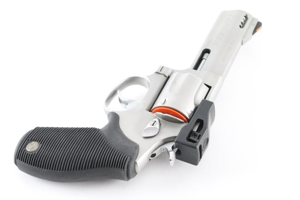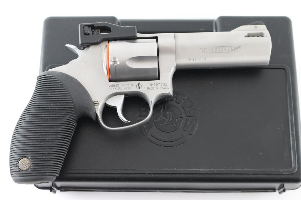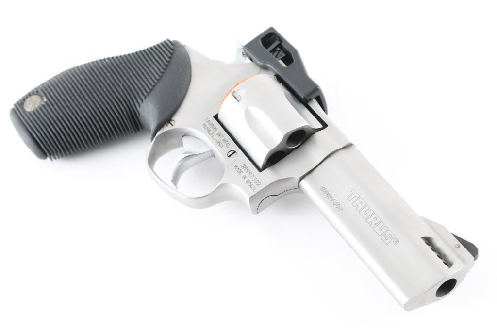 Brazilian made stainless steel medium frame D.A. revolver. Satin finish, ported 4" solid ribbed bbl w/ full underlug, raised ramp front sight with orange insert, adjustable rear window sight, five shot cylinder, smooth combat trigger, knurled semi-target hammer w/ internal locking safety and ribbed black rubber grip with Taurus medallions. Metal finish looks great but there is a drag line on the cylinder and one small surface scratch on the left in front of the cylinder. Grips are fine. Bore looks good, needs cleaned. Comes with original Taurus black plastic case, owners manual, rear sight guard and keys for internal trigger lock. Condition is NRA Very Good. **Modern Firearm**
