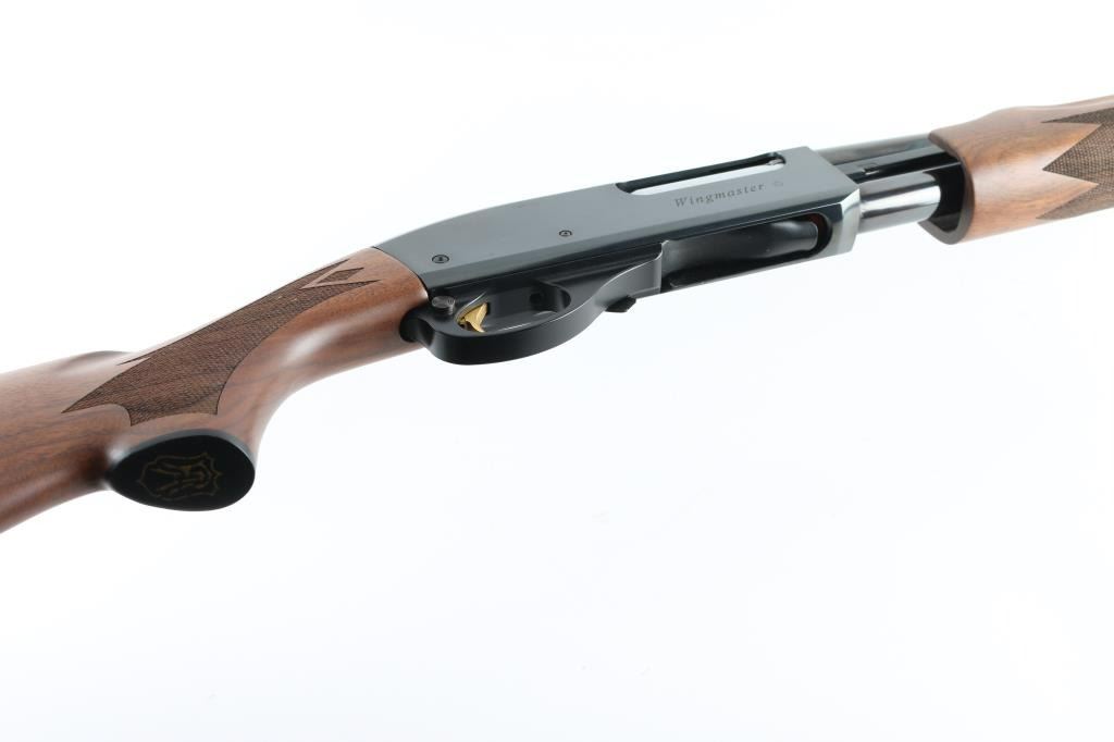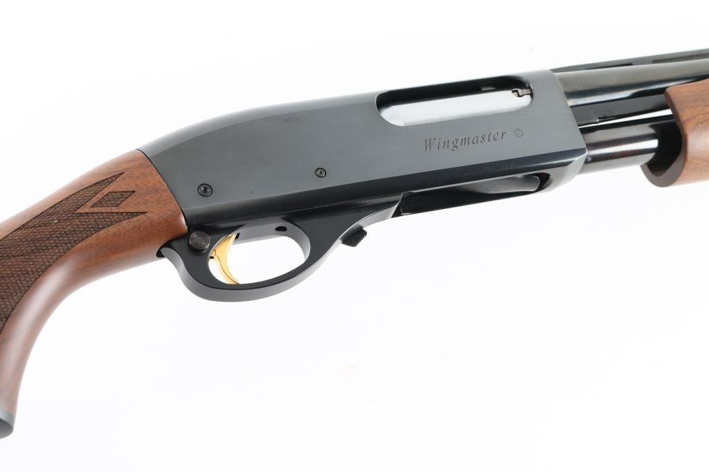 This is a beautiful American made pump action shotgun chambered for 2.75" and 3" 20 gauge shells. This is the new model Wingmaster circa 2014. It features a 28" blued vent rib barrel and receiver with a white bead front sight and a silver mid-bead. It sports a 4 shot magazine tube, metal trigger guard and smooth, gold tone trigger. Remington 870, the serial number and micro-stamp are on the right side of the receiver. Wingmaster is on the right. The walnut stocks are checkered at the wrist and forearm with a finger groove above the checkering on both sides of the forearm. The butt stock has a rubber Remington recoil pad with black spacer and a black grip cap with the Remington Arms logo in gold. The high polish metal finish looks great with little to no signs of use or handling. Wood stocks look great with a tiny ding center left on the butt stock. Bore looks near pristine. LOP is 14.25". Condition is NRA Excellent *Modern Firearm*