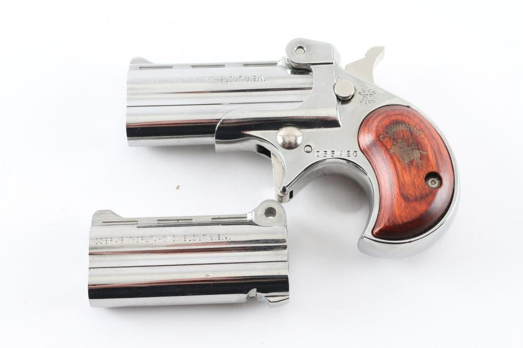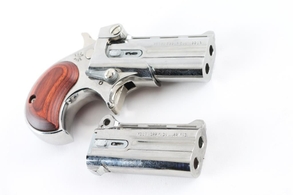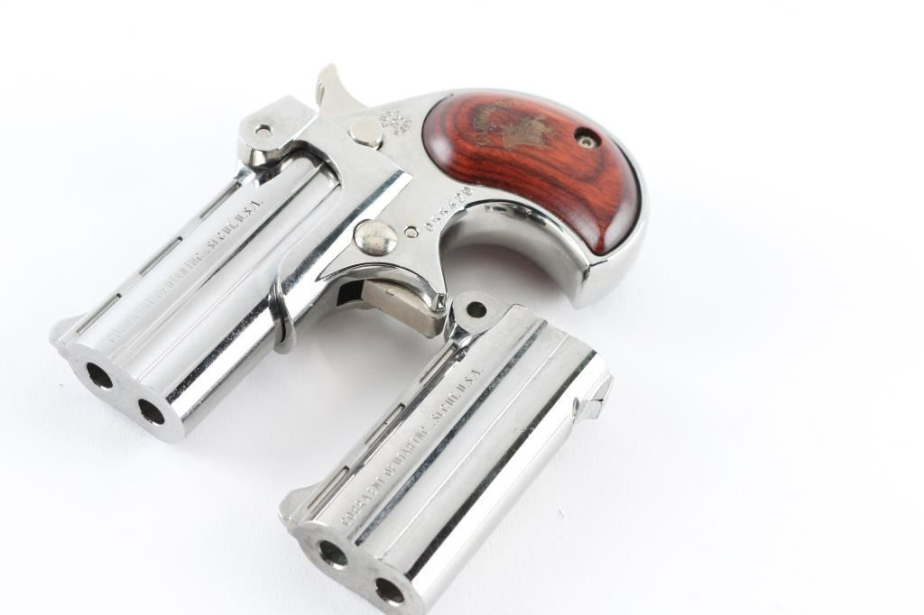American made over/under derringer features nickel finish, 2.75" barrels with faux ventilated top rib, fixed sights, spur trigger, cross-bolt safety, manual extractor and two-piece rosewood grips with a laser engraved horse and rider and the word Cimarron on the left grip. Metal finish looks very good. Grips look great. Bores look very good, need cleaned. Comes with both the .22LR barrels and the .22 Magnum barrels, the original factory blue plastic case, owners manual and lock. Condition is NRA Excellent **Modern Firearm**