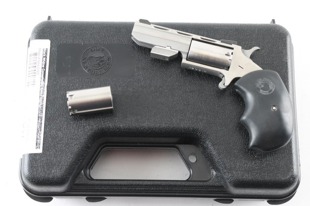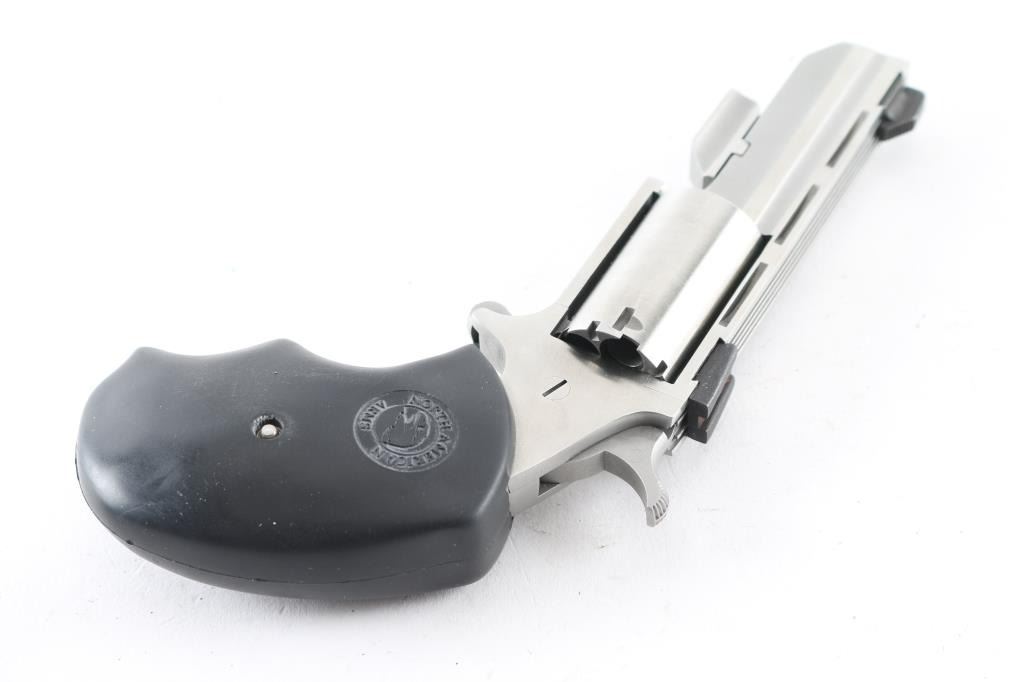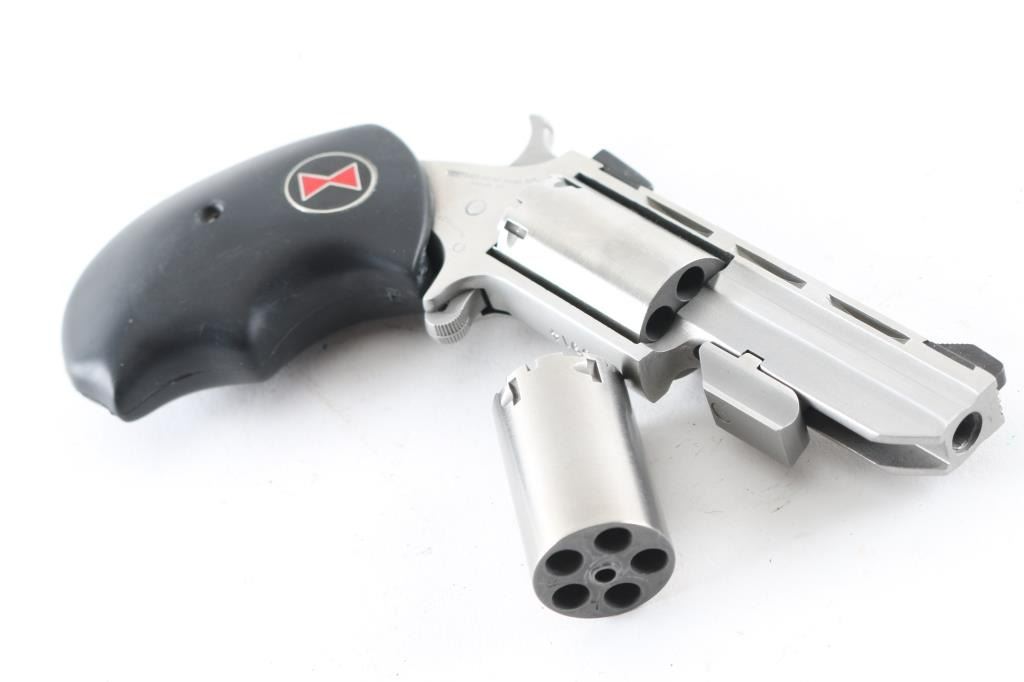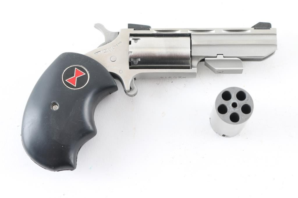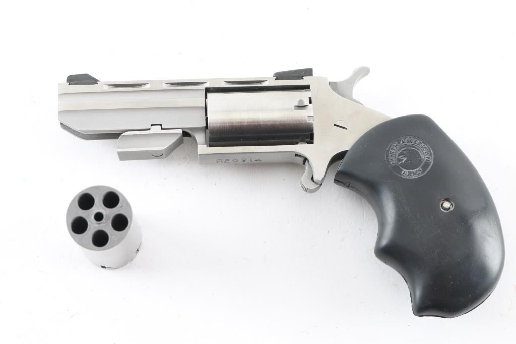 SN:R20914 Made in America by North American Arms out of Provo, UT. the Black Widow is a 5 shot SA revolver chambered for .22LR and .22 Magnum ammunition circa 2010. The Black Widow has a 2" stainless vent rib barrel and frame, a bull cylinder, oversized black rubber grips with a red and black hour glass medallion on the right side and fixed low profile sights. Metal finish looks great. Grips are great. Bore looks good, needs cleaned. Comes with the original factory black plastic case, owners manual, both .22LR and .22 Magnum cylinders, factory fired cases and a lock. Condition is NRA Excellent **Modern Firearm**