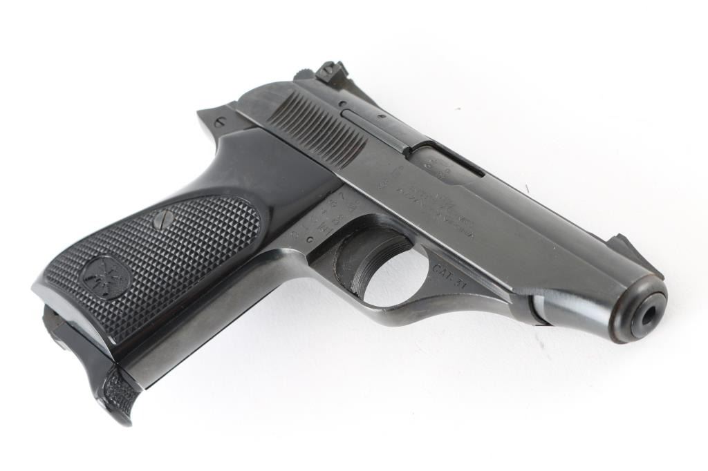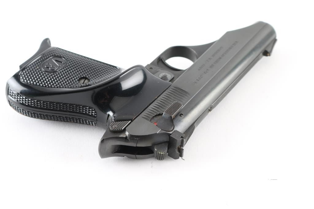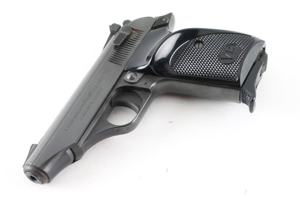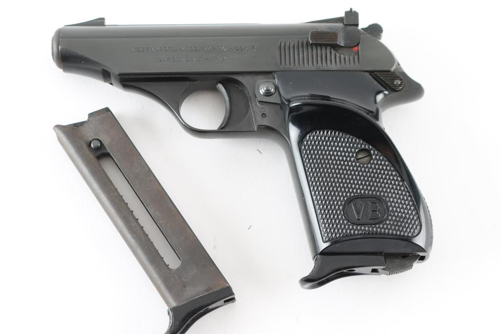 SN: 010467 Italian made single action semi-automatic compact pistol manufactured circa 1980. Imported by Interarms of Alexandria, Virginia with import mark on the right side of the slide. Features a blued finish, 3.5" barrel, serrated sighting rib on the slide, fixed patridge front sight, adjustable rear sight, serrated trigger, serrated round hammer spur, thumb safety on left side of the slide, manual safety lever on the left side of the frame, magazine disconnect safety, loaded chamber indicator on the extractor, heel magazine release, factory 7 round magazine with finger rest floorplate, steel frame and two-piece checkered black plastic thumb rest grips with 'VB' decor. Pistol exhibits approximately 95% of it's original blued finish showing handling marks. Action is smooth, the bore is very good, and the plastic grips are near fine. Includes factory box with spare magazine, bore brush, screwdriver, manual. Condition is NRA Excellent *** Modern Firearm ***