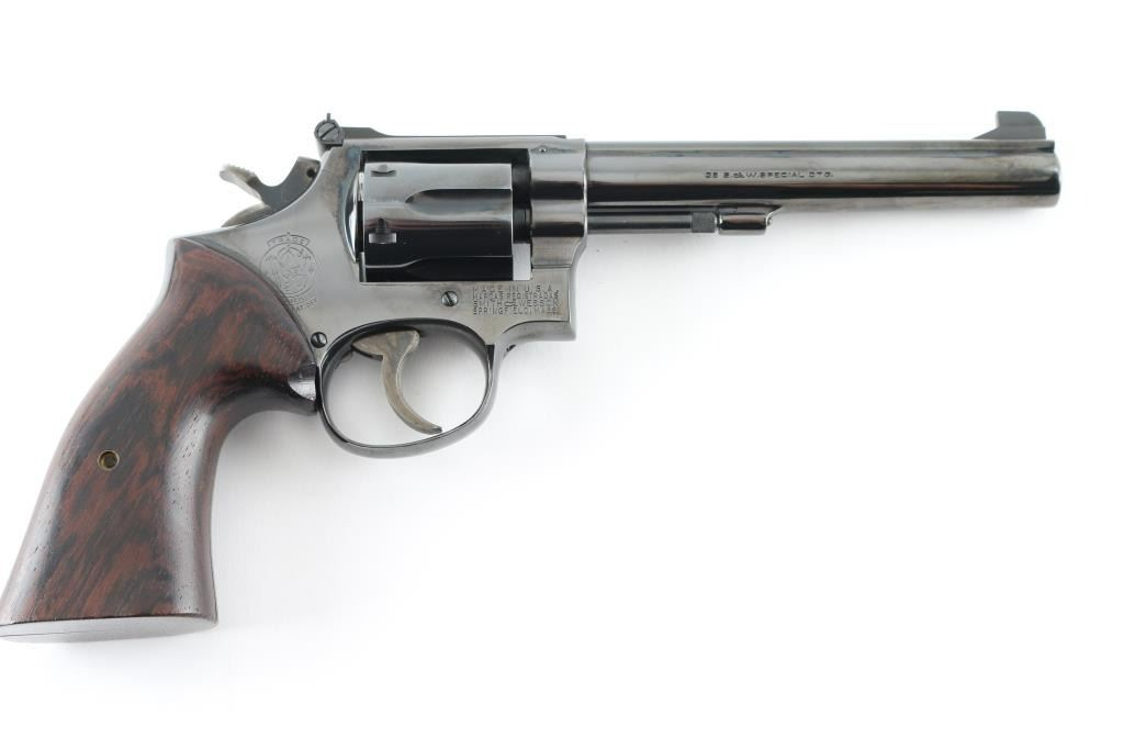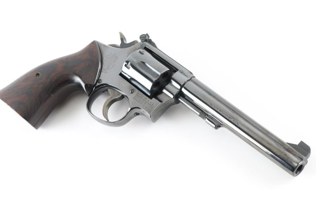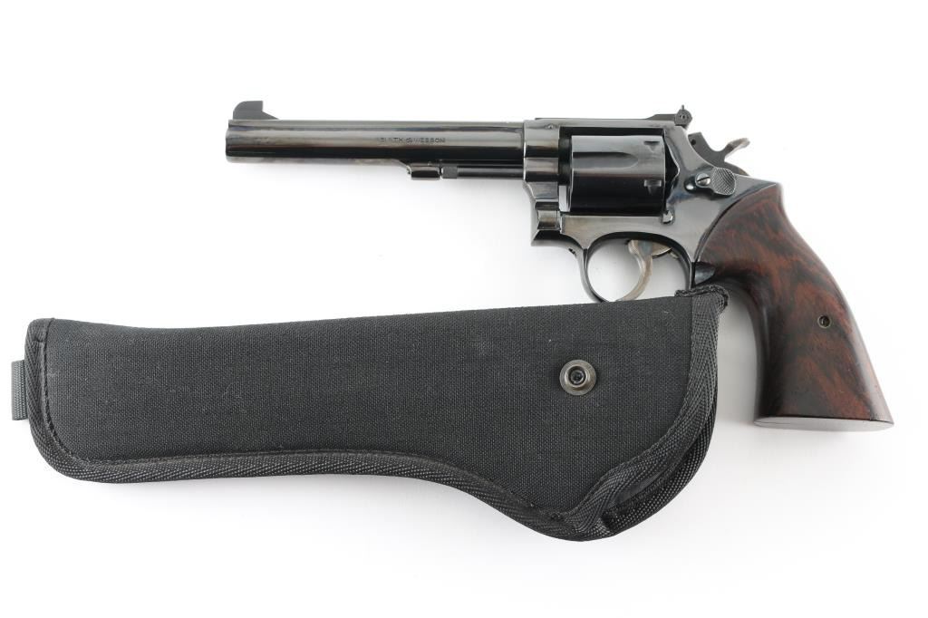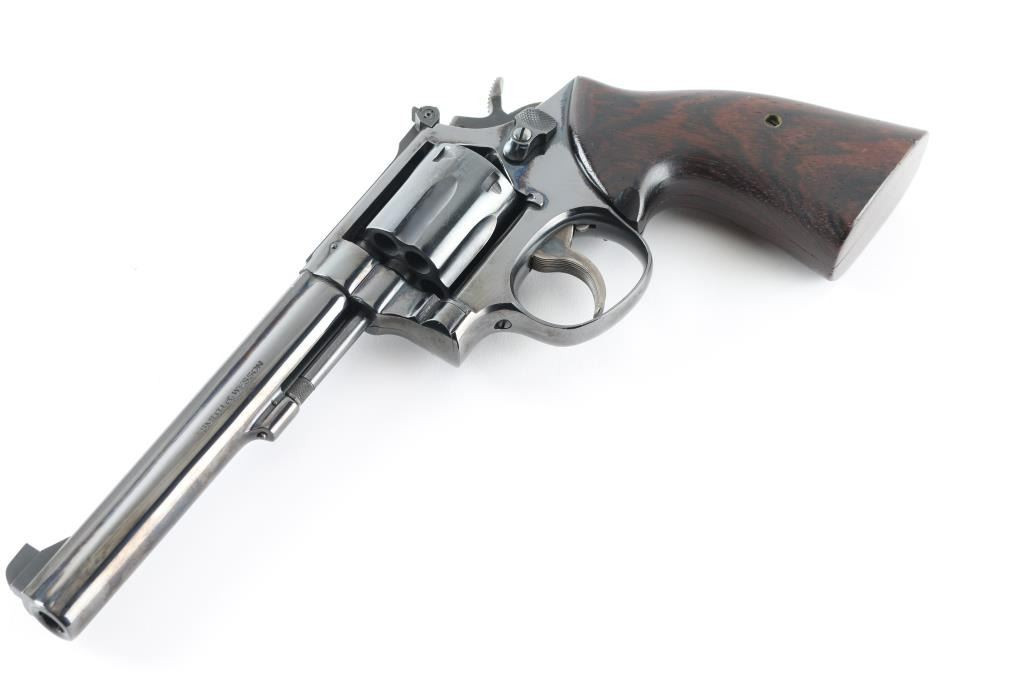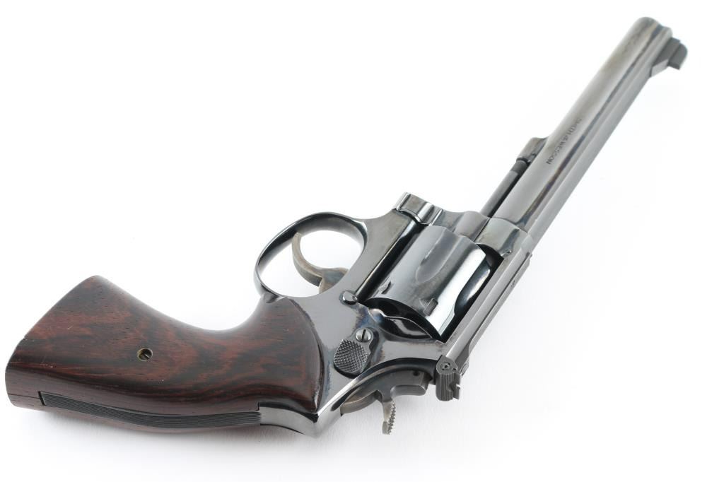 American made DA/SA, 6 shot revolver chambered for .38 Special ammunition. It features a 6" blued barrel and frame with a swing out fluted cylinder, serrated rib, raised blade front sight, adjustable rear sight, serrated trigger, knurled hammer spur, serrated back strap and smooth brown and black wood grips. Trigger and hammer are color case hardened and retain color. Metal finish looks very good with little sign of handling. Wood grips look very good with minor signs of handling. Bore looks great, bright. Comes with an Uncle Mike's Size 4 Sidekick holster. Condition is NRA Excellent *Modern Firearm*