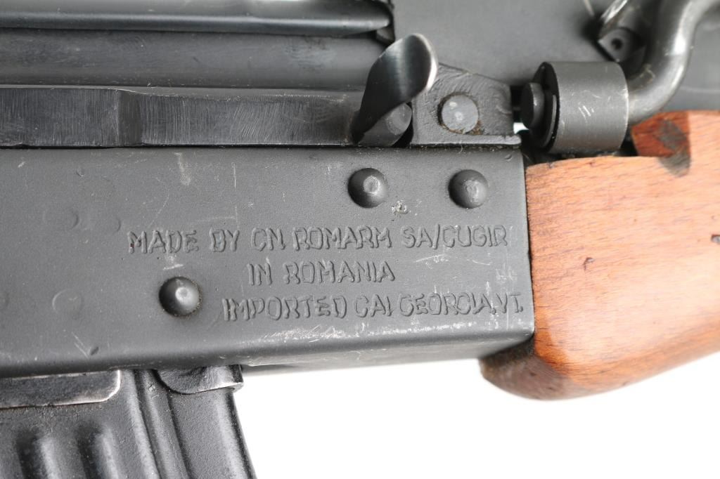 Romanian semiautomatic rifle imported by CAI, Georgia VT. Long barreled Kalashnikov platform variant of AK-47/AKM rifles. Features matte black finish, smooth hardwood furniture, 22" barrel, protected post adjustable front sight, tangent rear sight, folding bipod, provision for cleaning rod (no rod present), thread protector over muzzle threads (appears spot welded in place), manual safety, folding carry handle, black polymer pistol grip, left side receiver optic rail, RPK type "club" shoulder stock with sling swivel & cleaning tools in trap. Barrel is a standard profile AKM barrel, not heavy profile. Front sight base retains detent for locking muzzle devices. Chrome lined bore is bright and shiny. Overall appearance is like new with scuffs to metal, handling marks. Includes brown leather AK sling, one 30-rd magazine. Bolt carrier and receiver cover numbered "00418". Condition is Excellent *** Modern Firearm ***