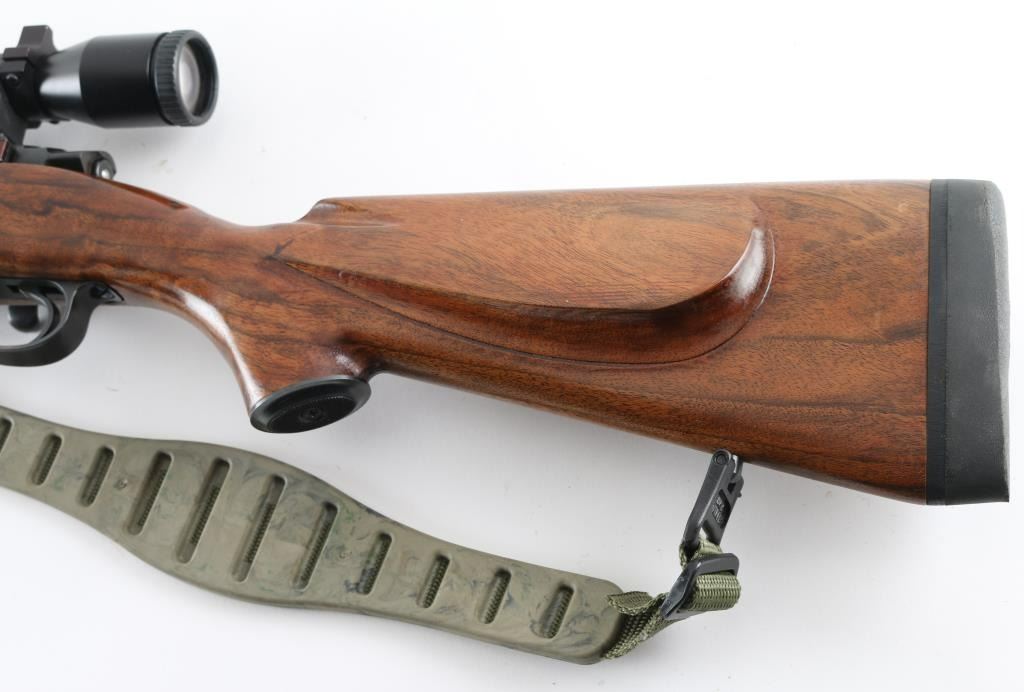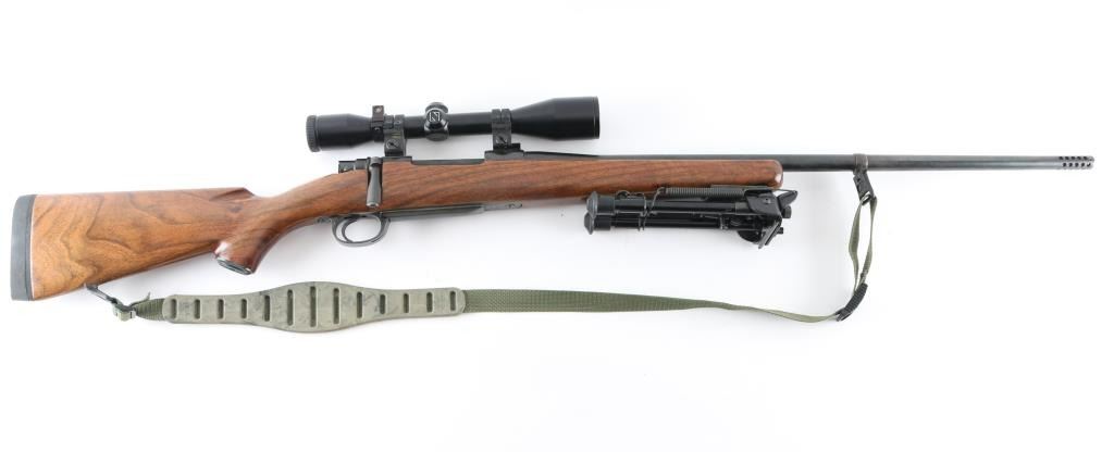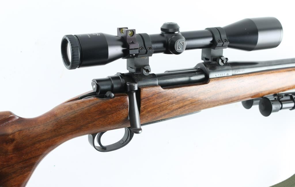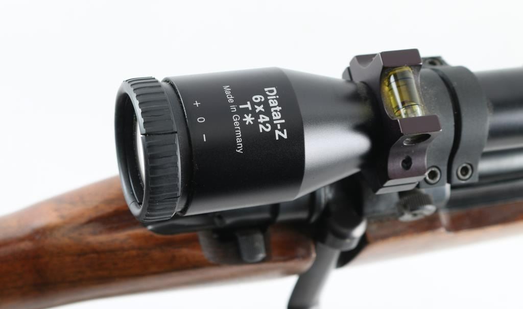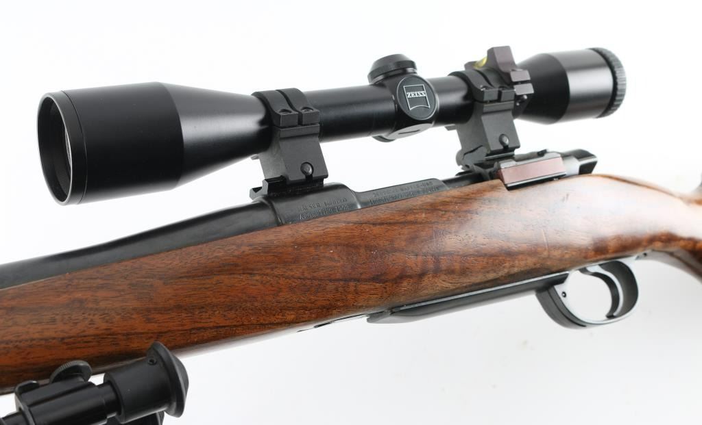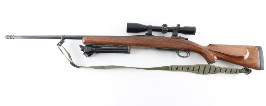 German made contract rifle made for the Argentinean Army, re-chambered to .338-06. Re-stocked, and re-blued. Manual safety. "butter knife" bolt handle, serrated trigger. Black rubber recoil pad. Harris SL bipod attached. Sling attached. Barrel muzzle has been ported. Monte-Carlo type stock. Mounted with the German made Zeiss Diatal-Z 6x42 T* scope. Re-blue is excellent. Wood is excellent. Bore appears excellent/bright, Action is stiff, needs oil. A really professional job. NRA Condition-Near Excellent as refurbished. C&R firearm.