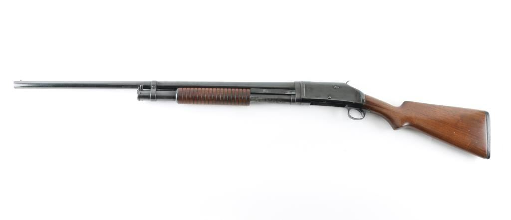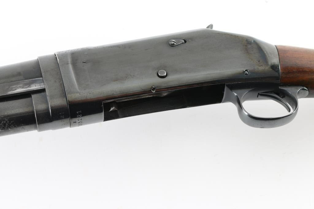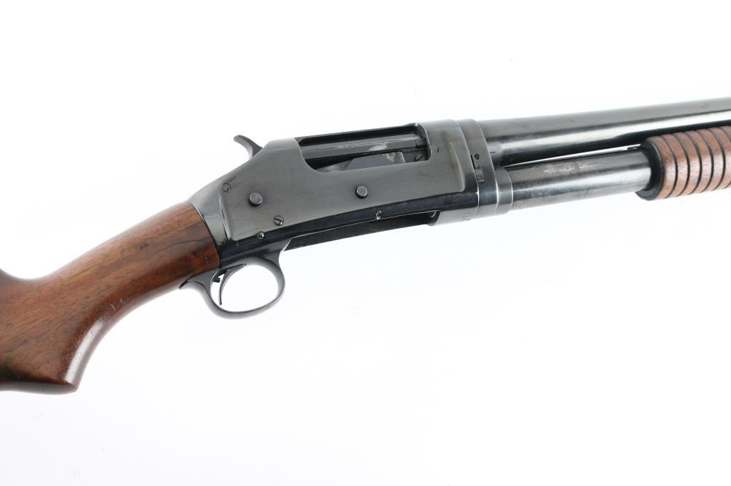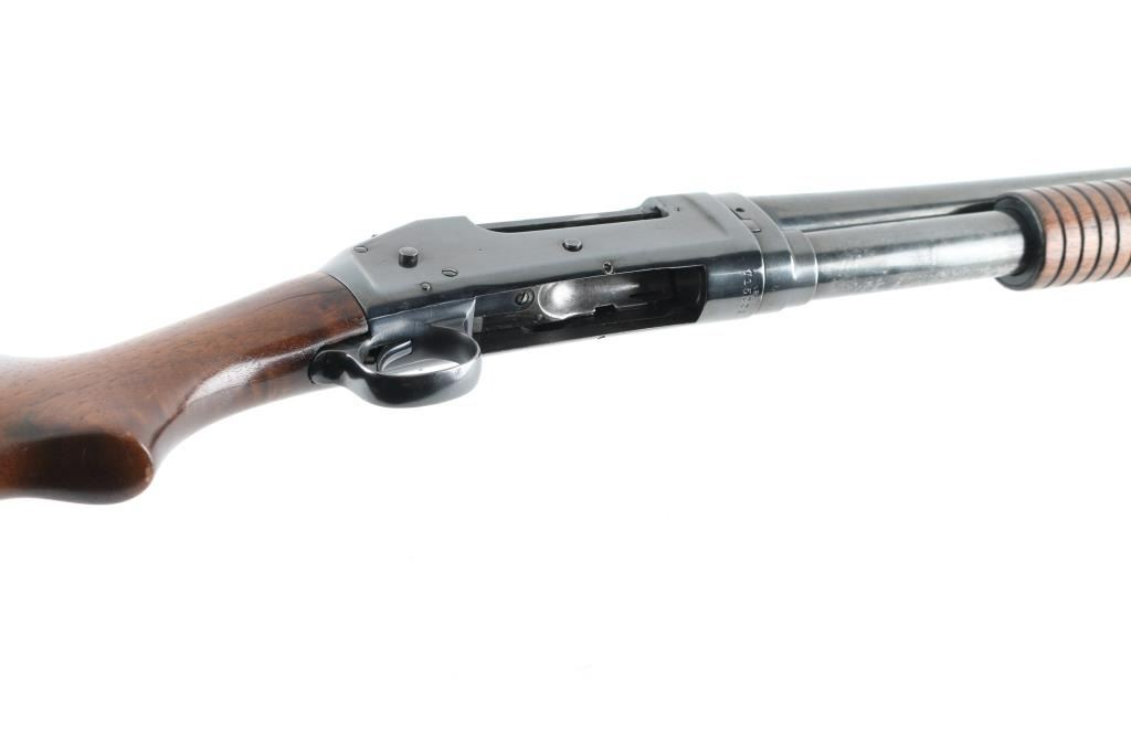 Take down pump action shotgun manufactured circa 1922. Features 28" plain barrel marked FULL choke with a brass front bead, half length magazine tube, smooth wood semi-pistol grip stock & grooved pump handle. It has a thin smooth trigger, knurled hammer spur and a black Winchester butt plate. Receiver appears to have been reblued at some point, the barrel may have been as well. The finish on the barrel is faded in areas with surface rust in different areas and a few scratches. The receiver shows pitting under the reblue. The forend looks fine. The stock has a hairline crack on the right where the receiver meets the wood. The stock has been repaired dead center, on top where the receiver meets the wood there is a 3" long 2" wide piece of wood used as a repair and they did a nice job of sanding and blending. Bore looks great. LOP is 13.5". Condition is NRA Good *C&R Firearm*