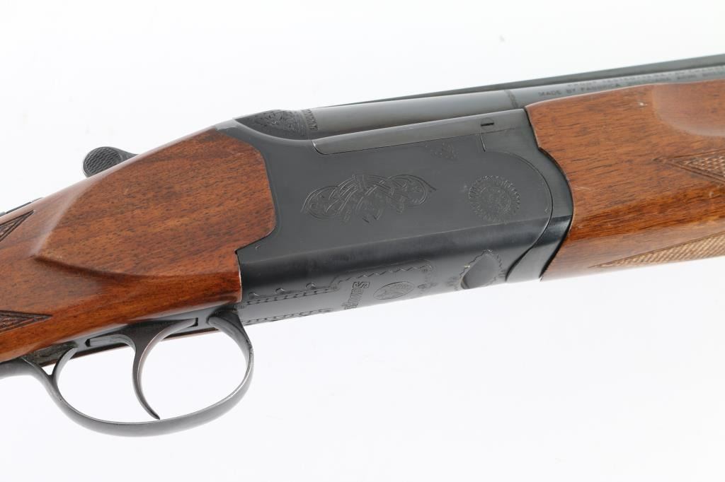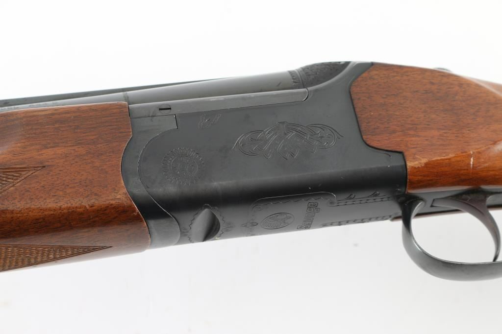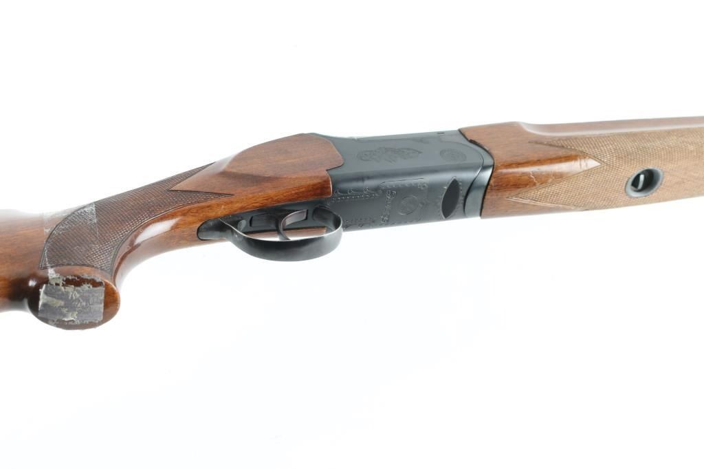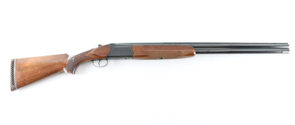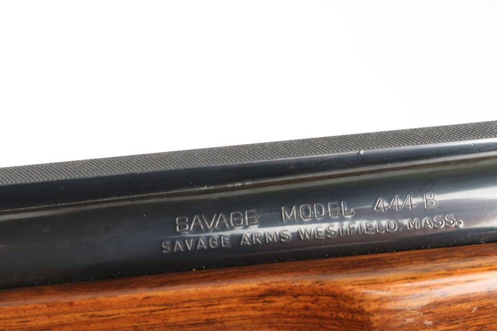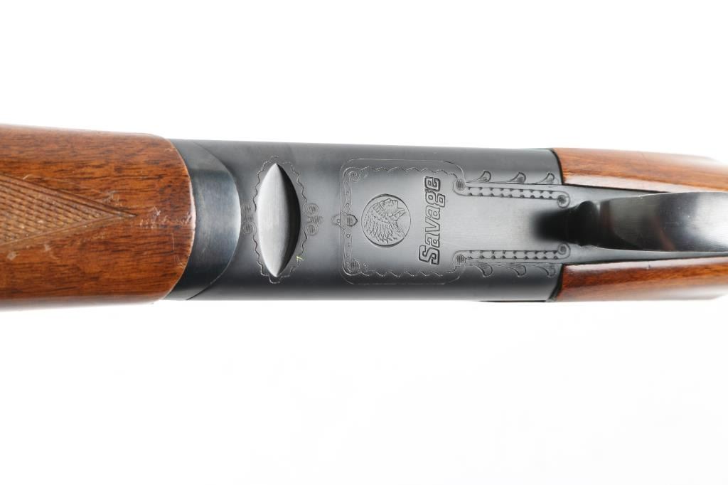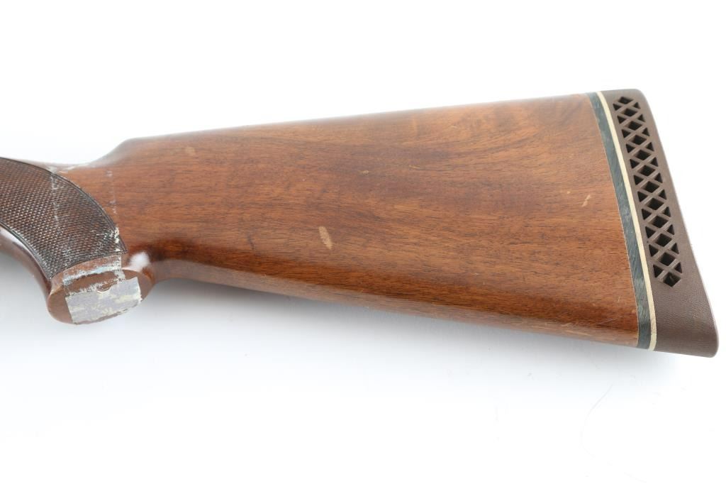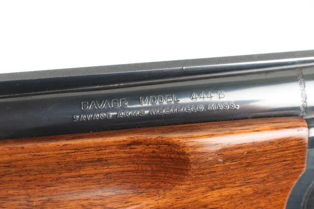 Made in Italy for Savage this is an O/U shotgun chambered for 2.75" 12 gauge shells circa 1969-1972. It features 28" hard chrome lined, vent rib barrels blued to match the box lock receiver. The barrels have a silver front and mid-bead. The stock and fore-end are European Walnut with fine line checkering at the wrist and on the semi-beaver tail fore-end which also has finger grooves on both sides above the checkering and has a White Line recoil pad installed. The 444-B was advertised as the Deluxe model with ejectors and a unique selective single trigger. There is nice simple engraving on the receiver and around the top lever. Savage and the Indian logo are engraved on the bottom in front of the trigger guard. The metal finish looks good but there is some loss of finish on the right side of the barrels along with some splotchy spots. There is also a bulge on the outside of the bottom barrel about an inch or two from the muzzle but doesn't seem to show on the inside of the bore. The wood stocks look fine with the usual scuffs and scrapes for a gun that's seen some use. There is however a lot of tape residue around the wrist. There are no cracks anywhere but they wrapped tape around the wrist and grip cap area maybe for fit. The bores look good but dirty. Chokes: Top barrel marked Full, bottom barrel marked Modified. LOP is 14.25". Nice gun, needs cleaned and a little TLC. Condition is NRA Good+ *Modern Firearm*