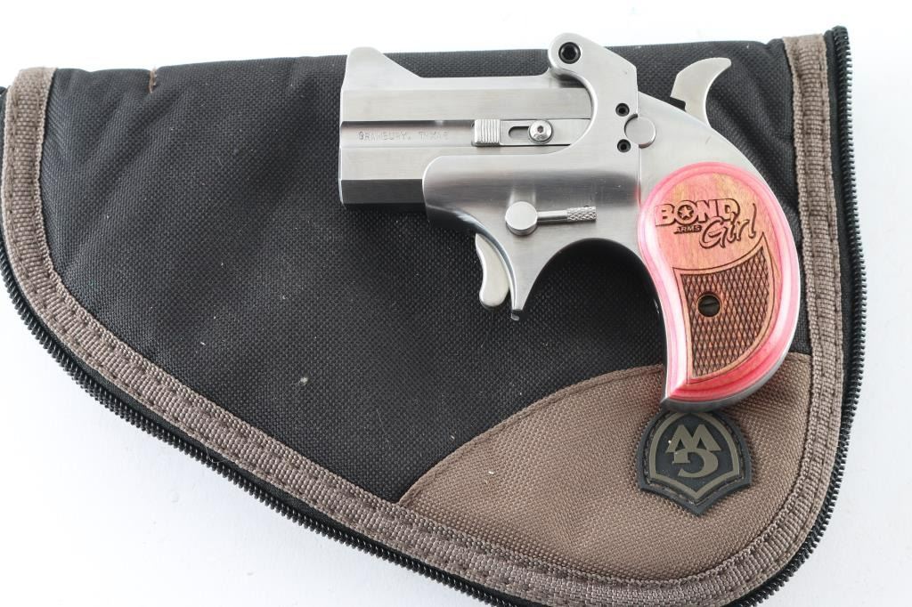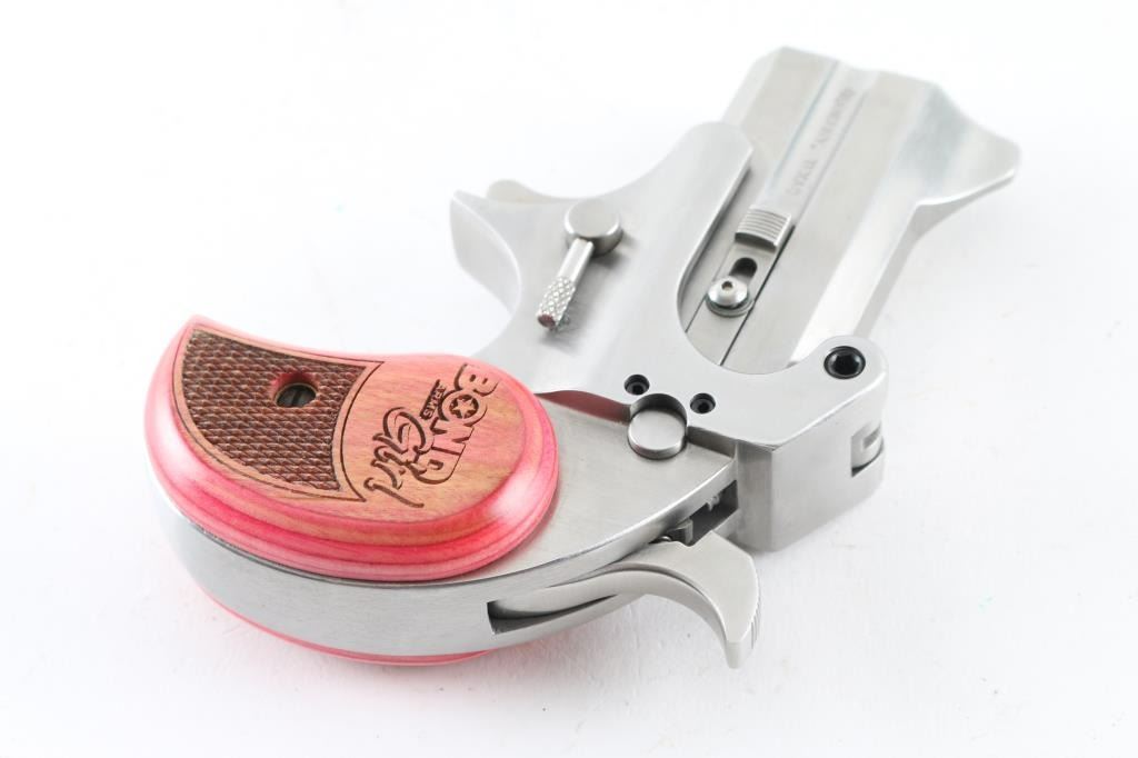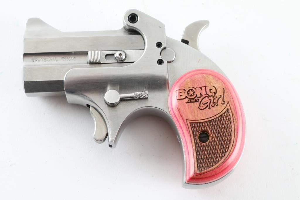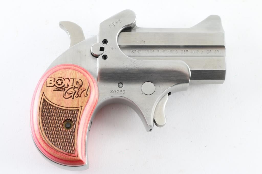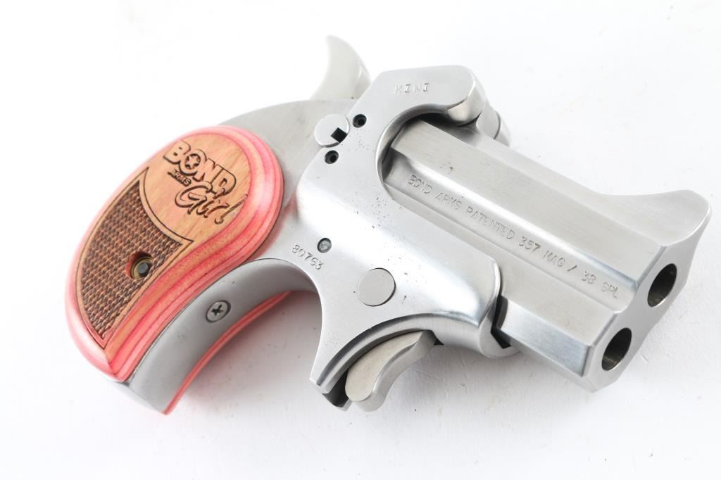 Made in America this offering from Bond Arms in Texas makes any girl a Bond Girl. It is an over under derringer chambered for .357 Magnum and .38 Special ammunition. The Bond Girl Mini is a special edition featuring 2.5" stainless tip up barrels in a stainless grip frame. It has a smooth spur trigger, integral sights and a serrated hammer spur. It sports 2 piece pink accented wood grips with laser checkering and Bond Girl laser engraved on both panels. Metal finish looks great. Wood grips look great. Bores look great, bright. Comes with a soft case. Condition is NRA Excellent+ *Modern Firearm*
