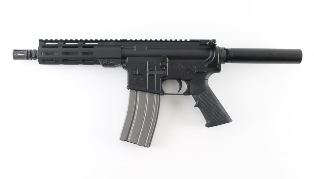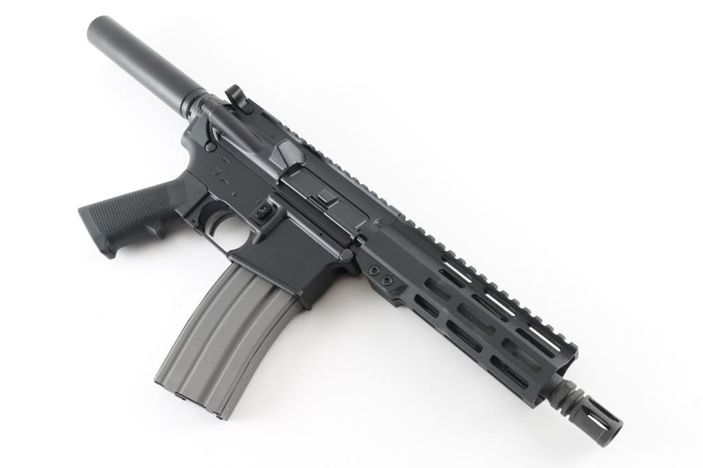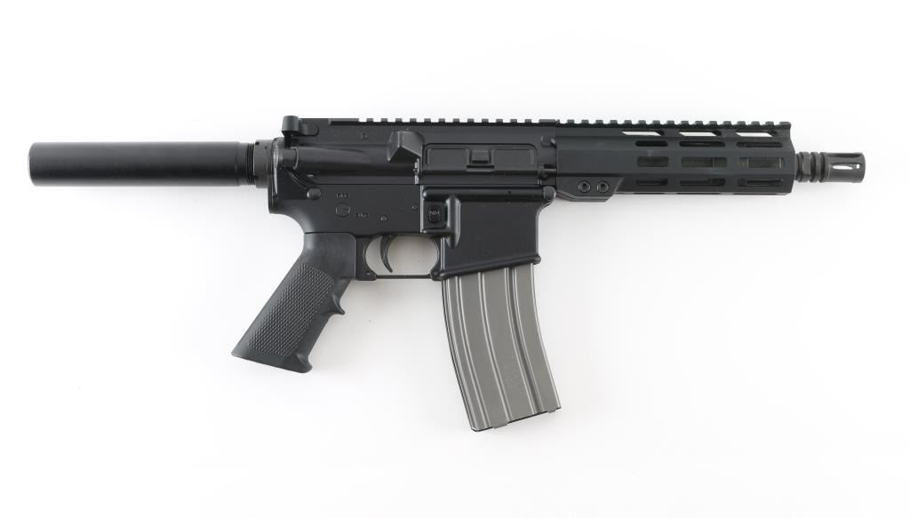 Semiautomatic pistol based on AR15 platform. Features matte black finish, 7" barrel, A2 style birdcage flash hider, M-lock handguard, Picatinny rail on top of receiver and handguard, manual safety, polymer A2 style pistol grip, plain buffer tube with smooth exterior, standard ejection port cover. Pistol is like new in excellent condition, few handling marks, with original factory box. Includes (1) 30 rd Duramag magazine. Condition is NRA Excellent - like new *** Modern Firearm ***