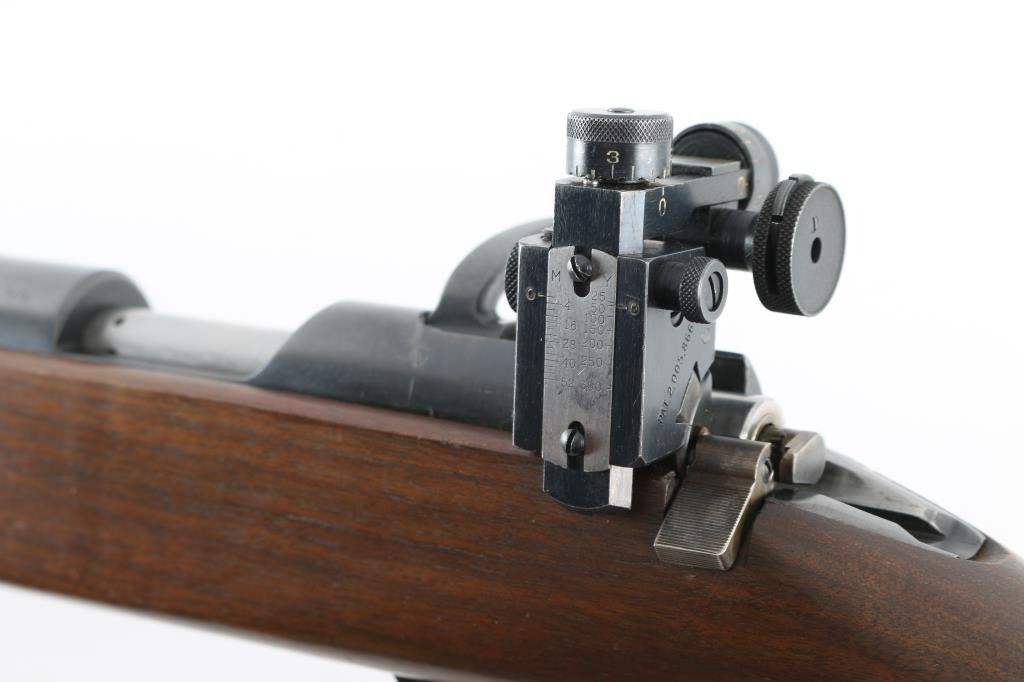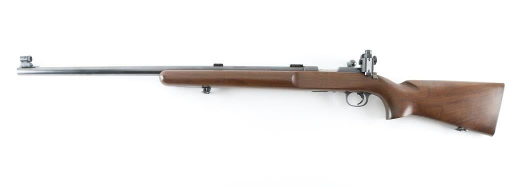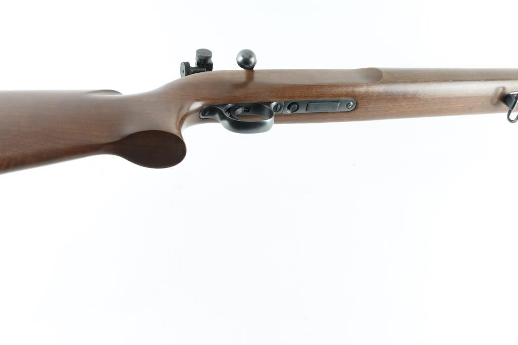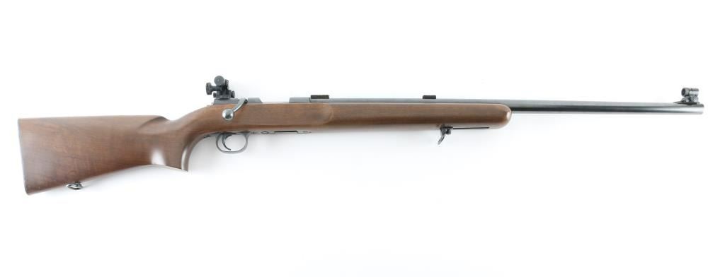 'The Rangemaster' rimfire bolt action target rifle. Features blued finish, walnut target stock, 28" heavy barrel, hooded globe front sight, adjustable diopter rear peep sight, dovetail blocks on barrel, manual safety, single shot cartridge shelf (can be replaced with a 5 round magazine), sling swivels, short section of accessory T-slot rail inset into bottom of forend, checkered steel buttplate. Bore is very good condition. Retains 90% finish with handling marks, edge wear. Wood is very good condition. Condition is near NRA Excellent *** Modern Firearm ***