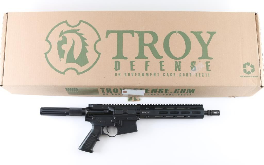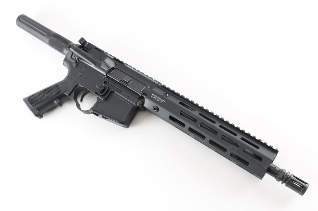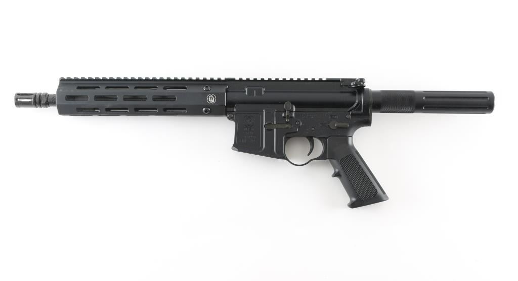 Semiautomatic pistol based on AR15 platform. Features matte black finish, 10" barrel, A2 style birdcage flash hider, Troy M-lock handguard, Picatinny rail on top of receiver and handguard, manual safety, A2 style pistol grip, partially fluted buffer tube with knurled section, standard ejection port cover. Lower receiver has unique "fence" around mag release button, with thicker receiver at hammer pin, large oval shaped integral trigger guard. Pistol is like new in excellent condition, few handling marks, with original factory box. No Magazine. Condition is NRA Excellent - like new *** Modern Firearm ***