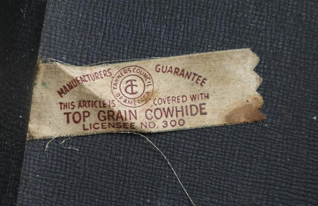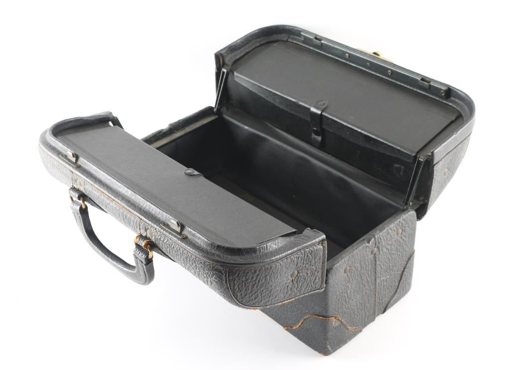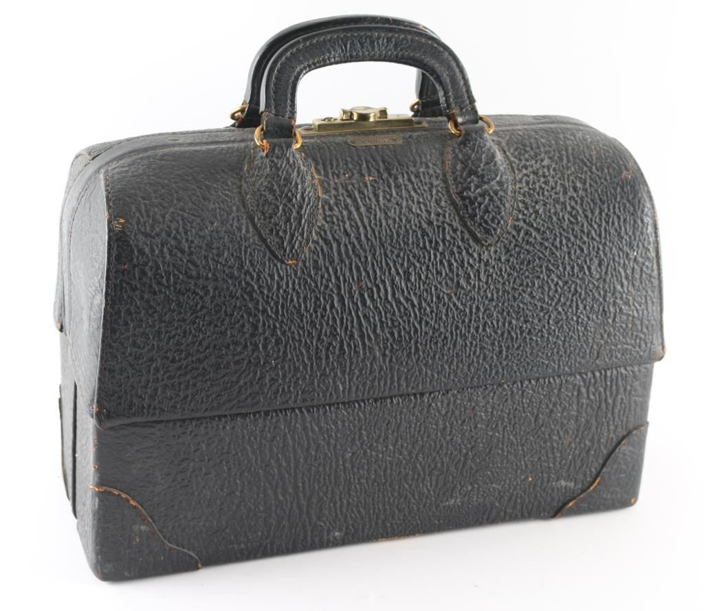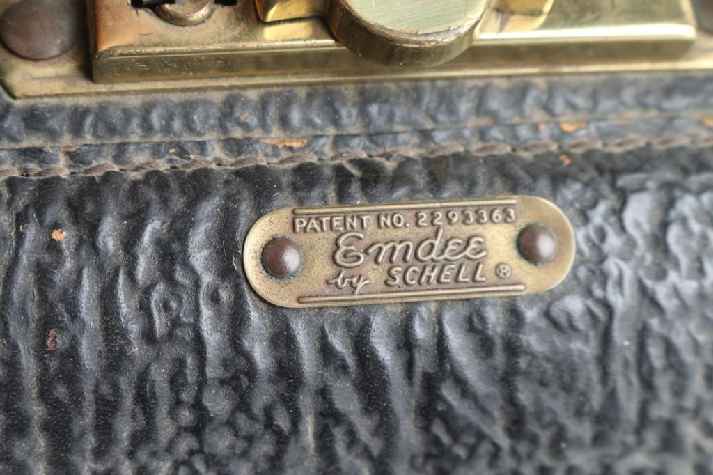 with original label "Emdee Schell", black textured cowhide with double handles and brass hardware with compartments inside.