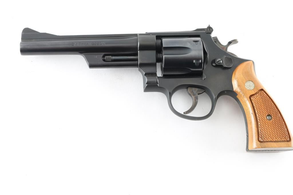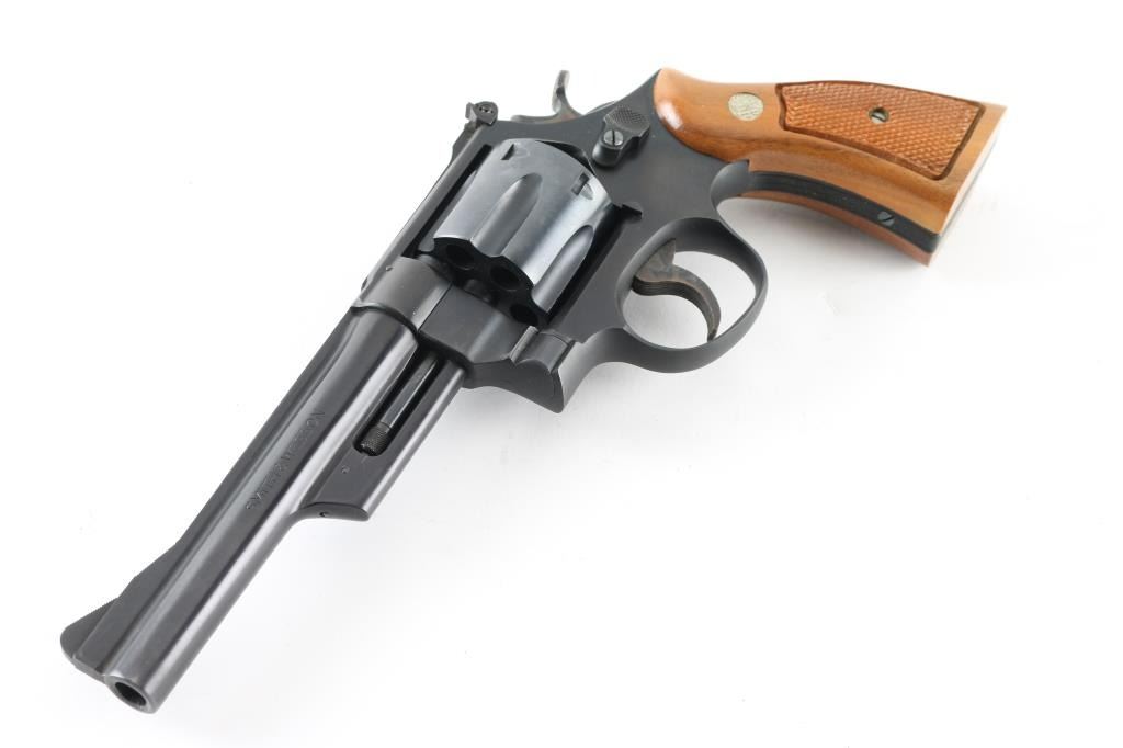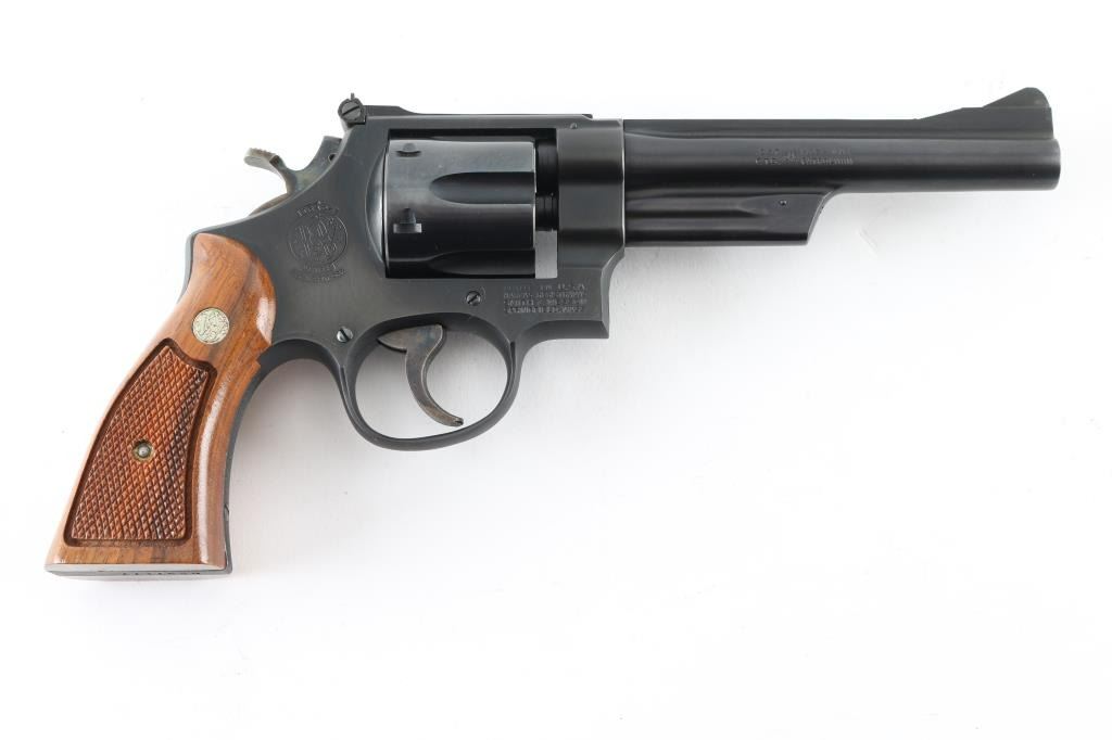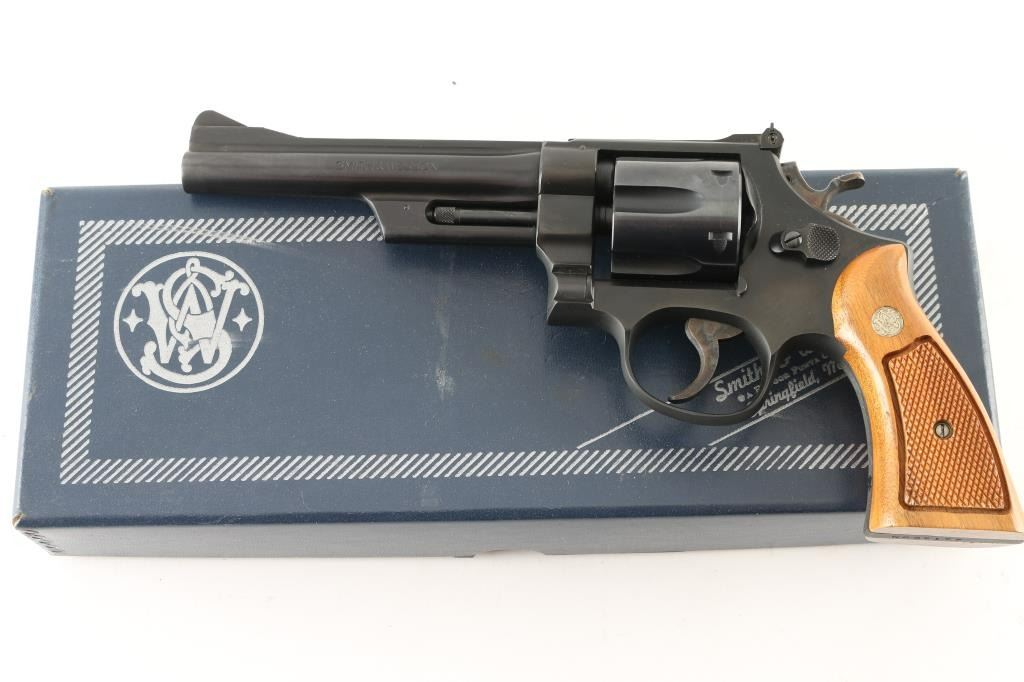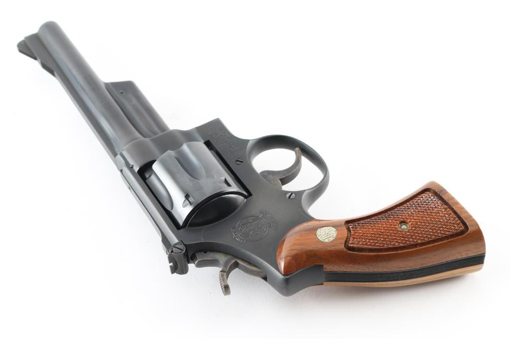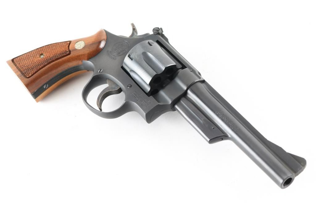 'The Highway Patrolman' "Pinned & Recessed' double action revolver manufactured circa 1974-77. Features service grade blued finish, "Magna" style checkered wood grips with S&W medallions, 6" barrel with shrouded ejector rod, adjustable sights, case colored grooved narrow trigger, case colored checkered medium width spur hammer. Bore and charge holes are very good condition. Retains 98% finish with few handling marks. Action is smooth with tight lock-up. Includes two piece blue cardboard S&W box with cleaning kit & papers. Condition is NRA Excellent - like new *** Modern Firearm ***