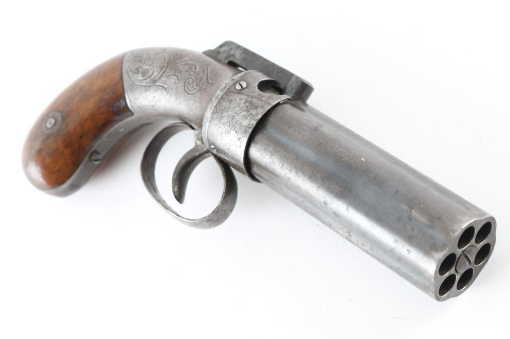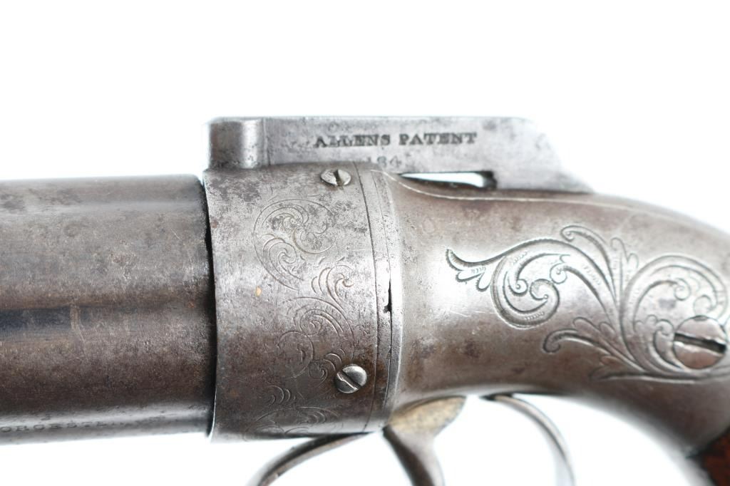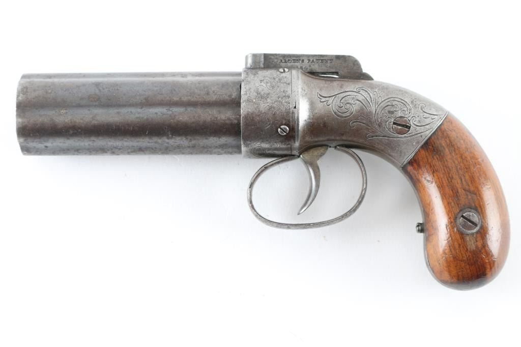 Antique medium frame double-action-only six barrel pepperbox pistol chambered for .32 caliber ammunition, manufactured at the Worcester facility circa 1847-1865. Features fluted 4" barrels, bar style hammer with 1845 patent date, smooth trigger with triggerguard, scroll engraved nipple shield & frame, and two-piece varnished walnut 'bag' style grips. The barrels are marked "ALLEN THURBER & CO" & "WORCESTER" and the hammer is stamped "ALLEN'S PATENT/1845". Pistol exhibits an aged gray patina with scattered pin prick pitting and has minor traces of finish retained in the protected areas. Action is sound, the bores are clear, markings are faint and the refinished wood grips are good. NRA condition-Good to Very Good as Antique Firearm.