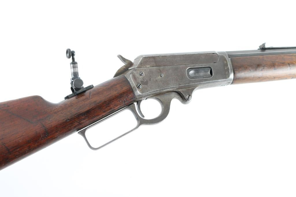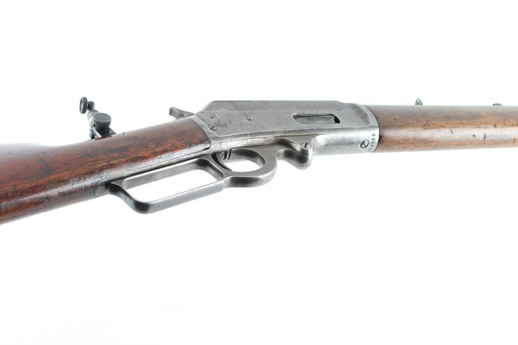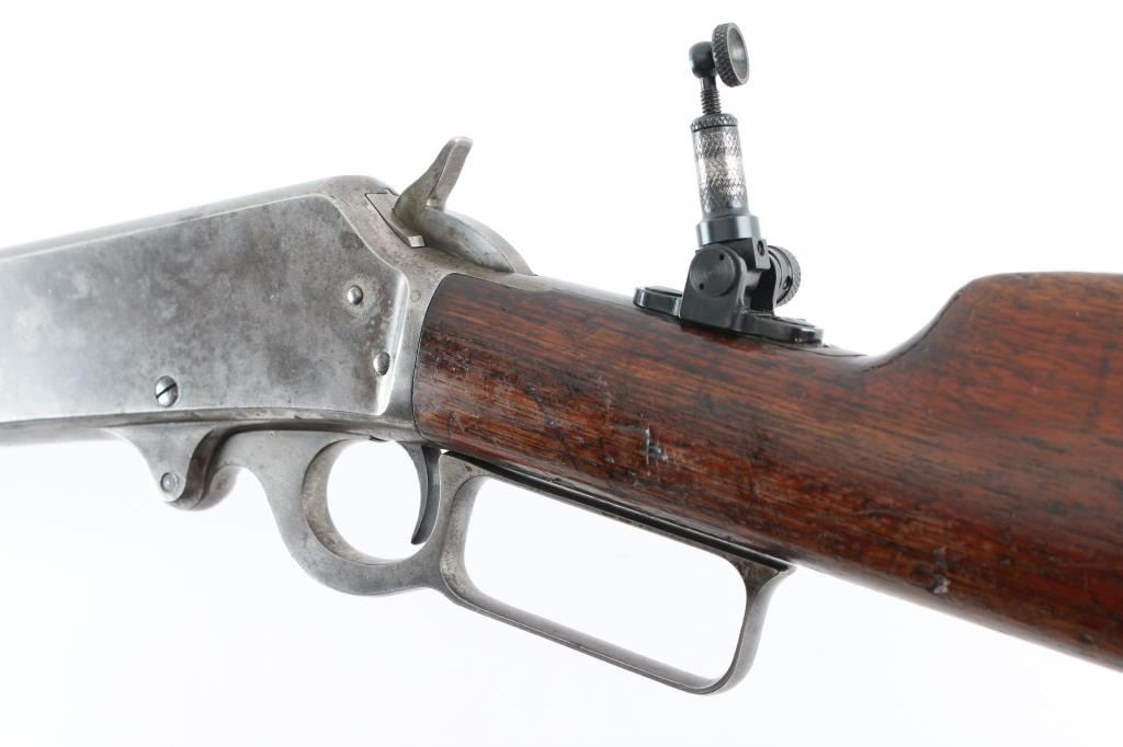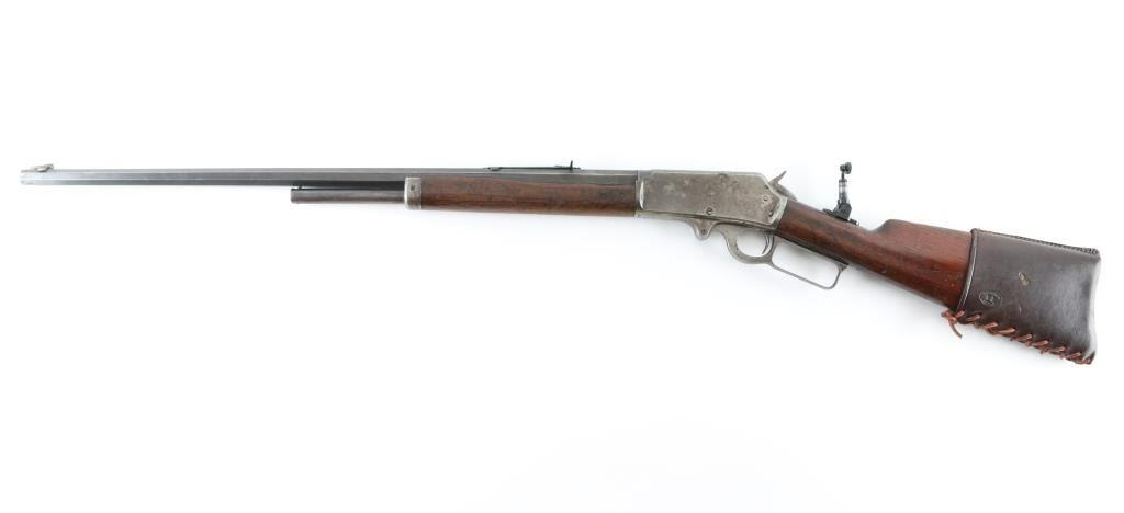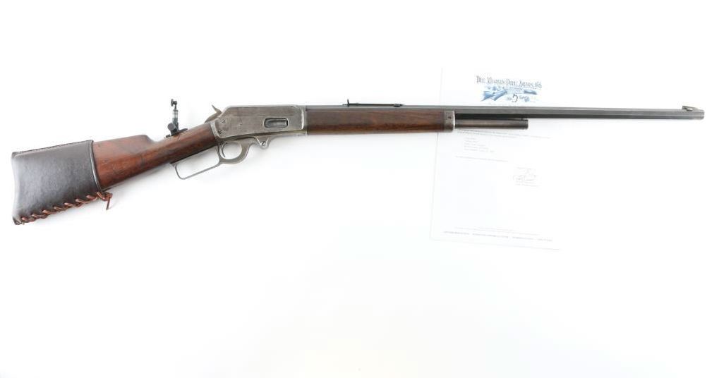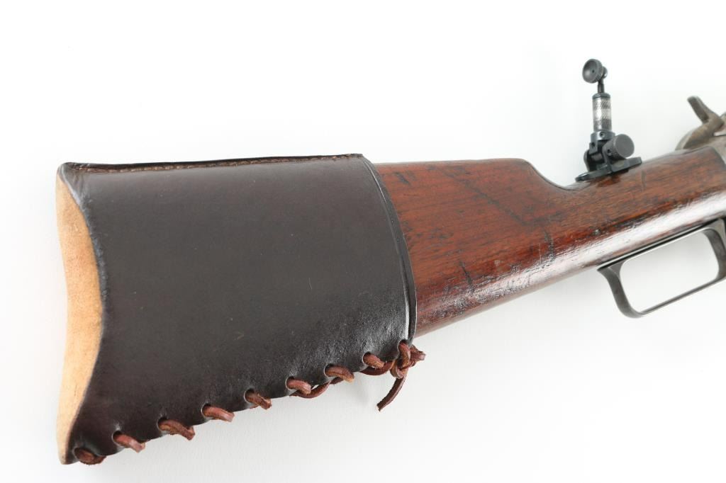 Rifle. Lever-Action. Manufactured 1904. Different from Winchesters in that it was side-ejecting. 26" octagonal barrel, with post/bead front and sporting rear sights. Half length magazine. Stamped with Marlin address, patent dates on top along with 38-55. "Special smokeless steel" on the side. "Marlin Safety" on top of receiver, and Model 1893 on tang. Smooth walnut stock, and forearm, buttplate is covered with a brown leather recoil pad marked "Kirkpatrick Laredo, Tex". Bore appears good with rifling present. Action is crisp/tight .Wood is fair with some minor scratches/dings, there is a narrow 6" chip out of the top of the left forearm. Wood has been varnished. Barrel is a dull blue/plum color receiver/lever are mostly in the white from handling. Comes with a Cody museum letter showing this rifle, in the same configuration, was shipped August 14, 1905 from the factory. A newer made peep sight has been attached to the tang. NRA condition-Good. C&R Firearm.