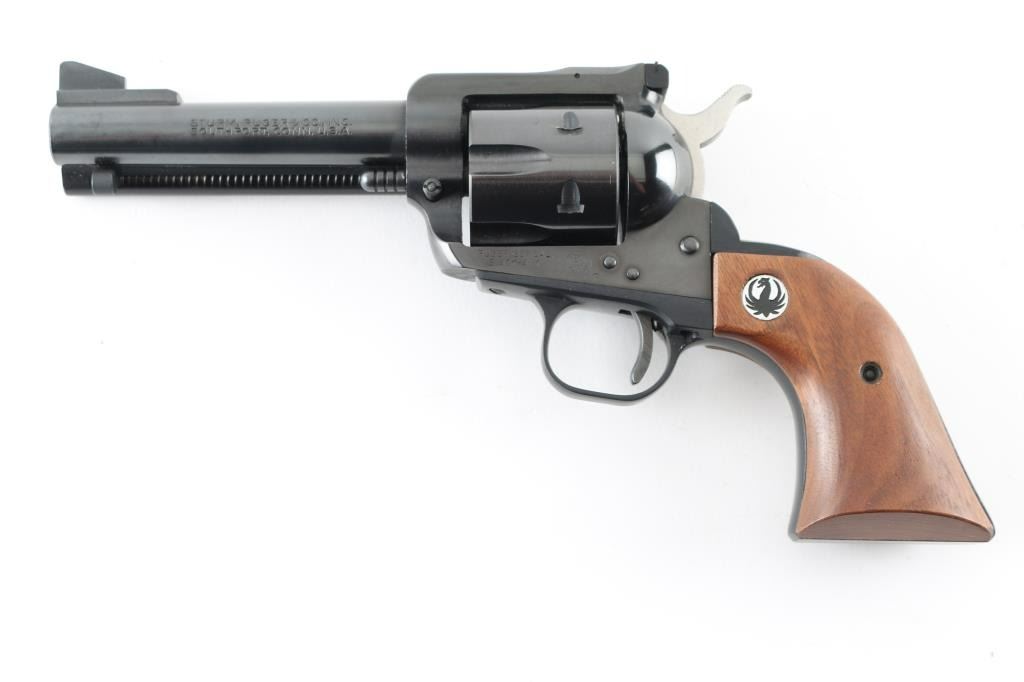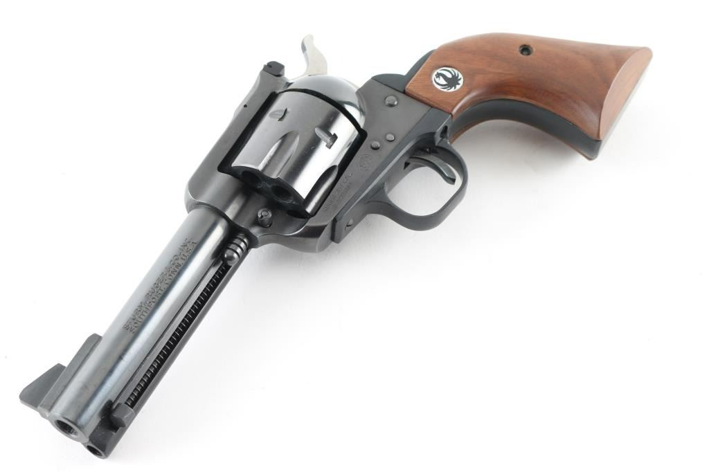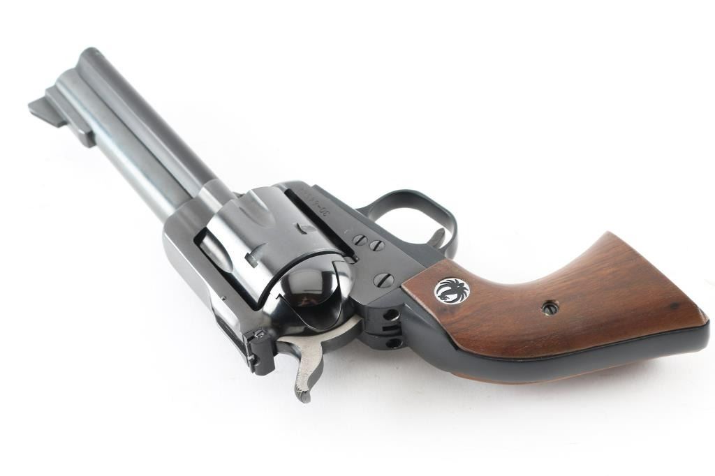 'Three Screw - Old Model' Single action revolver manufactured circa 1970. Features blued finish, smooth wood grips with Ruger medallions, adjustable sights, 4.5" barrel, round trigger guard, 6 shot fluted cylinder. Bore and cylinder charge holes are in excellent condition. Retains 98% finish with minor handling marks. Stamped Ruger logo on left side of frame appears shallow. Includes yellow cardboard Ruger box. Condition is NRA Excellent *** C&R Firearm ***