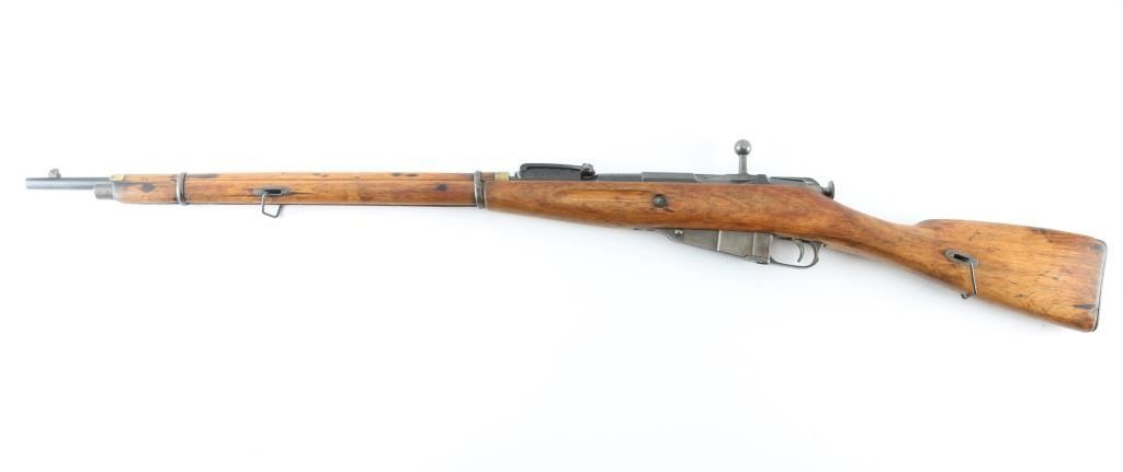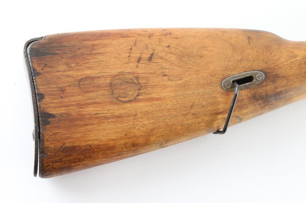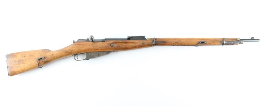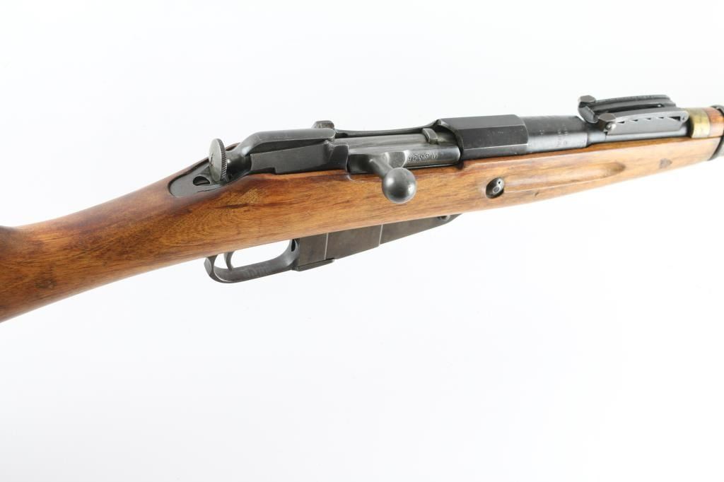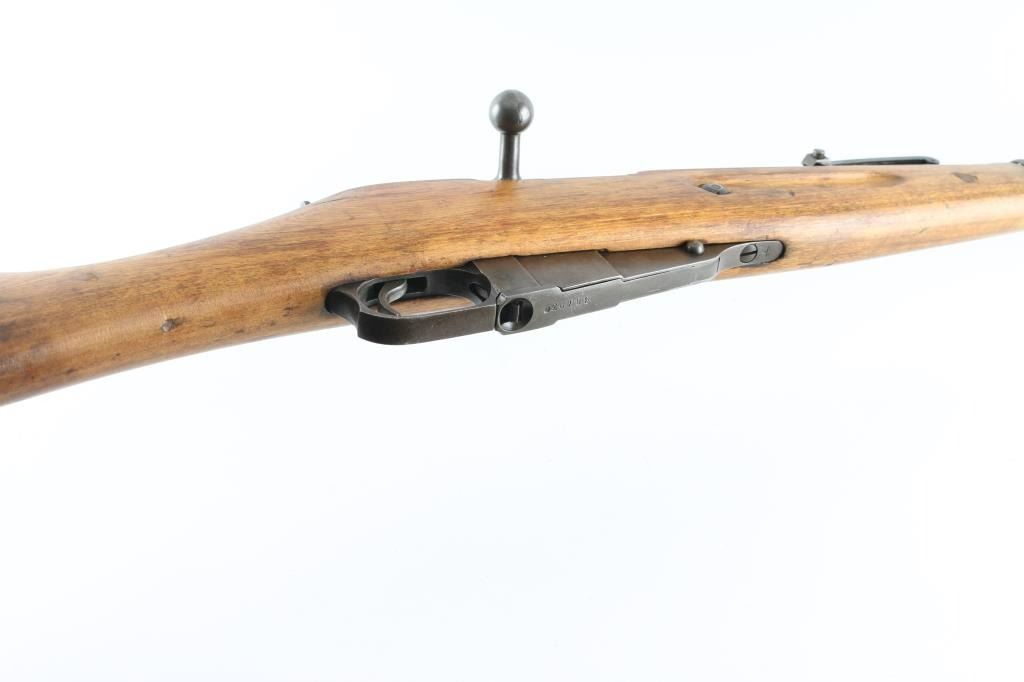 Russian (Soviet Union) bolt action military rifle dated 1927. Modified to 91/30 length. Features 29" barrel, blade front & tangent rear sights, manual safety, sling slots with wire bale adapters, hex receiver, wood straight wristed stock and handguard. Missing cleaning rod. Brass tips on handguard. Older style rear sight. Bore is good condition, some darkness and frosting, strong rifling. Retains 40% blued finish, fading and turning brown in many areas (especially bottom metal). Bare metal bolt is good condition, grayish toned with smooth texture. Wood is good condition, sanded; bands are loose and sling slot escutcheons sit proud of the wood. Numbered "88793" on bottom metal and buttplate, bolt mismatched. Many bow & arrow stamps on small parts. Condition is NRA Good *** C&R Firearm ***