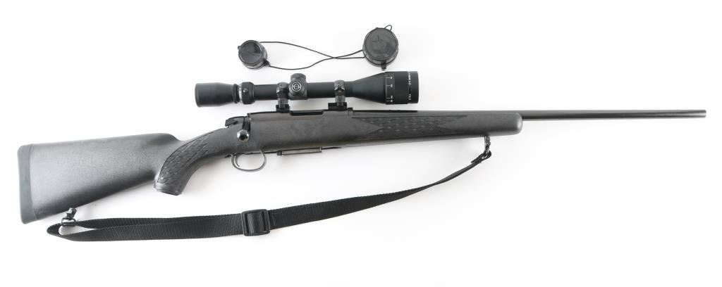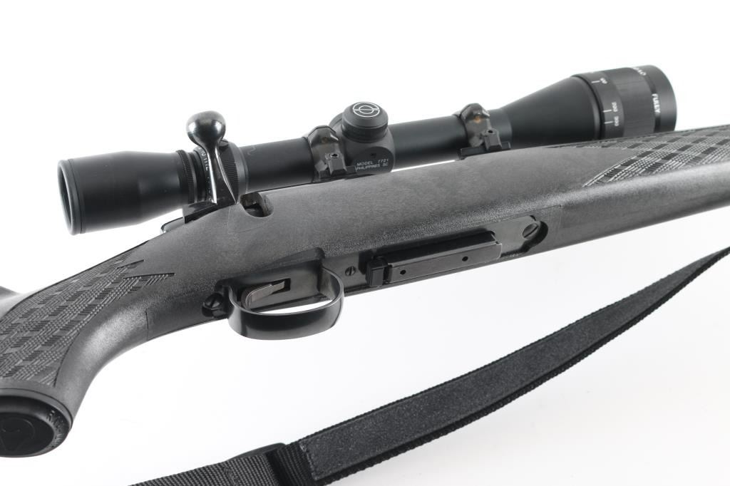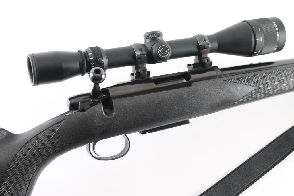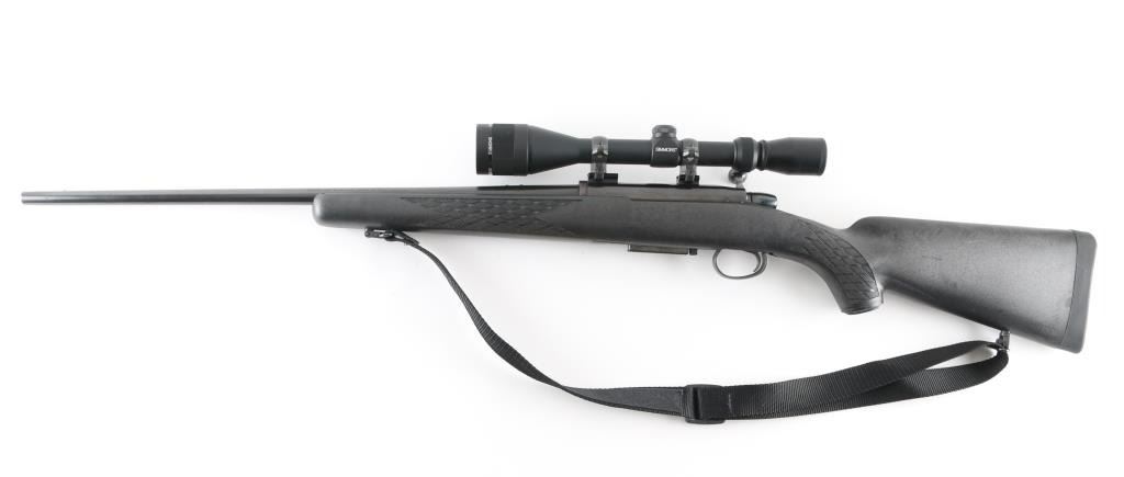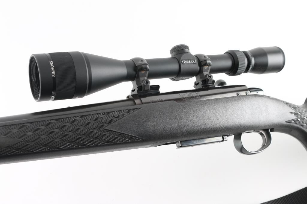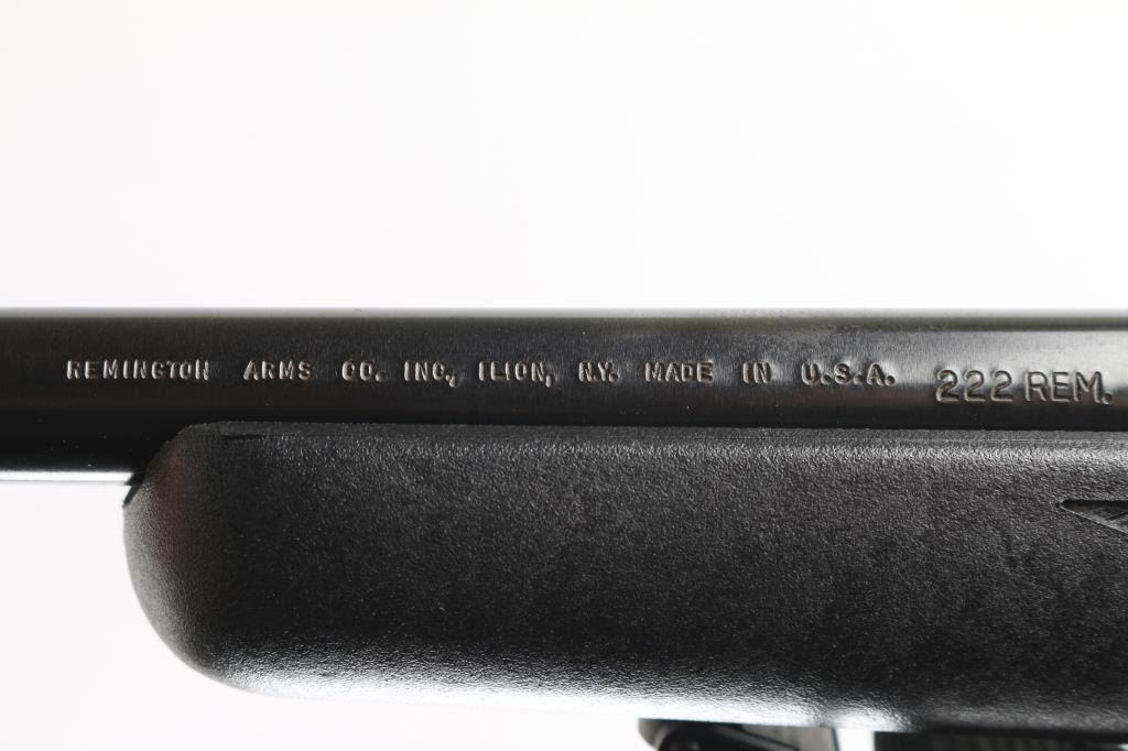 Economic push feed bolt action sporting rifle chambered in .222 Remington, manufactured circa 1969. The model 788 debuted in 1967 and was marketed as an inexpensive yet accurate hunting rifle. Now discontinued, these have developed a loyal following. Features a blued finish, 24" tapered barrel (drilled & tapped for sights), smooth trigger with beveled edges, stamped steel trigger guard, manual two-position safety on the right side of the receiver, blued bolt with rear locking lugs, 3 round detachable magazine, black Ramline polymer sporter stock with molded checkering panels, solid rubber recoil pad, sling studs. Two piece Weaver bases with rings mount a Simmons 6-18x40mm scope with adjustable objective lens. Bolt easily detaches from the bolt body. Magazine missing follower. Bore is very good. Retains 85% finish with scuffs, edge losses. Stock is very good. Scope is very good, clear view. Includes black nylon sling. Condition is NRA Poor - Needs Repair *** C&R Firearm ***