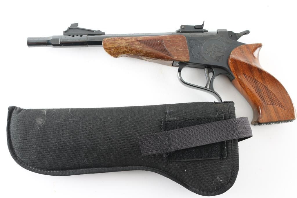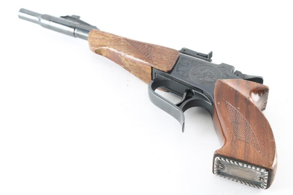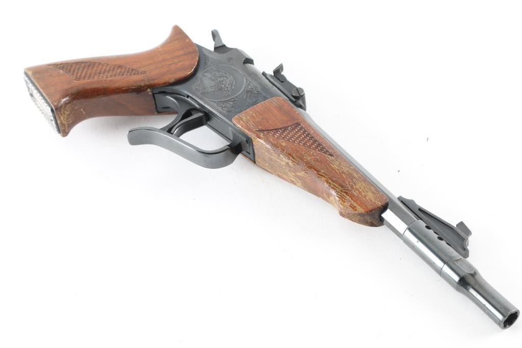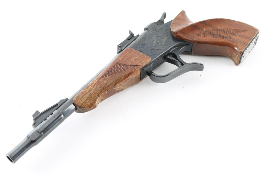 Very Early Production. Modular break-action single shot pistol chambered for 45 Colt or 410 bore shotshells. Manufactured circa 1969. Features a blued finish, 8.5" barrel (10" including the installed muzzle brake / straight rifled choke), blade front & adjustable rear sights installed, serrated trigger, engraved cougar scene on the receiver, serrated hammer is for centerfire only (no firing pin selector), checkered walnut forend and target style pistol grip with rectangular metal butt cap (has the look of silver, with decorative border). Bore is very good condition. Retains 90% finish with handling marks. Wood is good to very good, solid condition with some loss of varnished finish. Includes a good condition black nylon holster. Condition is NRA Very Good++ *** Modern Firearm ***
