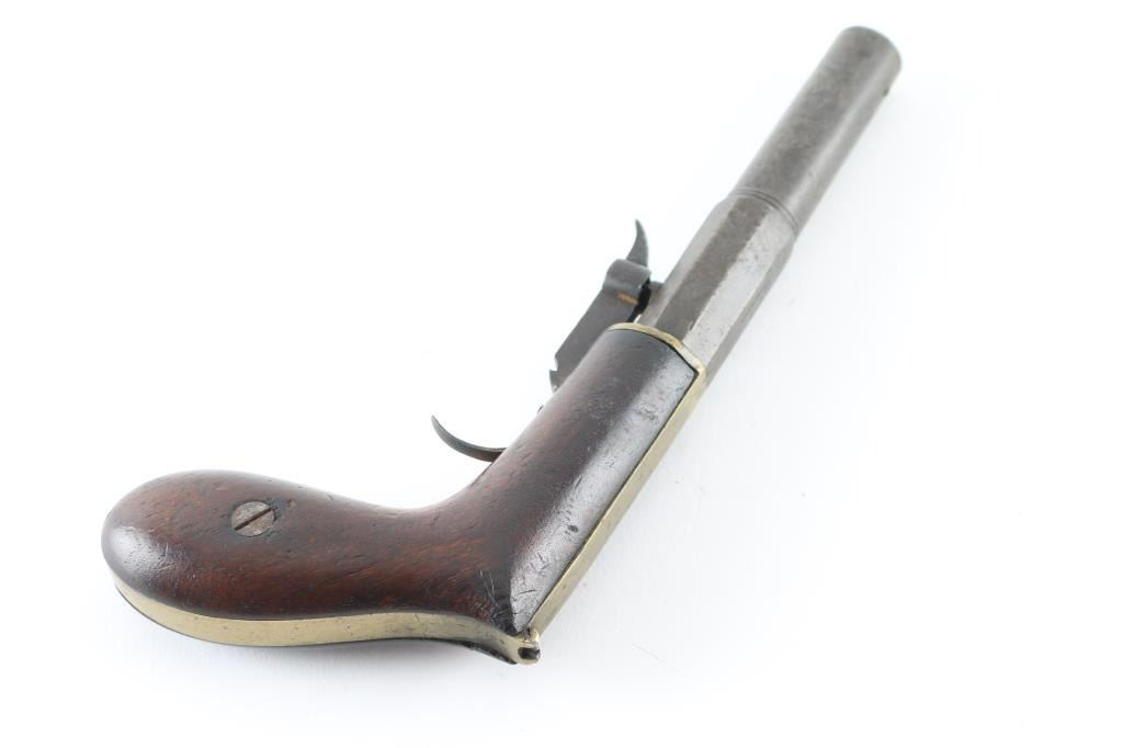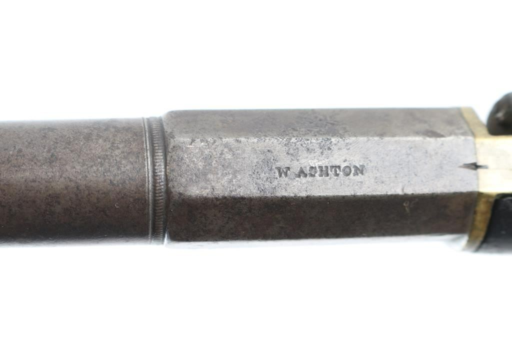 Single-shot, percussion, underhammer, boot pistol 4" round to octagonal barrel marked W. Ashton. (William Ashton of Middleton, Ct.) circa 1850. .32 cal. rifled bore. Brass frame, walnut bag grips. Used by both sides during the Civil War as a private purchase back-up pistol. Bore is dark with rifling present. Grips are very good, right grip is loose, barrel has turned a gray patina, mechanically functional. NRA Condition-Very Good. Antique firearm.