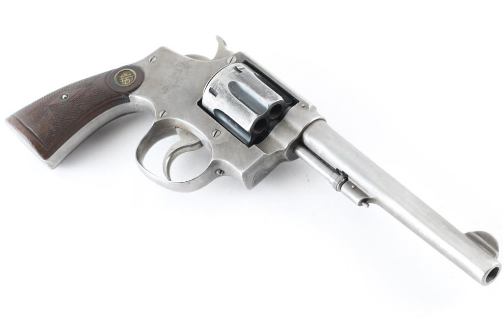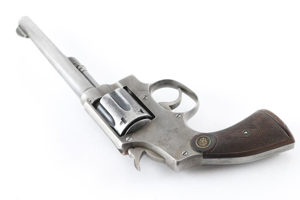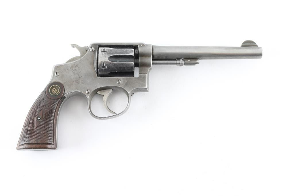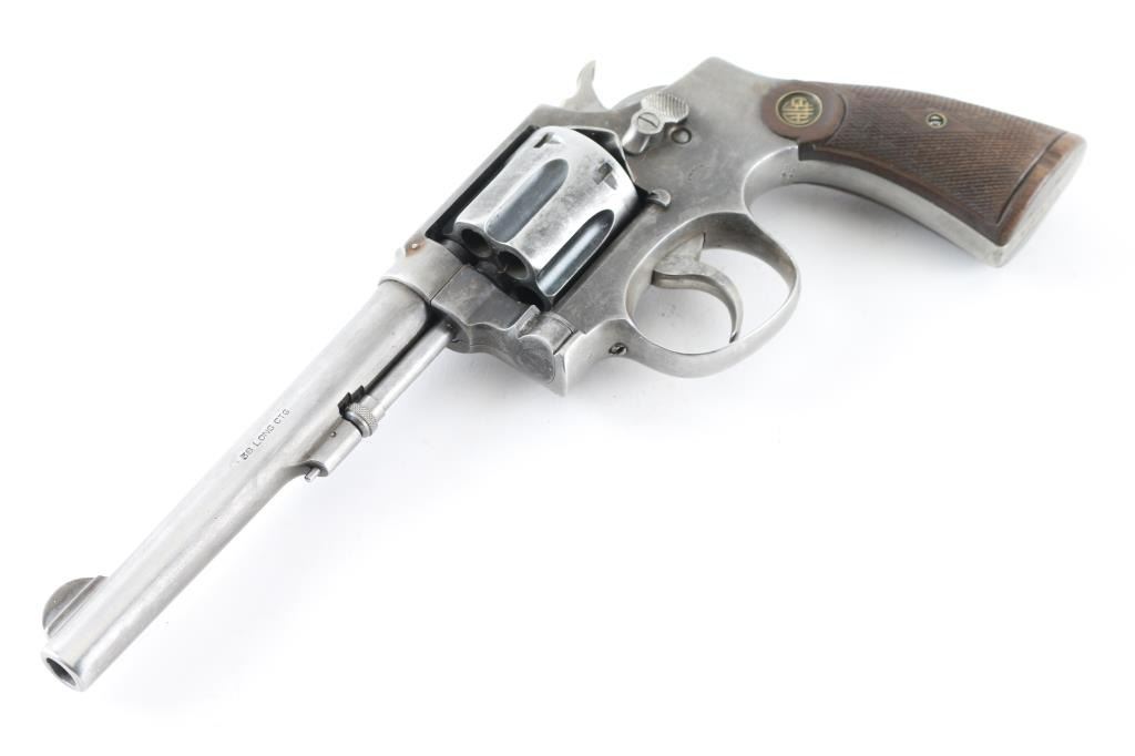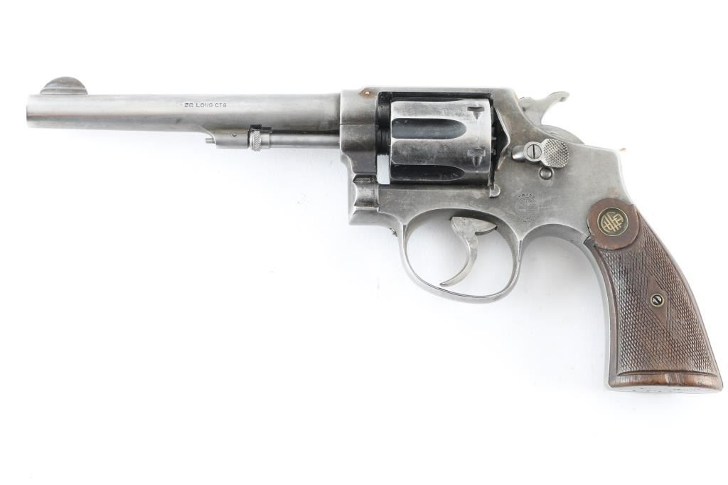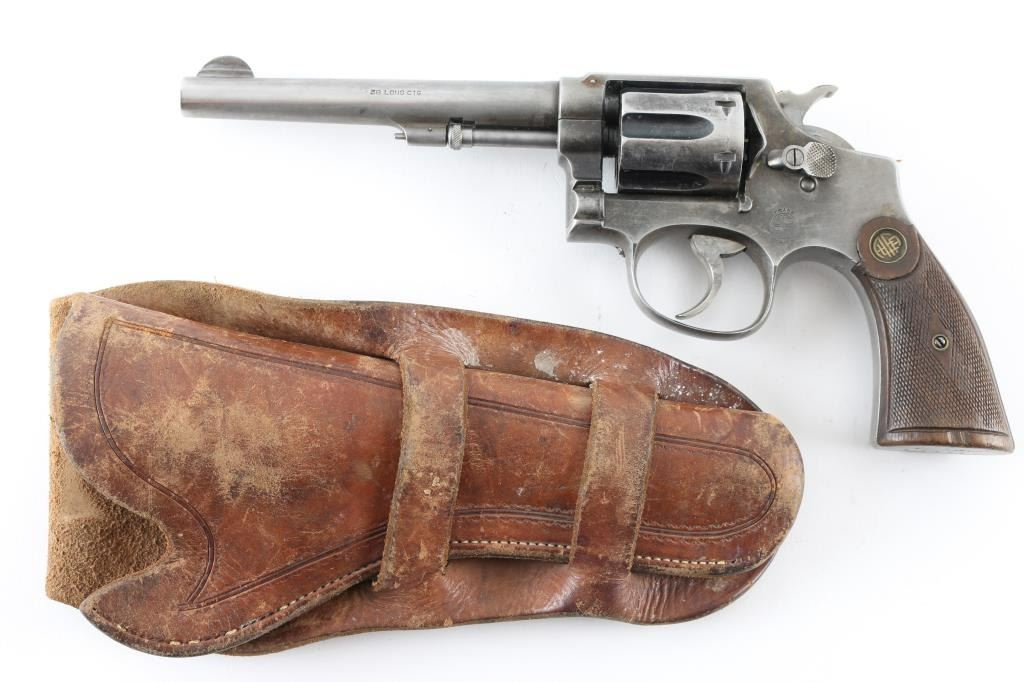 Spanish copy of the Smith and Wesson M&P .38 Special DA Revolver with a 6" barrel marked "American Cartridges are Those Who Fit Best Alfa Revolvers" in English. NRA good to very good with traces of blue and tight action with good bore. Minor chips on the grip. Original to the same period double loop western holster. NRA Good Condition Modern Firearm