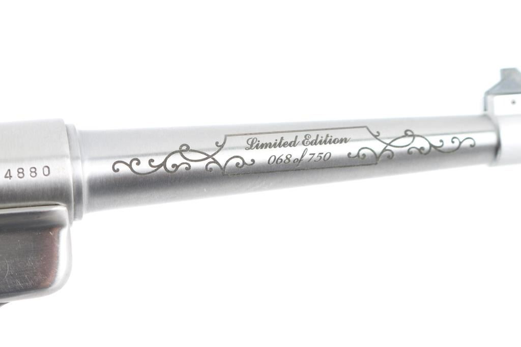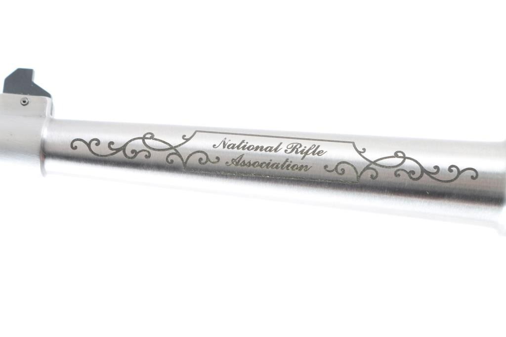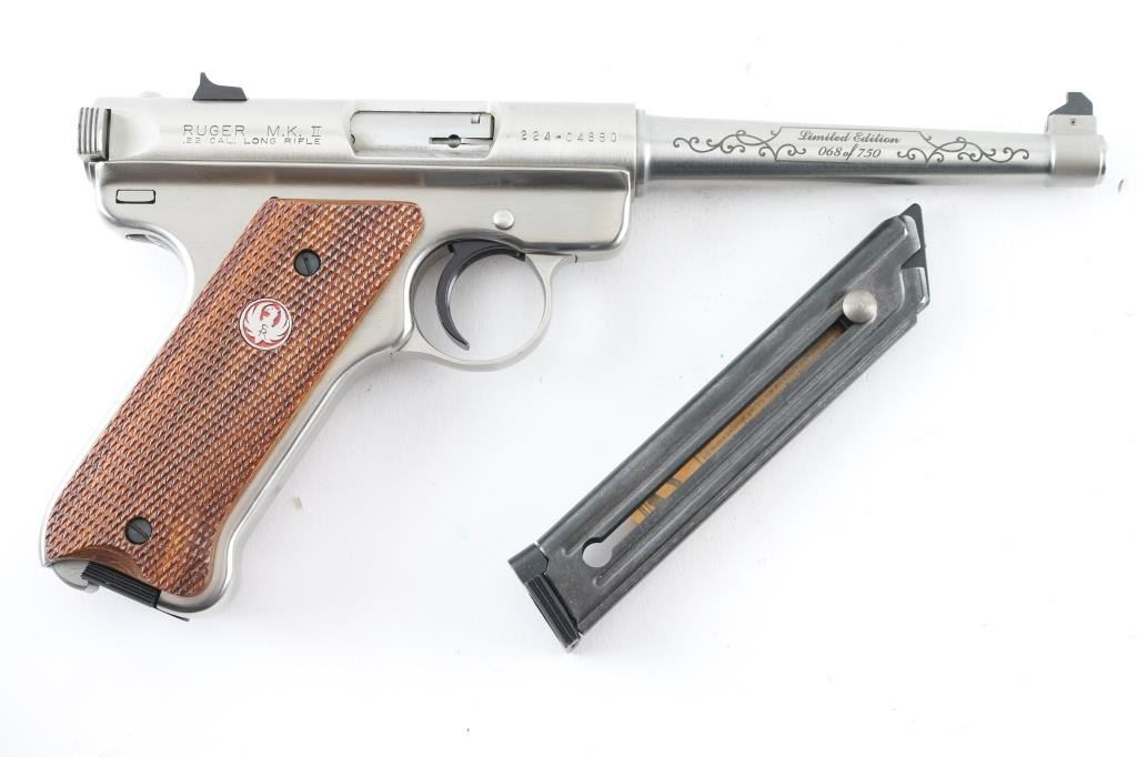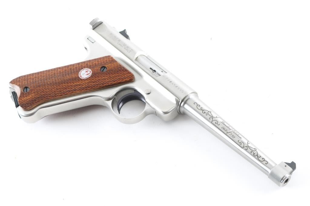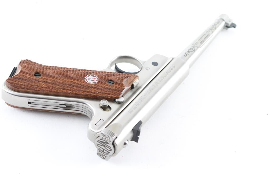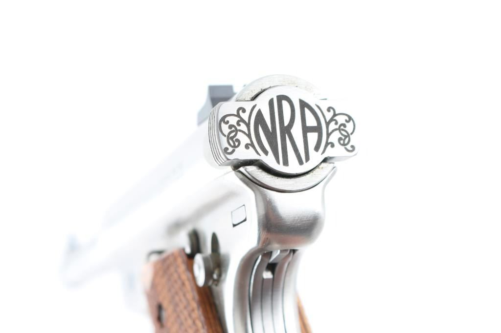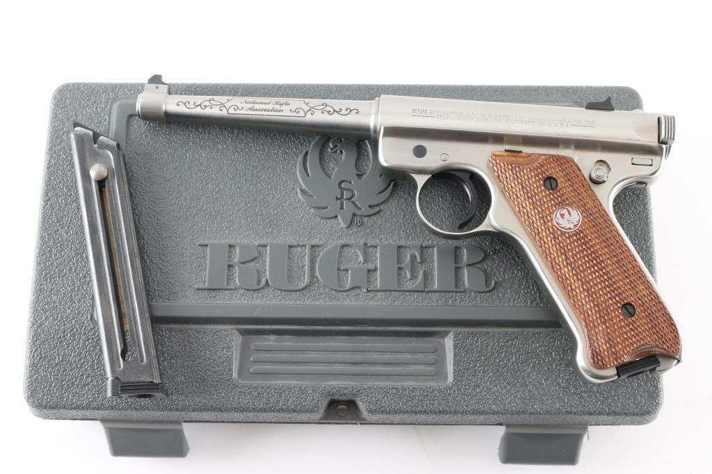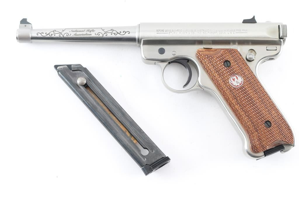 'National Rifle Association Limited Edition' Semiautomatic rimfire pistol features stainless steel construction, checkered wood grips with red/silver Ruger medallions, 6" tapered barrel, fixed front & dovetailed rear sights, heel magazine release, frame mounted manual safety, slide stop lever. Engraved on left side of barrel "National Rifle Association", on right side "Limited Edition 068 of 750", both in cursive script bordered & surrounded by limited cursive scrolls. Condition is like new with few signs of handling. Includes factory plastic box, spare magazine (2 total), manual. Condition is NRA Excellent - like new *** Modern Firearm ***