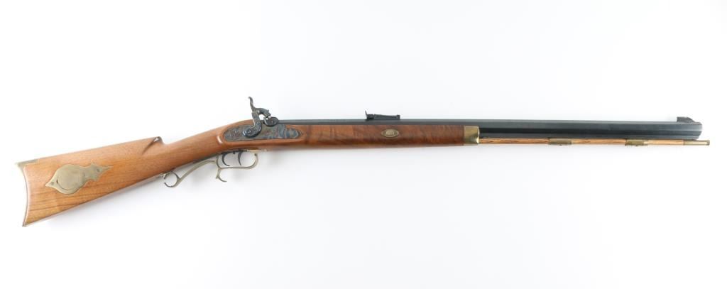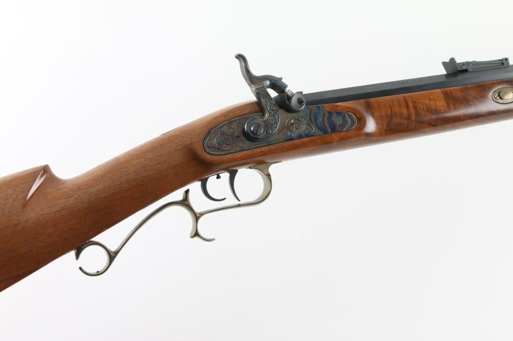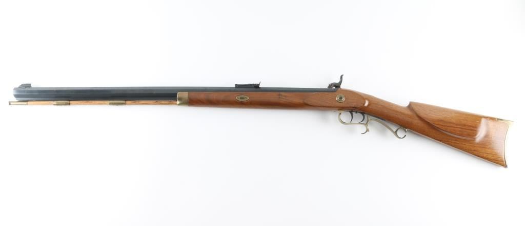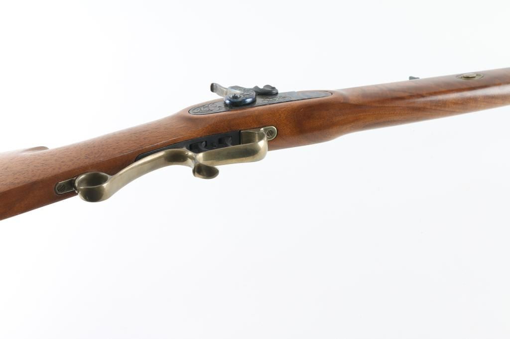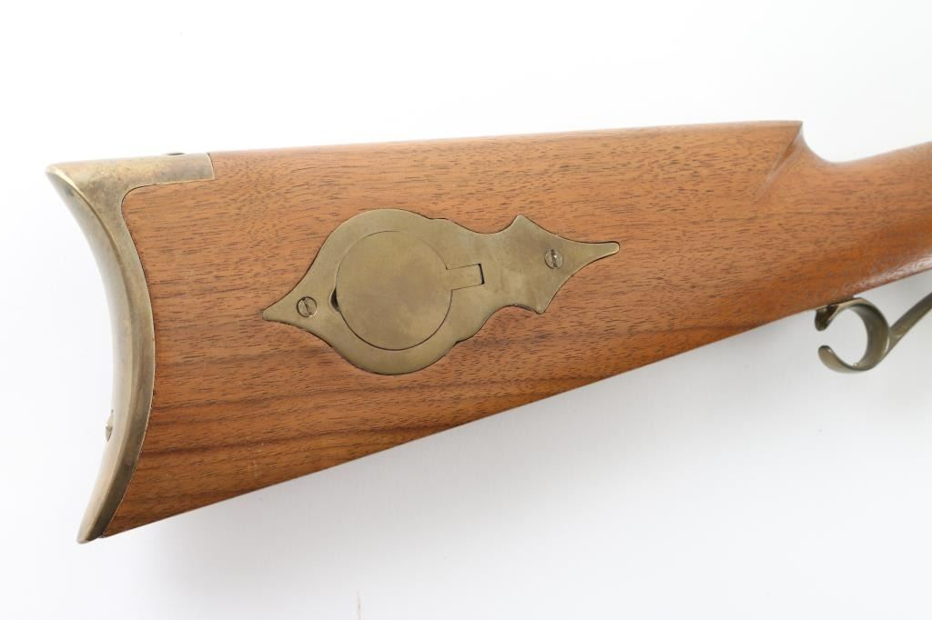 Single shot muzzle loading percussion plains rifle uses Black Powder (or Pyrodex or similar powder) only. Features blued 29" octagon barrel, blade front & adjustable rear sights, wood ramrod under barrel, half stock with brass fittings, crescent buttplate, patch box, double set triggers, case colored lock. Rifle appears unfired, in like new condition with few handling marks, some small chips missing from stock at toe. Condition is near NRA Excellent *** Antique Firearm ***