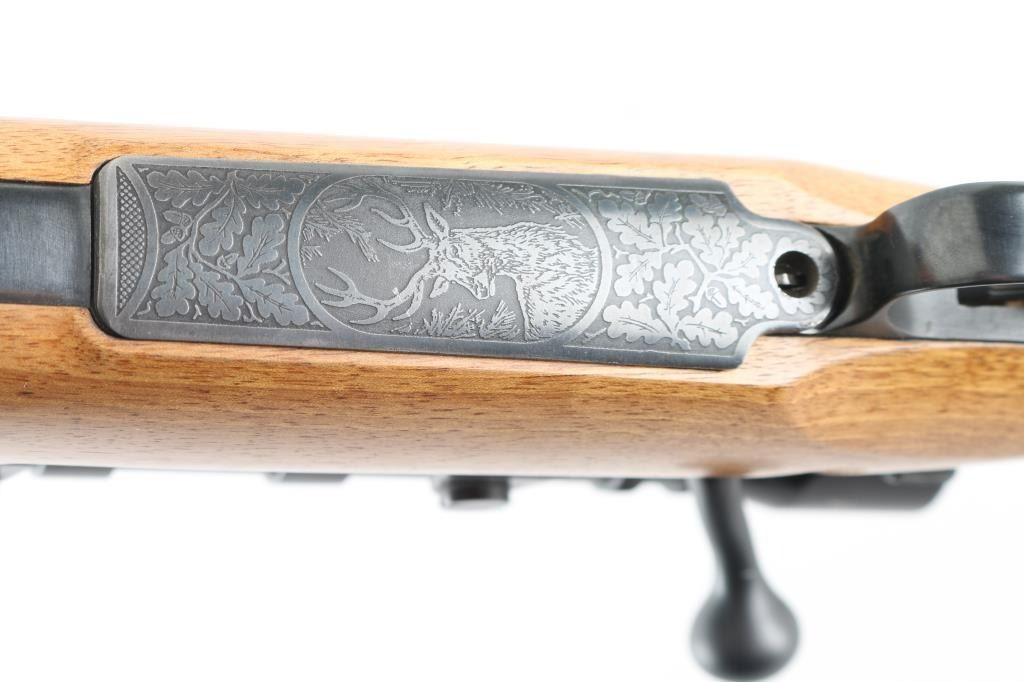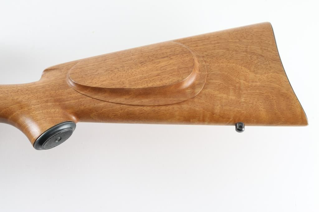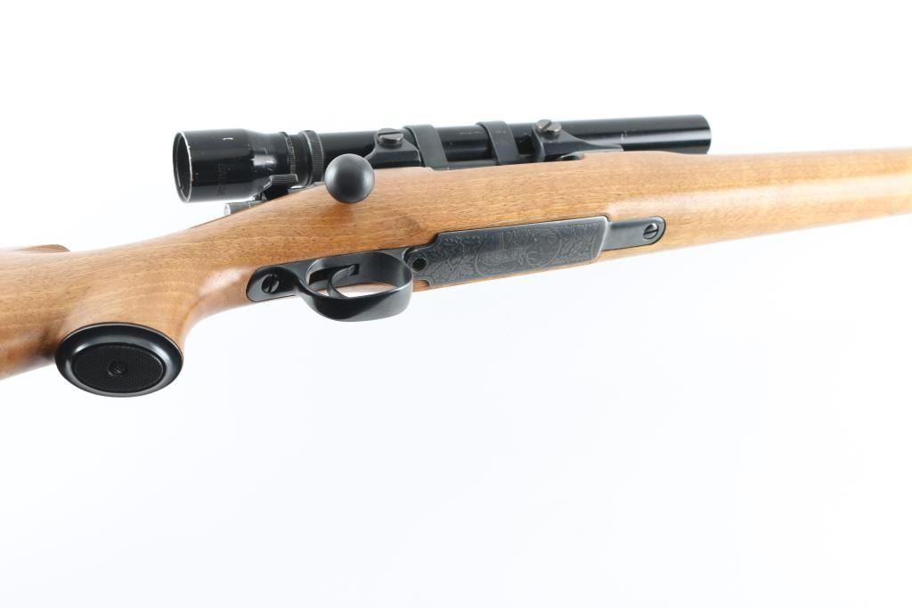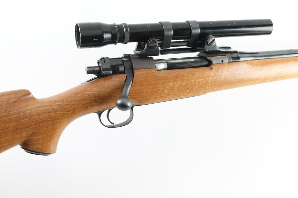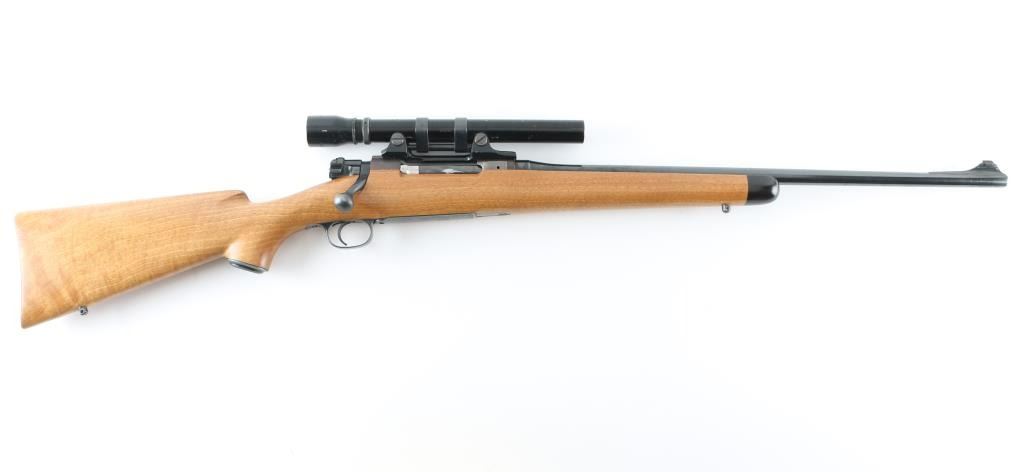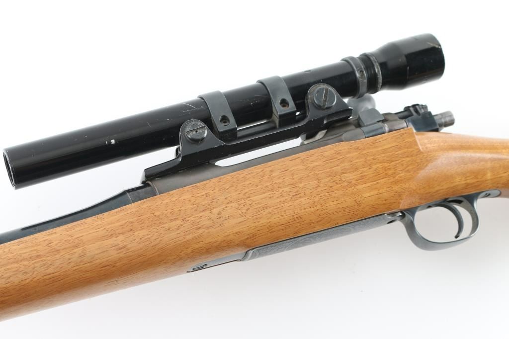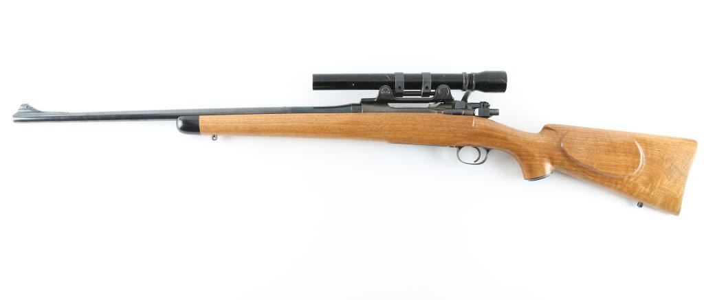 ***Needs Chambering Verified by Gunsmith*** Bolt action military rifle has been sporterized. Features blued finish, light colored smooth wood stock appears to be Myrtle wood or a dark maple, darker forend tip appears to be mahogany with some lighter color streaks, 22" barrel, blade front sight dovetailed into a raised ramp, drilled & tapped mid-barrel for a rear sight (not present), low swing two position safety, checkered steel Niedner type buttplate, checkered steel grip cap, right hand cheek piece with shadow line, sling studs, low power vintage Bausch & Lomb "BALVAR" scope with fine crosshairs (appears about 2.5x). Scope mount and scope are designed so that adjustments are made to the mount, the scope does not appear to have any windage or elevation adjustments. Floorplate is relief engraved with a buck or stag's head in an oval, surrounded by oak leaves. Cocking piece has been turned down to a plain cylinder at rear. Sides of bolt shroud have been reshaped. Bolt handle swept back slightly. Approx 13.5" LOP. Bore is good condition, dirty, should improve with a good cleaning. Retains 85% blued finish, with the receiver showing a slightly plum coloration and a thin appearance to the finish. Stock is very good, some slight dents, 13.5" LOP. Chambering a military 7x57 cartridge with a longer bullet will result in the bullet sticking in the rifling when extraction is attempted. Needs gunsmith chamber check, likely has a short throat area for lighter bullets. Condition is NRA Very Good (needs chamber verified) *** C&R Firearm ***