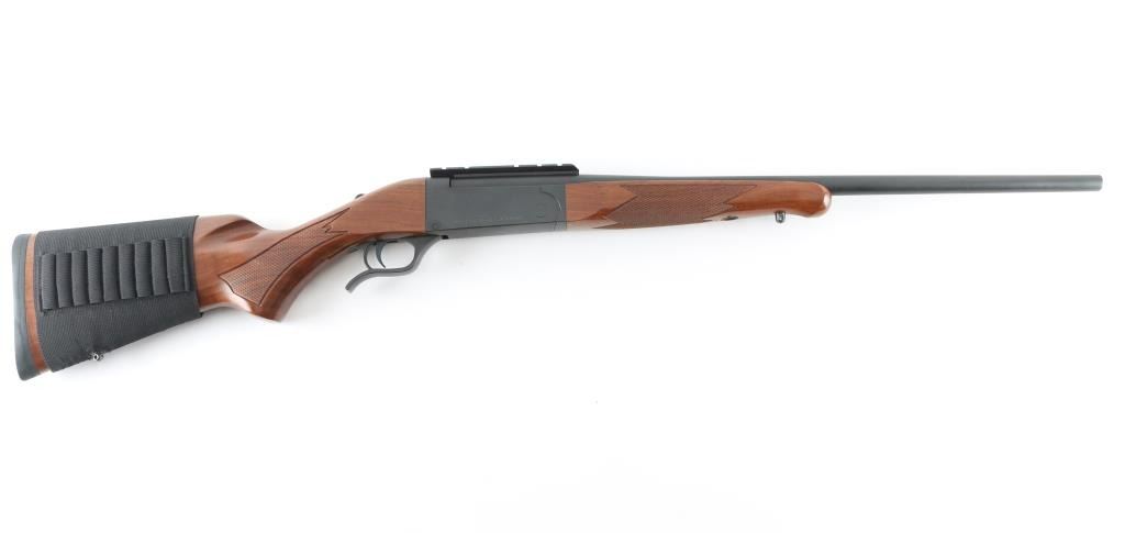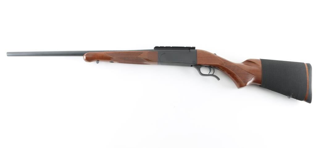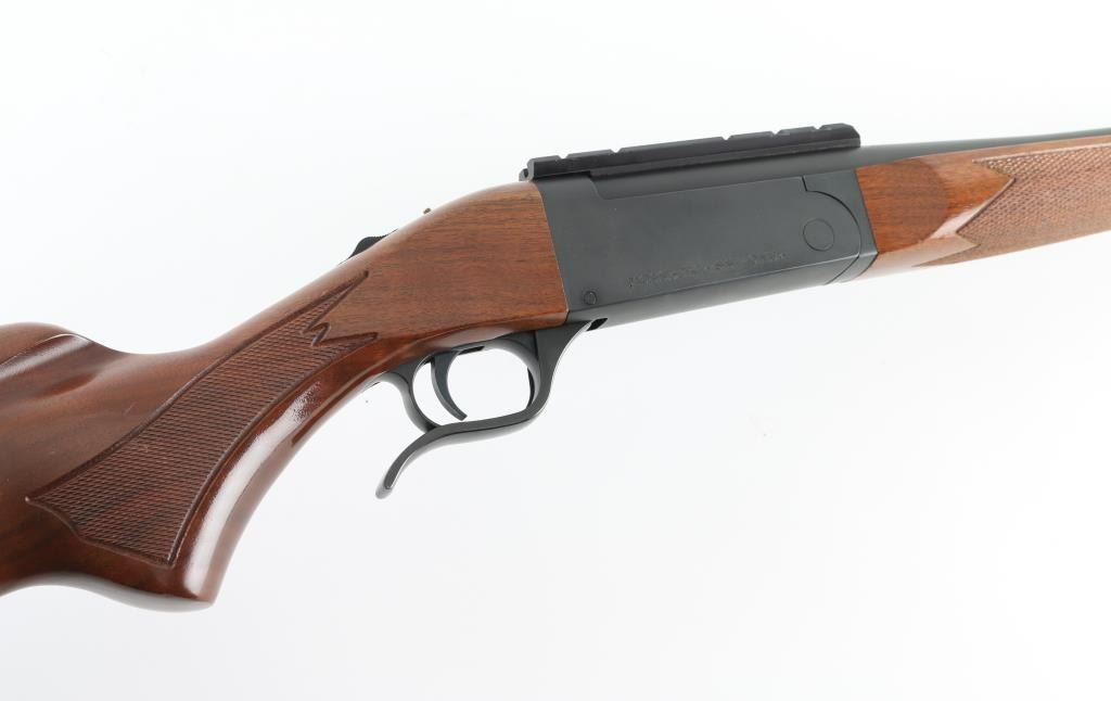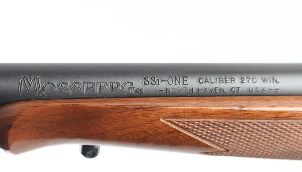 SSi-One - short for "single-shot interchangeable offers users the opportunity to swap barrels to different calibers and even a 12 gauge barrel was available. The barrels each came with its own walnut forend. These gun are no longer in production. This one is a single-shot, lever-opening, break action design with a 24" barrel with a recessed crown chambered for .270 WIN. It features a matte metal finish, walnut stock checkered at the wrist and on the schnabel forend. It sports swivel studs, a top tang safety, cocking indicator, rubber Mossberg recoil pad and scope base, there are no provisions for sights. The metal finish looks great. Wood stocks look very good with minor signs of handling. The bore looks pristine, very bright. Gun looks near new. Comes with a sleeve for the butt stock that holds 9 cartridges. Condition is NRA Excellent *Modern Firearm*