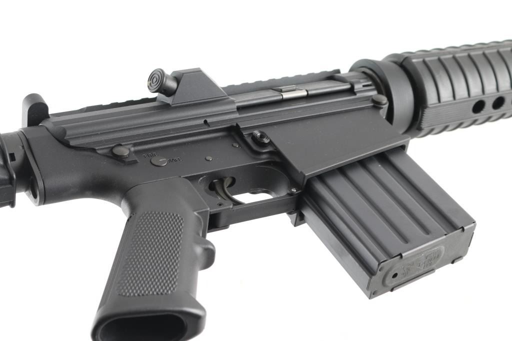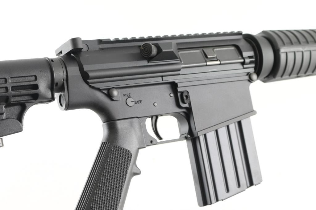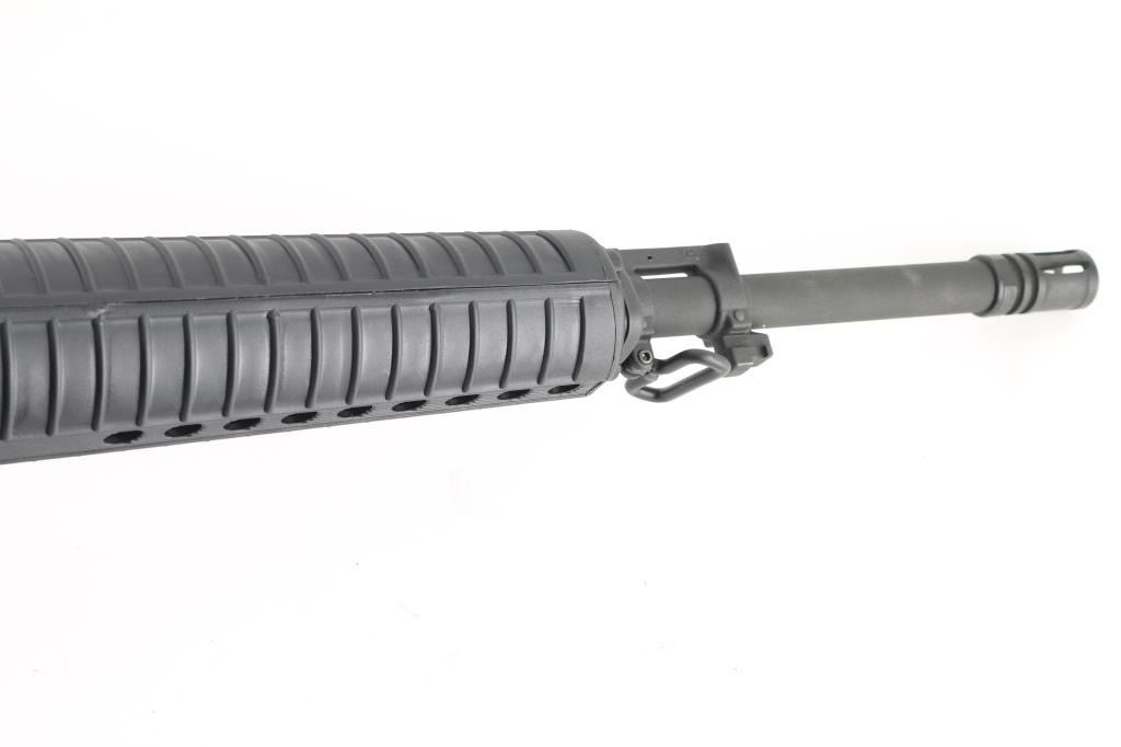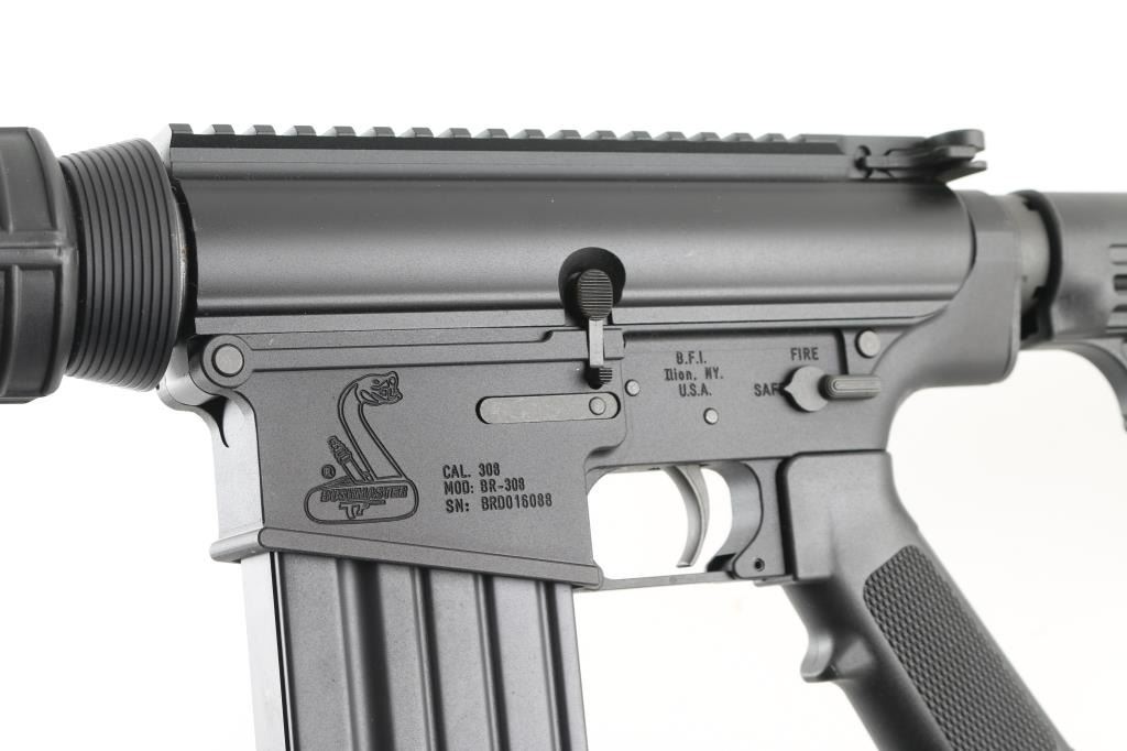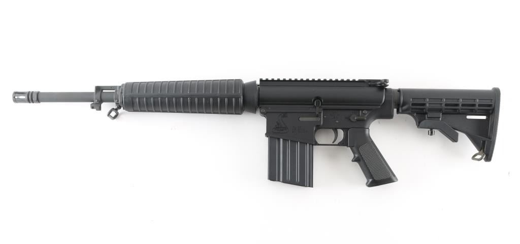 AR-15 type semiautomatic rifle,. Features matte black finish, polymer furniture, collapsing stock, 16" barrel, A2 flash hider, bayonet lug, forward assist, spring loaded ejection port cover, shell deflector, Picatinny rail section attached to receiver top, Round handguards. B.F.I. marked barrel, and receiver. Bore is excellent/bright. Overall condition is new. Weights 7.80 pounds. No Magazine. NRA Condition-Excellent, Modern Firearm.