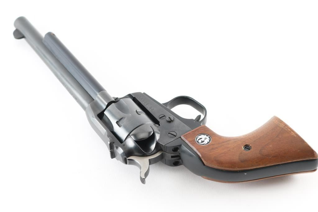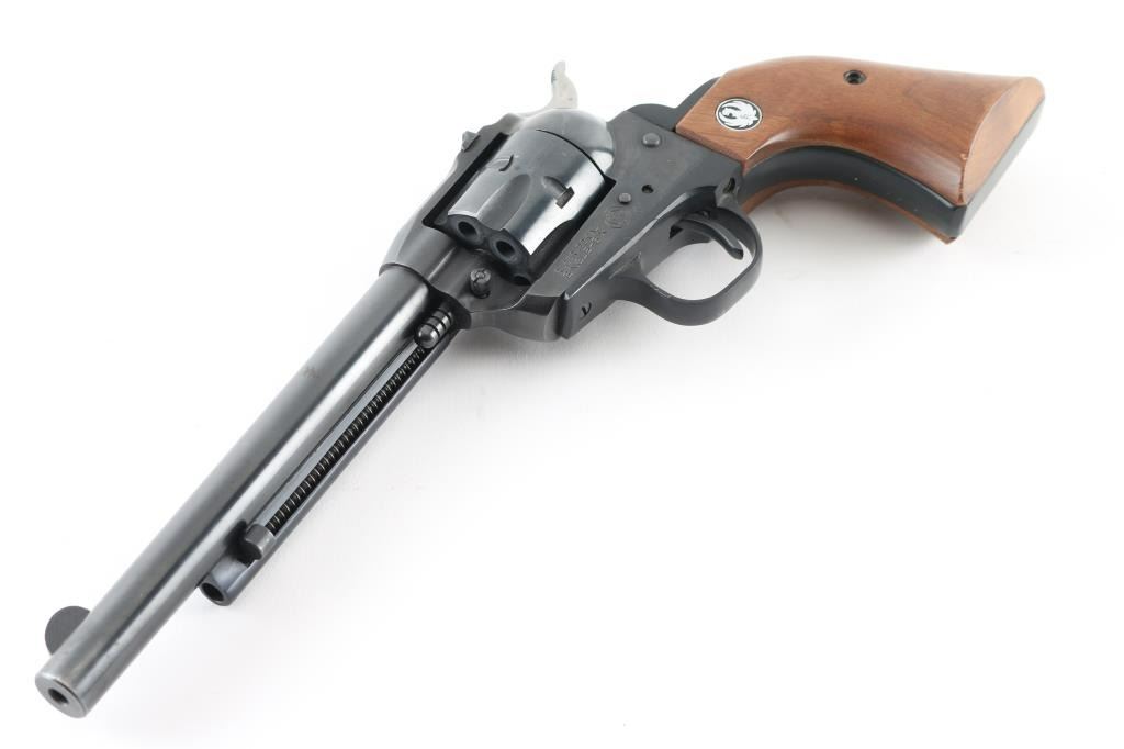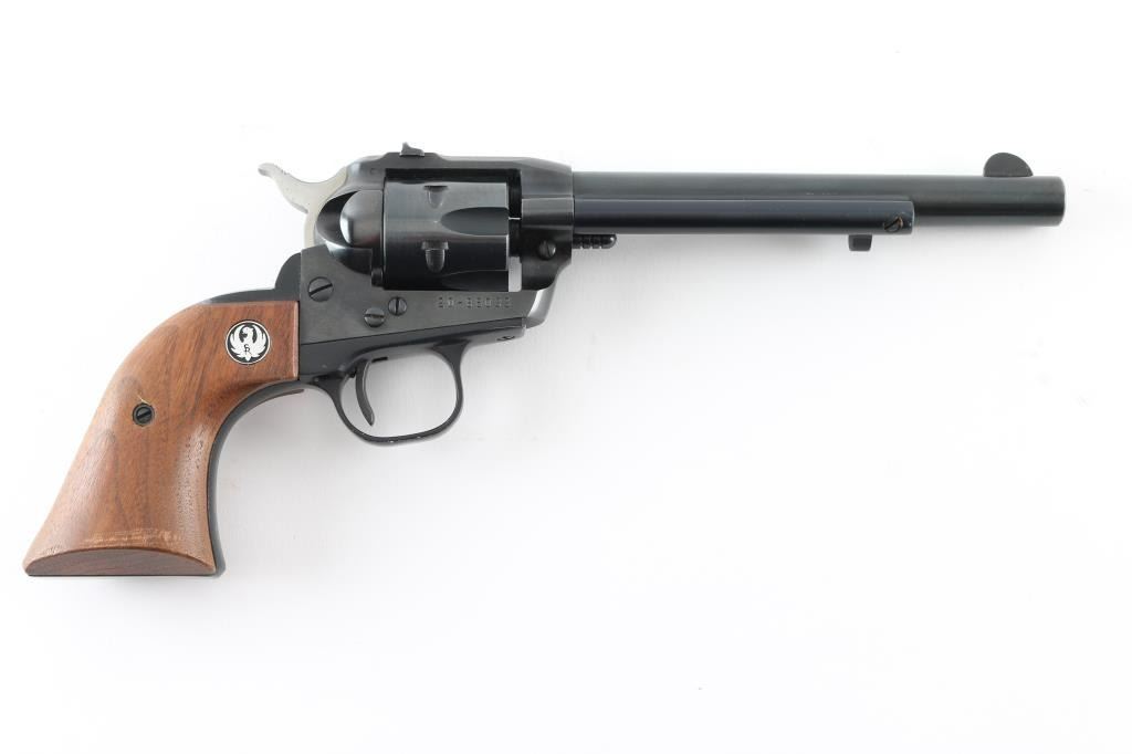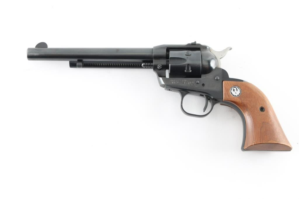 American made single action, 6 shot revolver chambered for .22 LR circa 1971. It has a 6.5" blued barrel with matching frame, fixed blade front sight, dovetailed rear sight and serrated hammer spur. The two piece smooth wood grips have Ruger medallions on both. Metal finish looks good with minor loss at muzzle on the left side, a tiny ding on the backstrap and a spot of surface rust on the left of the barrel about 4.25" from the muzzle (should clean right up). Wood grips are fine with a scuffed line toward the bottom of the right side grip. Bore looks good, needs cleaned. Condition is NRA Very Good *C&R Firearm*