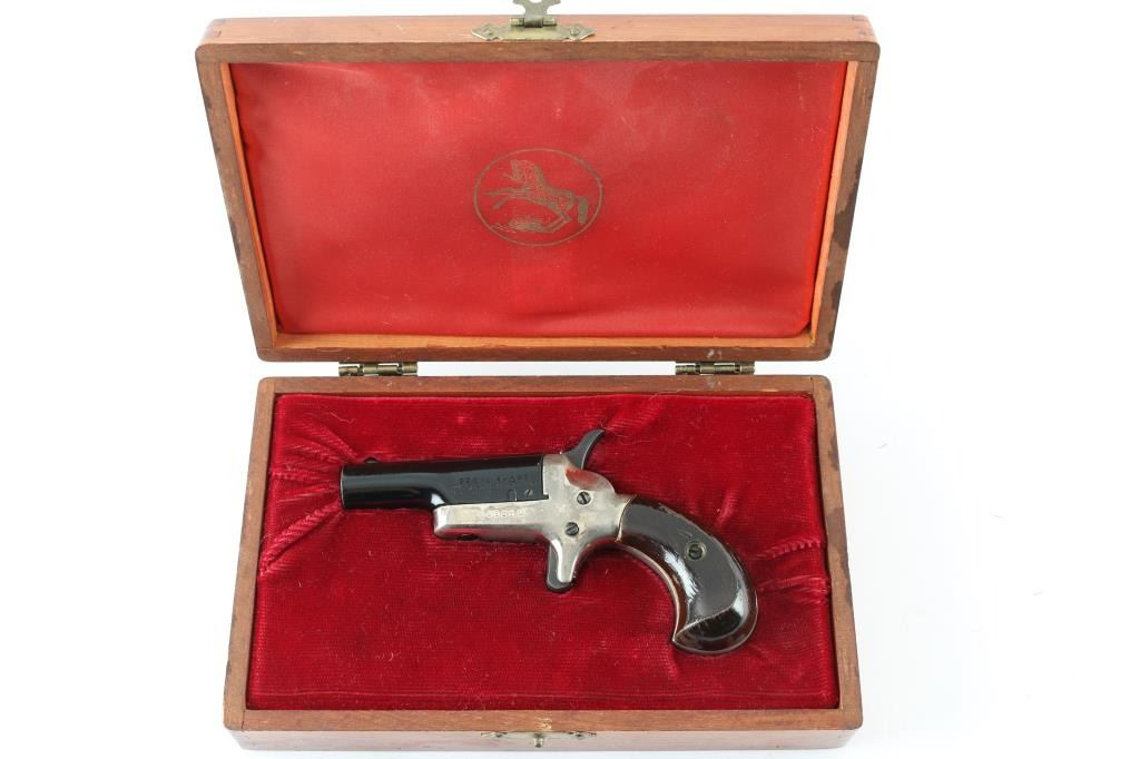 1960's era derringer in presentation display case. Finish is oxidizing and shows handling over almost 60 years. NRA Fair Modern Firearm