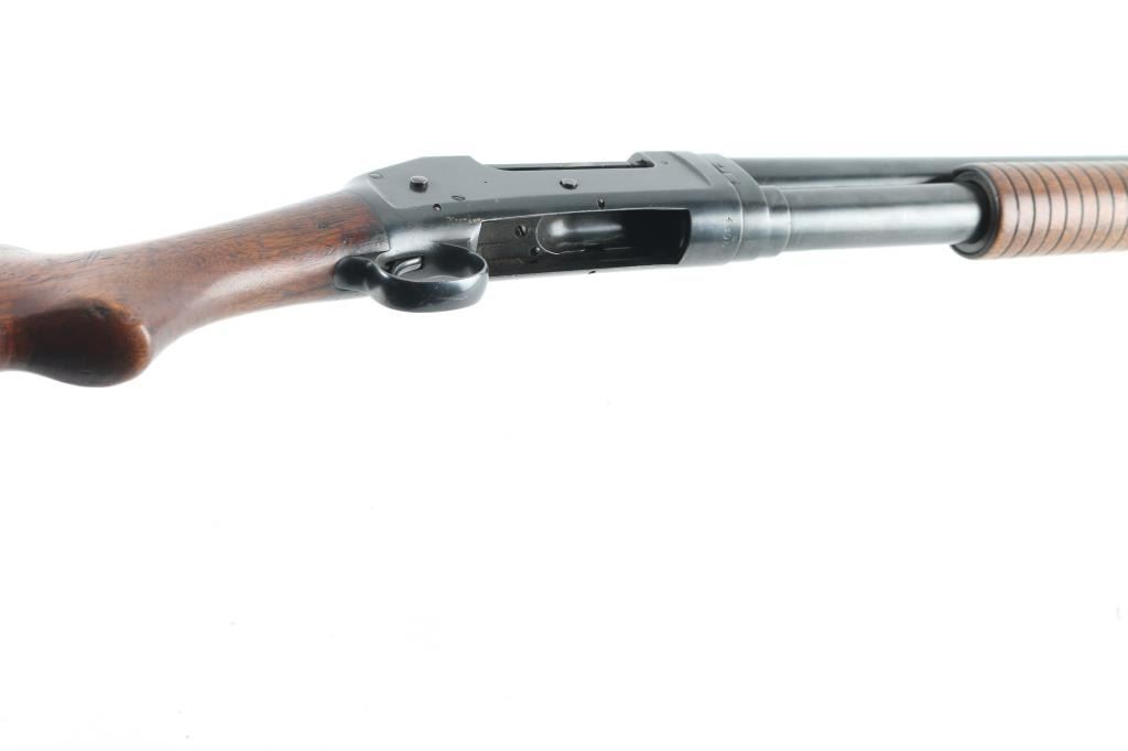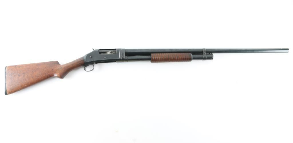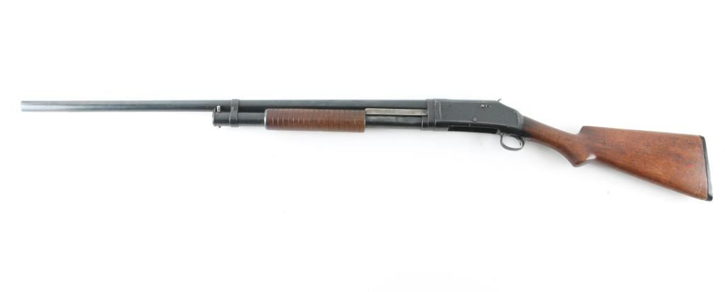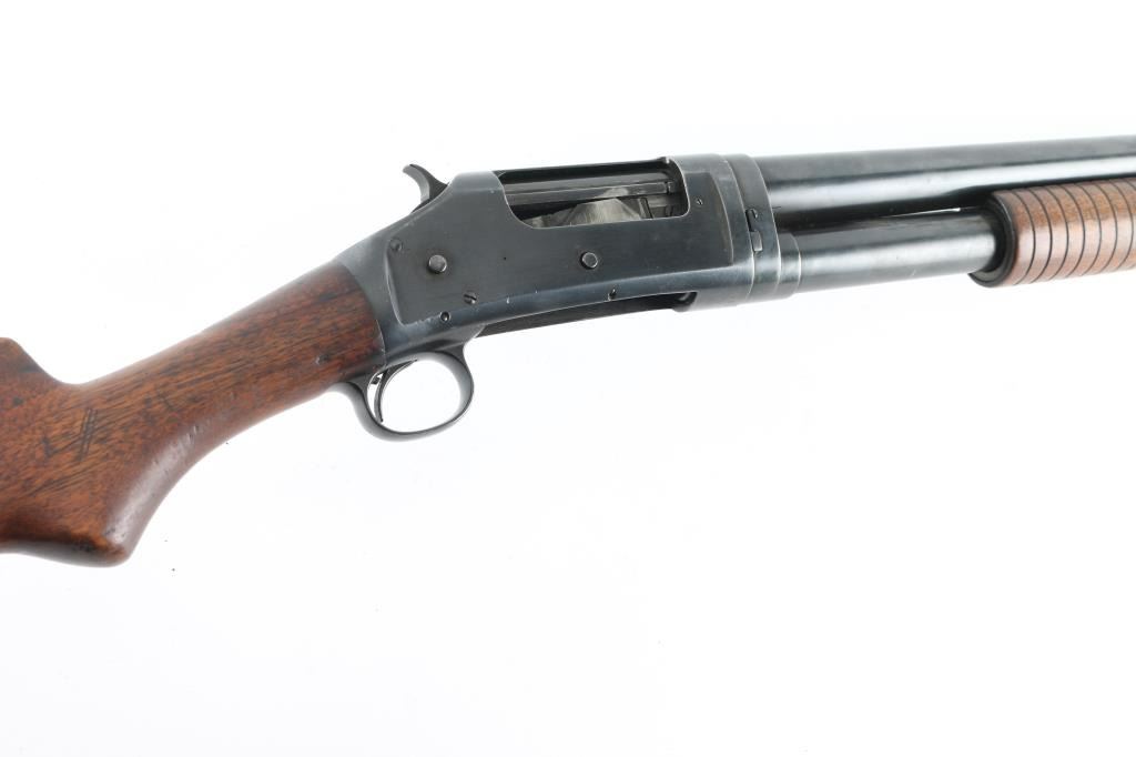 Take down pump action shotgun manufactured circa 1911. Fed from a 5-rd tube magazine. Features 30" plain barrel, FULL choke, brass front bead, re-blued finish, smooth wood semi-pistol grip stock & grooved pump handle, plastic buttplate, exposed hammer. Numbers match on receiver and barrel extension. Winchester markings on barrel, and slide bar are clear. Bore is very good condition. Retains 85% re-finish, showing edge losses & scratches, rubbing wear. Action is a little stiff, needs oil. Wood is very good, there is a couple of flecks of red paint on the buttstock, should clean off. NRA Condition-Very good as re-finished. C&R Firearm.