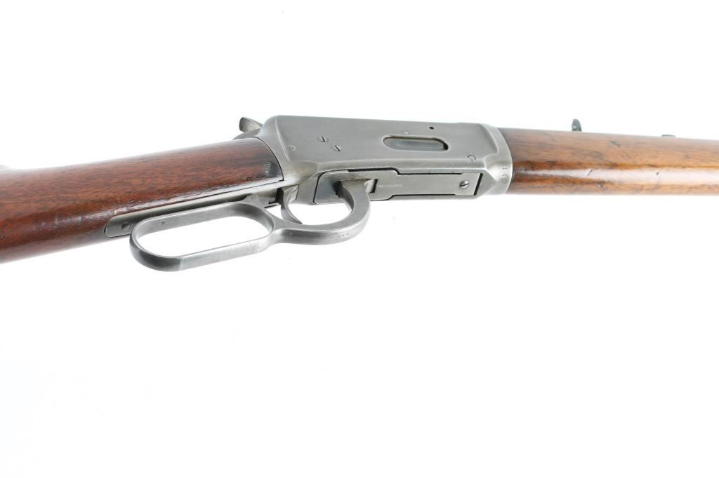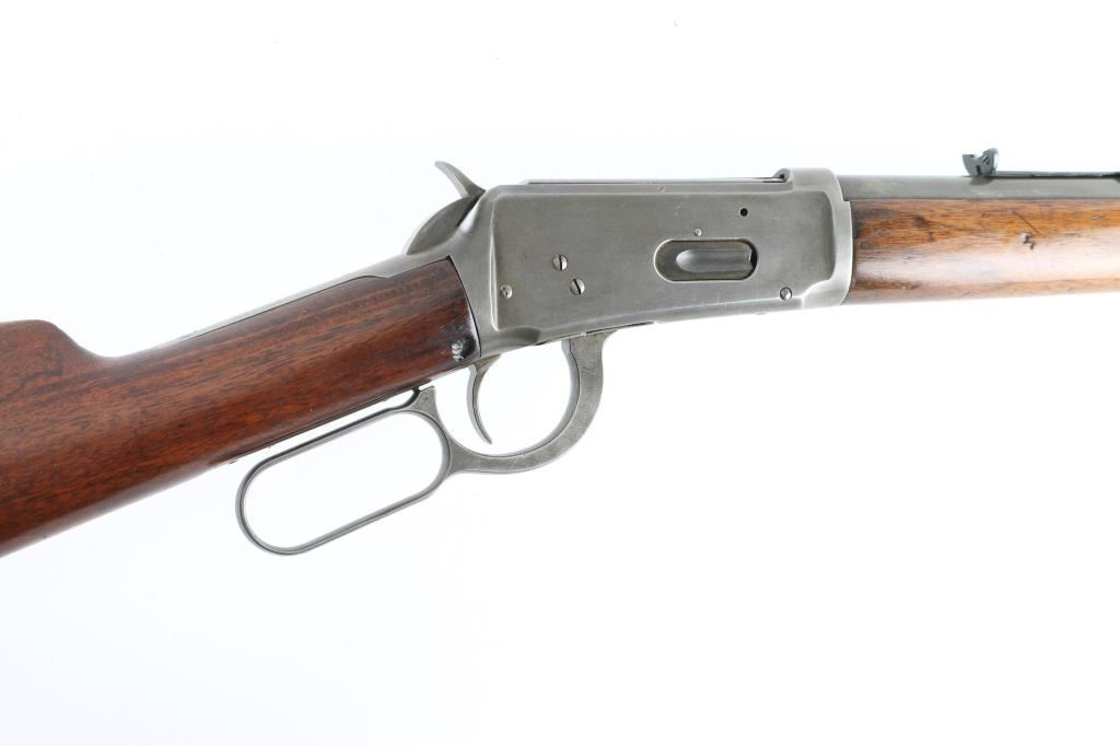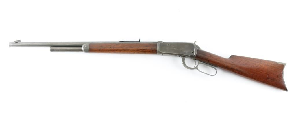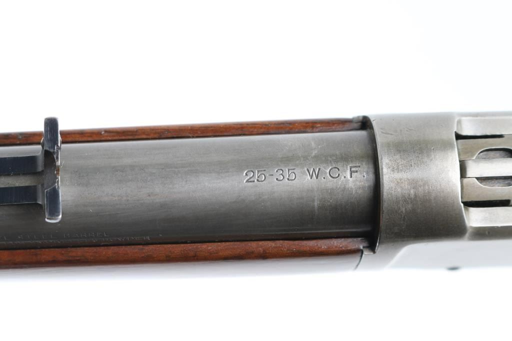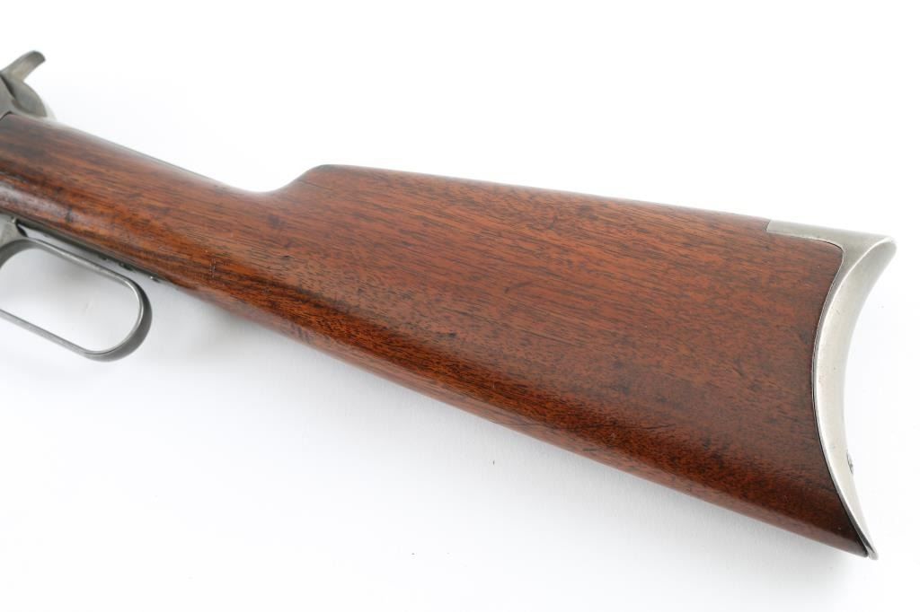 Lever action rifle manufactured circa 1898. Features 22" round Winchester marked barrel, 2/3 length magazine tube, dovetailed blade front sight, sporting rear sight (new replacement - missing elevator slider), smooth walnut stocks, forend with steel nose cap, straight gripped butt stock, steel crescent buttplate. Bore is good condition, frosted with dark grooves, strong rifling, visible ring. Metal surface show nearly full coverage of a dull brownish gray color, a bit darker in protected areas and on left side of receiver, some slight mottling, mostly fairly even in color. Stocks are good condition, sanded and varnished with deeper dents retained under re-finish. Slight wood shrinkage noted at receiver tang, buttplate, toe. Condition is NRA Very Good *** Antique Firearm ***